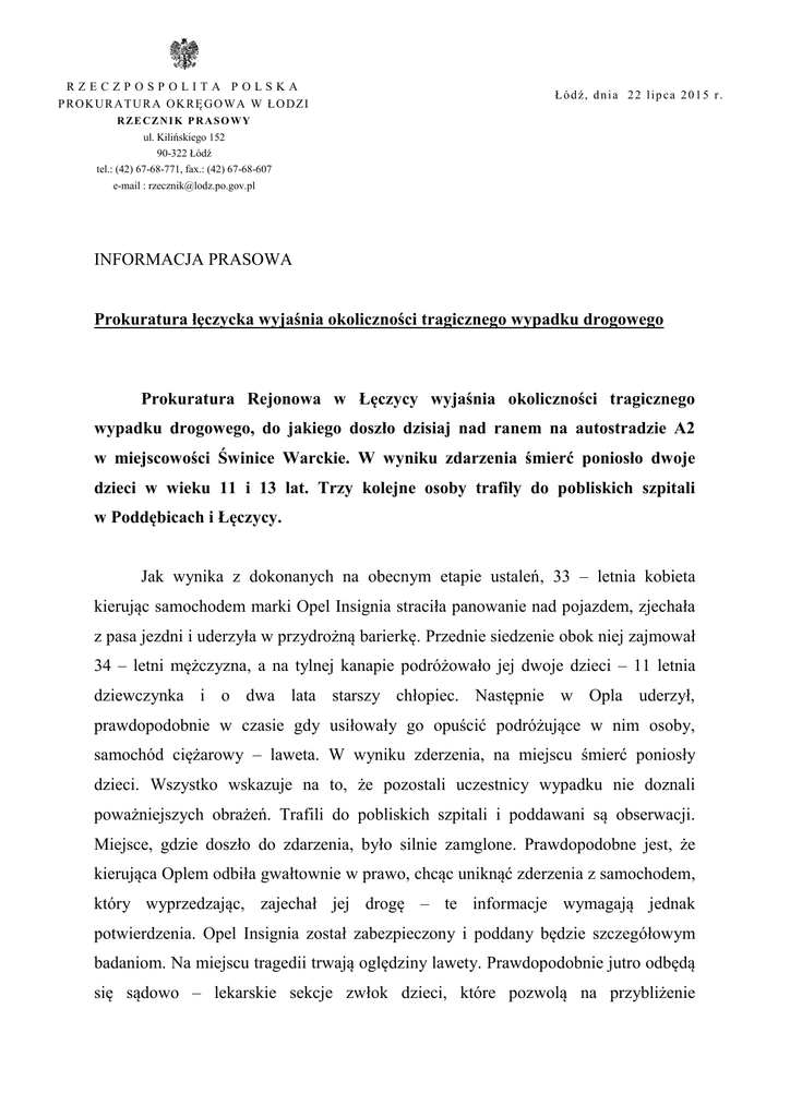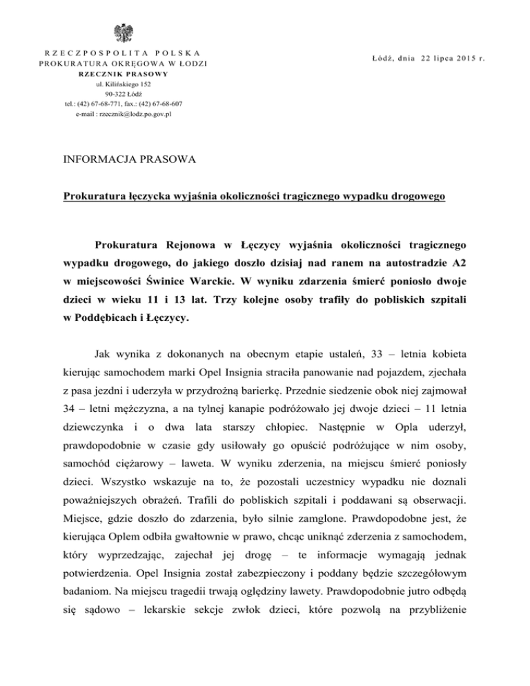RZECZPOSPOLITA POLSKA PROKURATURA OKRĘGOWA W ŁODZI Łódź, dnia 22 lipca 2015 r. RZE CZNIK P RASOWY ul. Kilińskiego 152 90-322 Łódź tel.: (42) 67-68-771, fax.: (42) 67-68-607 e-mail : [email protected] INFORMACJA PRASOWA Prokuratura łęczycka wyjaśnia okoliczności tragicznego wypadku drogowego Prokuratura Rejonowa w Łęczycy wyjaśnia okoliczności tragicznego wypadku drogowego, do jakiego doszło dzisiaj nad ranem na autostradzie A2 w miejscowości Świnice Warckie. W wyniku zdarzenia śmierć poniosło dwoje dzieci w wieku 11 i 13 lat. Trzy kolejne osoby trafiły do pobliskich szpitali w Poddębicach i Łęczycy. Jak wynika z dokonanych na obecnym etapie ustaleń, 33 – letnia kobieta kierując samochodem marki Opel Insignia straciła panowanie nad pojazdem, zjechała z pasa jezdni i uderzyła w przydrożną barierkę. Przednie siedzenie obok niej zajmował 34 – letni mężczyzna, a na tylnej kanapie podróżowało jej dwoje dzieci – 11 letnia dziewczynka i o dwa lata starszy chłopiec. Następnie w Opla uderzył, prawdopodobnie w czasie gdy usiłowały go opuścić podróżujące w nim osoby, samochód ciężarowy – laweta. W wyniku zderzenia, na miejscu śmierć poniosły dzieci. Wszystko wskazuje na to, że pozostali uczestnicy wypadku nie doznali poważniejszych obrażeń. Trafili do pobliskich szpitali i poddawani są obserwacji. Miejsce, gdzie doszło do zdarzenia, było silnie zamglone. Prawdopodobne jest, że kierująca Oplem odbiła gwałtownie w prawo, chcąc uniknąć zderzenia z samochodem, który wyprzedzając, zajechał jej drogę – te informacje wymagają jednak potwierdzenia. Opel Insignia został zabezpieczony i poddany będzie szczegółowym badaniom. Na miejscu tragedii trwają oględziny lawety. Prawdopodobnie jutro odbędą się sądowo – lekarskie sekcje zwłok dzieci, które pozwolą na przybliżenie 2 okoliczności i mechanizmu powstania poszczególnych obrażeń. Na obecnym etapie nie sposób jeszcze wyciągać wniosków co do osób odpowiedzialnych za wypadek. Możliwe to będzie po pogłębieniu ustaleń dowodowych – prawdopodobnie zajdzie również konieczność powołania biegłego ds. ruchu drogowego. Przestępstwo polegające na spowodowaniu wypadku drogowego ze skutkiem śmiertelnym jest zagrożone karą pozbawienia wolności w wymiarze do lat ośmiu. Świadkowie zdarzenia proszeni są o kontaktowanie się z KPP w Łęczycy lub z tamtejszą prokuraturą. Rzecznik Prasowy Prokuratury Okręgowej w Łodzi Krzysztof Kopania