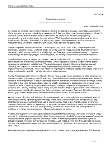 Pobrano z portalu Mapa Kultury 10.07.2014 Andrzejkowe wróżby ____________________________ autor: maria sikorska Czy serce już wkrótce wypełni się miłością czy będzie przepełnione goryczą i tęsknotą za uczuciem? Kiedy wymarzony partner pojawi się w naszym życiu? Jak brzmi jego imię i jak wygląda jego oblicze? I wreszcie czy oblubieniec będzie kochać tak bardzo, że założy nam na palec zaręczynowy pierścionek… a jeśli się tak stanie, to za ile wiosen. Właśnie na takie przepowiednie dawniej panny liczyły w dniu Świętego Andrzeja lub w wigilię tego święta. Według wierzeń, wróżby o tematyce matrymonialnej, wykonane właśnie w tym czasie, miały bowiem magiczną moc. Najstarsza polska literacka wzmianka o Andrzejkach pochodzi z 1557 roku, za sprawą Marcina Bielskiego. Udzielał on rad: ,,Nalejcie wosku na wodę, ujrzycie swoją przygodę. Słychałam od swej macierze, że która mówi pacierze, w wigiliją Jędrzeja Świętego, ujrzy oblubieńca swego.” Jednak korzenie tego święta mogą sięgać znacznie głębiej. Bo wróżby praktykowano już od starożytności. Niezależnie od czasu, w którym żył człowiek, zawsze chciał wiedzieć, co czeka go w przyszłości i czy zazna szczęścia prawdziwej i spełnionej miłości… Dlaczego jednak właśnie Święty Andrzej został powiązany z wieczorami wróżbiarskimi? Tego do końca nie wie nikt. Obecnie w kościele apostoł uważany jest za patrona małżeństw, który wspomaga w wypraszaniu potomstwa. Jest także orędownikiem zakochanych. A przecież właśnie o to pytają we wróżbach często dziewczęta, więc może to jest rozwiązanie zagadki. Istnieje także inne wytłumaczenie. Święty Andrzej jest patronem m.in. Szkocji, Grecji, Rosji, a jego święto przypada na czas zakończenia starego i rozpoczęcia nowego roku liturgicznego. A przecież okres przełomu sprzyja otwarciu świata na działanie mocy magicznych. Czas przejścia jest czasem sakralnym, w którym zdarzyć się mogą rzeczy niezwykłe. A to z kolei oznacza idealny czas na wróżby andrzejkowe. Sprzyjająca jest też pora roku. Dawniej na wsiach jesienią, tuż po zakończeniu prac polowych, rozpoczynał się przecież sezon swatania par. Święty Andrzej Apostoł znany jest jako brat Św. Piotra. Był uczniem Jana Chrzciciela, a także prowadził działalność misjonarską. Był misjonarzem nad Morzem Czarnym. Zginął śmiercią na krzyżu, gdyż został ukrzyżowany na Peleponezie w Patras w dniu 30 listopada 30 roku. Według jednej z hipotez, kult świętego Andrzeja wywodzi się z celtyckich i starogermańskich wierzeń, które związane były z postacią pięknowłosego Frejra. Było to bóstwo falliczne, swego rodzaju bóg płodności i urodzaju, światła słonecznego, a także deszczu. Frejr to syn Njorda, władał on również oceanem i wiatrami. Miał moc wpływania na wszystko, co się rodzi na ziemi, także na kwitnące niczym pączki kwiatów uczucia. Brał pod opiekę kobiety brzemienne i kochanków. Był przy tym bardzo kochliwy, a w żądzy niepohamowany… Rozsiewał nadzieję na miłość. Kolebką andrzejkowych wróżb najprawdopodobniej jest starożytna Grecja, ponieważ to właśnie Grecy wierzyli, że ludzka dusza po śmierci zyskuje dar jasnowidzenia, dzięki któremu może wpływać nawet na rzeczywisty świat, poprzez zsyłanie proroczych snów. A dawniej najczęściej zadawane pytania o przyszłość przez niewiasty były związane z miłością… Jak widać, pewne trendy są zawsze na czasie. Nie bez znaczenia jest tu nawet etymologia imienia Andrzej - Andress - andros oznacza mężczyznę, a aner – męża. Andrzejki to najhuczniej świętowany dzień w Szkocji, ponieważ patronem tego kraju jest Św. Andrzej. strona 1 / 4 Pobrano z portalu Mapa Kultury Andrzejki w Europie są również znane pod nazwą Jędrzejówki i Jędrzejki. To właśnie Andrzejki kojarzą nam się z wróżbami dziewczęcymi, które dotyczą małżeństwa i miłości, tego typu wróżby traktowano jednak bardzo poważnie, nierzadko każda wróżba poprzedzana była również modlitwą do świętego Andrzeja, choć wróżby i wierzenia tego typu są przecież potępiane przez Kościół, obecnie są obyczajem świeckim. Teraz Andrzejki to czas spotkania z przyjaciółmi i dobrej zabawy, jednak nieodłącznie w oparach miłości i koedukacyjnym gronie, co dawniej było przecież niedopuszczalne. Sztachety kolejno odlicz! Od dawna właśnie 30 listopada, czyli w dzień ukrzyżowania Św. Andrzeja, wszystkie marzące o rychłym zamążpójściu panny spotykały się w domach, aby wywróżyć sobie męża. Wróżby andrzejkowe przeznaczone były jedynie dla niezamężnych dziewcząt. Traktowano to święto bardzo poważnie, odprawiano z dopełnieniem wszelkich rytuałów: indywidualnie, w odosobnieniu. Ta tradycja, choć w nieco zmienionej już formie, przetrwała do obecnych czasów. W wielu wierzeniach ludowych, w okresie przedadwentowym, najczęściej pojawiały się istoty pozaziemskie. A wróżbom sprzyjają błąkające się po ziemi duchy. Wierzono, że to właśnie istoty z pozaziemskiego świata są w stanie pomóc kobietom spojrzeć w ich przyszłość. Panny wysiewały więc w garnkach lub na skrawku pola, ziarna lnu i konopi, które zagrabiały męskimi spodniami, w nadziei, że sprowadzi to do domu kandydata na męża. Istniało również przekonanie, że jeśli ucięta przez pannę w dniu świętego Andrzeja gałązka wiśni lub czereśni zakwitła w wigilię Bożego Narodzenia, dziewczyna mogła liczyć na rychłe pójście za mąż. Inną wróżbą było odliczanie sztachet w płocie. Dziesiąta sztacheta, w zależności od wyglądu, miała wywróżyć jaki będzie ukochany – gruby, chudy, krzywy czy może stary. Dziury w drewnie zapowiadały niezbyt zachęcający stan jego sakiewki. „Na Świętego Andrzeja dziewkom z wróżby nadzieja" W słynne imieniny, szczególnie na Śląsku i na Mazowszu, najważniej