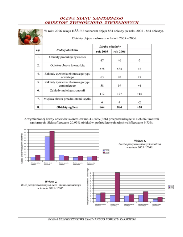 OCENA STANU SANITARNEGO OBIEKTÓW ŻYWNOŚCIOWO- ŻYWIENIOWYCH W roku 2006 sekcja HŻŻiPU nadzorem objęła 884 obiekty (w roku 2005 - 864 obiekty). Obiekty objęte nadzorem w latach 2005 – 2006. Liczba obiektów Lp. Rodzaj obiektów 1. Obiekty produkcji żywności 2. 4. 5. 6. 7. rok 2005 rok 2006 47 40 -7 578 584 +6 Zakłady żywienia zbiorowego typu otwartego 63 70 +7 Zakłady żywienia zbiorowego typu zamkniętego 58 59 +1 112 127 +15 6 4 -2 864 884 +20 Obiektu obrotu żywnością Zakłady małej gastronomii Miejsca obrotu przedmiotami użytku 8. Obiekty ogółem Z wymienionej liczby obiektów skontrolowano 43,66% (386) przeprowadzając w nich 867 kontroli sanitarnych. Sklasyfikowano 20,93% obiektów, pośród których zdyskwalifikowano 9,73%. 550 450 400 Wykres 1. Liczba przeprowadzonych kontroli w latach 2005 i 2006. 350 300 250 200 2005 2006 150 100 50 0 Zakłady produkcji żywności Zakłady obrotu żywnością Zakłady żywienia otwartego Zakłady żywienia zamkniętego Wykres 2. Ilość przeprowadzonych ocen stanu sanitarnego w latach 2005 i 2006. Zakłady małej gastronomii ilość przeprowadzonych ocen stanu sanitarnego Liczba przeprowadzonych kontroli 500 90 85 80 75 70 65 60 55 50 45 40 35 30 25 20 15 10 5 0 2005 2006 Zakłady produkcji żywności Zakłady obrotu żywnością Zakłady żywienia otwartego OCENA BEZPIECZEŃSTWA SANITARNEGO POWIATU ŻARSKIEGO Zakłady żywienia zamkniętego Zakłady małej gastronomii OCENA STANU SANITARNEGO OBIEKTÓW ŻYWNOŚCIOWO- ŻYWIENIOWYCH 35 % obiektów o złym stanie sanitarnym 32,5 30 27,5 Wykres 3. Stan sanitarny obiektów żywnościowo – żywieniowych w latach 2005 i 2006 (na podstawie arkusza oceny stanu sanitarnego). 25 22,5 20 17,5 2005 r. 15 2006 r. 12,5 10 7,5 5 2,5 0 Żywienie zbiorowe otwarte Piekarnie Ciastkarnie Zakłady małej gastronomii Sklepy spożywcze 65 60 Wykres 4. Stan sanitarny obiektów żywnościowo – żywieniowych odzwierciedlony w ilości nałożonych mandatów w latach 2005 i 2006. ilość nałożonych mandatów 55 50 45 40 35 30 2005 2006 25 20 15 10 5 0 Liczba nałożonych decyzji administracyjnych Zakłady produkcji żywności Zakłady obrotu żywnością Zakłady żywienia otwartego Zakłady żywienia zamkniętego Zakłady małej gastronomii 140 130 120 110 100 90 80 70 2005 60 2006 50 40 30 20 10 Wykres 5. Stan sanitarno-higieniczny obiektów żywnościowo – żywieniowych odzwierciedlony w ilości nałożonych decyzji administracyjnych w latach 2005 i 2006. 0 Zakłady produkcji żywności Zakłady obrotu żywnością Zakłady żywienia otwartego Zakłady żywienia zamkniętego Zakłady małej gastronomii OCENA BEZPIECZEŃSTWA SANITARNEGO POWIATU ŻARSKIEGO OCENA STANU SANITARNEGO OBIEKTÓW ŻYWNOŚCIOWO- ŻYWIENIOWYCH Zakłady produkcji żywności W roku 2006 pod nadzorem znajdowało się 40 zakładów z tej grupy, z których skontrolowano 36 obiektów. W celu poprawy stanu sanitarnego wydano 47 decyzji administracyjnych, w tym 3 decyzje o unieruchomieniu obiektu z uwagi na niewłaściwy stan sanitarno – higieniczny oraz obecność szkodników. Na osoby winne zaniedbań nałożono 8 mandatów na łączną kwotę 2900 zł. Zgodnie z arkuszem oceny stanu sanitarnego najczęściej występującymi uchybieniami były: − brak opracowanego i wdrożonego systemu HACCP (wdrożony system bezpieczeństwa żywności HACCP posiadają 4 zakłady produkujące żywność), − brak opracowanych, wdrożonych i stosowanych procedur zabezpieczenia i wycofywania z obrotu partii żywności nieodpowiadających wymaganiom jakości zdrowotnej, − brak rejestracji przebiegu procesów produkcyjnych. Obiekty obrotu żywnością W roku 2006 skontrolowano 218 obiektów spośród 584 prowadzących działalność handlową na terenie powiatu żarskiego. W celu poprawy stanu sanitarnego wydano 133 decyzje sanitarne, w tym 11 decyzji na usunięcie środków spożywczych niewłaściwej jakości zdrowotnej. Zgodnie z arkuszem oceny stanu sanitarnego najczęściej występującymi uchybieniami w tej grupie obiektów były: − brak opracowanego i wdrożonego programu dobrej praktyki higienicznej (GHP), − brak opracowanych, wdrożonych i stosowanych procedur zabezpieczenia i wycofywania z obrotu partii żywności nieodpowiadających wymaganiom jakości zdrowotnej, − brak opracowanych sposobów postępowania w celu skutecznej ochrony przed szkodnikami, − nieprawidłowe rozplanowanie pomieszczeń. Zakłady żywienia zbiorowego otwartego W roku 2006 na terenie powiatu żarskiego nadzorem objęto 70 zakładów żywienia zbiorowego otwartego (bary, restauracje). Skontrolowano 37 obiektów, sklasyfikowano 22, łącznie przeprowadzono w tej grupie obiektów 82 kontrole sanitarne, wydano 27 decyzji w tym 1 decyzję o unieruchomieniu obiektu ze względu na niewłaściwe warunki sanitarno – higieniczne. Za prowadzenie produkcji w antysanitarnych warunkach nałożono 11 mandatów na łączną kwotę 3200 zł. Zgodnie z arkuszem oceny stanu sanitarnego najczęściej występującymi uchybieniami były: − brak opracowanego, wdrożonego i utrzymanego systemu HACCP, − brak opracowanych sposobów postępowania w celu skutecznej ochrony przed szkodnikami, − brak aktualnych orzeczeń lekarskich dla celów sanitarno – epidemiologicznych, − nieprawidłowe rozplanowanie pomieszczeń, − nieprawidłowa segregacja żywności. Nadzór nad materiałami i wyrobami przeznaczonymi do kontaktu z żywnością Na terenie działalności stacji brak jest wytwórni materiałów i wyrobów przeznaczonych do kontaktu z żywnością. W roku 2006 nadzorem objęto 4 miejsca obrotu materiałami i wyrobami przeznaczonymi do kontaktu z żywnością. Stan sanitarny tych obiektów nie budził zastrzeżeń. Do badań laboratoryjnych OCENA BEZPIECZEŃSTWA SANITARNEGO POWIATU ŻARSKIEGO OCENA STANU SANITARNEGO OBIEKTÓW ŻYWNOŚCIOWO- ŻYWIENIOWYCH pobrano 2 próbki materiałów i wyrobów przeznaczonych do kontaktu z żywnością, z których żadna nie by
