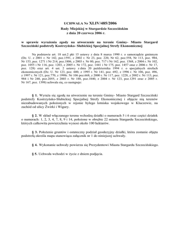 UCHWAŁA Nr XLIV/485/2006 Rady Miejskiej w Stargardzie Szczecińskim z dnia 20 czerwca 2006 r. w sprawie wyrażenia zgody na utworzenie na terenie Gminy- Miasto Stargard Szczeciński podstrefy Kostrzyńsko- Słubickiej Specjalnej Strefy Ekonomicznej Na podstawie art. 18 ust.2 pkt 15 ustawy z dnia 8 marca 1990 r. o samorządzie gminnym (Dz. U. z 2001 r. Nr 142, poz.1591, z 2002 r. Nr 23, poz. 220, Nr 62, poz.558, Nr 113, poz. 984, Nr 153, poz. 1271 i Nr 214, poz.1806, z 2003 r. Nr 80, poz. 717 i Nr 162, poz. 1568, z 2004 r. Nr 102, poz. 1055 i Nr 116, poz. 1203, z 2005 r. Nr 172, poz. 1441 i Nr 175, poz. 1457 oraz z 2006 r. Nr 17, poz. 128) oraz art. 4 ust. 2 ustawy z dnia 20 października 1994 r. o specjalnych strefach ekonomicznych (Dz. U. Nr 123, poz. 600, z 1995 r. Nr 141, poz. 692, z 1996 r. Nr 106, poz. 496, z 1997 r. Nr 121, poz.770, z 1998r. Nr 106 poz.668, z 2000 r. Nr 117, poz. 1228, z 2002 r. Nr 113, poz. 984 i Nr 240, poz.2055, z 2003 r. Nr 188, poz.1840, z 2004 r. Nr 123, poz.1291 oraz z 2005 r. Nr 167, poz. 1398) uchwala się, co następuje: § 1. Wyraża się zgodę na utworzenie na terenie Gminy- Miasto Stargard Szczeciński podstrefy Kostrzyńsko-Słubickiej Specjalnej Strefy Ekonomicznej i objęcie nią terenów niezabudowanych położonych w rejonie byłego lotniska wojskowego w Kluczewie, na zachód od ulicy Żwirki i Wigury. § 2. W skład włączanego terenu wchodzą działki o numerach 5 i 6 oraz części działek o numerach: 1, 2, 3, 4, 7, 8, 9 i 14, położone w obrębie 22 miasta Stargardu Szczecińskiego, których całkowita powierzchnia wynosi około 100 hektarów. § 3. Położenie gruntów i ostateczny podział geodezyjny działki, która zostanie objęta podstrefą określa mapa stanowiąca załącznik nr 1 do niniejszej uchwały. § 4. Wykonanie uchwały powierza się Prezydentowi Miasta Stargardu Szczecińskiego. § 5. Uchwała wchodzi w życie z dniem podjęcia. Uzasadnienie Gmina- Miasto Stargard Szczeciński od października 2005 roku prowadziła negocjacje z japońskim inwestorem, zamierzającym wybudować w Europie Wschodniej nowoczesną fabrykę opon. Efektem negocjacji jest oświadczenie zarządu firmy Bridgestone, wydane w dniu 6 czerwca 2006 roku o wyborze Stargardu Szczecińskiego jako miejsca lokalizacji fabryki. Studium uwarunkowań i kierunków zagospodarowania przestrzennego, jako strategiczny dokument kierunkowy do planowania rozwoju miasta, przyjęty przez Radę Miejską w Stargardzie Szczecińskim uchwałą Nr XXVII/263/2000 z dnia 26.10.2000r., przewiduje na przedmiotowym terenie- tereny działalności gospodarczej- dużego i średniego biznesu, w tym o charakterze baz i składów. W chwili obecnej trwają działania, zmierzające do przygotowania działki o oczekiwanym przez inwestora kształcie (graficznie przedstawionym w załączniku nr 1). W pakiecie zachęt przedstawionym inwestorowi przez Państwową Agencję Informacji i Inwestycji Zagranicznych, została zaoferowana, ze względu na wielkość inwestycji, lokalizacja na terenie jednej z istniejących specjalnych stref ekonomicznych. W procesie negocjacji udział brali przedstawiciele Kostrzyńsko- Słubickiej Specjalnej Strefy Ekonomicznej, deklarując utworzenie dla wspomnianej inwestycji podstrefy KSSSE na terenie planowanej inwestycji w Stargardzie Szczecińskim. Art. 4 ust 2 ustawy z dnia 20 października 1994r. o specjalnych strefach ekonomicznych stanowi, że zgodę na włączenie w obszar specjalnej strefy ekonomicznej wyraża właściwa rada gminy ze względu na położenie strefy. Mając na uwadze powyższe, zasadnym jest podjęcie uchwały o wyrażeniu zgody na utworzenie podstrefy Kostrzyńsko- Słubickiej Specjalnej Strefy Ekonomicznej dla wnioskowanego terenu.