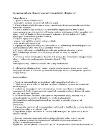 Regulamin zakupu obiadów oraz użytkowania kart obiadowych Zakup obiadów 1. Opłaty za obiady można wnosić: - osobiście w sklepiku szkolnym lub na konto ajenta 2. Wpłat na konto należy dokonywać z góry za następny miesiąc poprzedzającego miesiąc wydawania posiłków. 3. Wpłat na konto należy dokonywać z odpowiednim wyprzedzeniem. Obiady będą wydawane dopiero po terminowym wpłynięciu opłaty na konto ajenta. Należy pamiętać, że w soboty i niedziele banki nie dokonują operacji na kontach. Wpłaty na Poczcie Polskiej wpływają na konto odbiorcy po kilku dniach. 4. W tytule wpłaty należy podać: - miesiąc i rok, za który wnosimy opłatę za obiady, - imię, nazwisko i klasę dziecka, 5. W przypadku wpłaty za więcej niż jedno dziecko, w tytule wpłaty dane należy podać dla każdego dziecka osobno lub dokonać osobnych przelewów. 6. Wysokość należności za obiady będzie podawana na stronie internetowej szkoły do 20 dnia każdego miesiąca poprzedzającego miesiąc, za który ma nastąpić wpłata. 7. Odwołanie obiadu można zgłosić do godz. 8.30 danego dnia roboczego na następny dzień roboczy , zgłoszenie nieobecności na śniadaniu do godz. 7.30, sms-em Należy podać: imię i nazwisko dziecka, klasę, datę nieobecności 8. Należność za odwołane obiady za dany miesiąc zostaje zarachowana na poczet wpłat następnego miesiąca. Rozliczenie tej należności następuje poprzez pomniejszenie wpłaty za kolejny miesiąc. Karty obiadowe 1. Podstawą wydania obiadu jest posiadanie elektronicznej karty obiadowej. 2. Obiad można pobrać tylko raz dziennie - wydanie obiadu jest rejestrowane w systemie informatycznym. 3. Osobom nie posiadającym karty obiad zostanie wydany na podstawie weryfikacji komputerowej. Osoby te przepuszczają wszystkich posiadających karty, dlatego tak ważne jest , aby kartę nosić regularnie 4. Elektroniczna karta obiadowa jest wydawana za pobraniem kaucji zwrotnej 7 zł ,w przypadku przelewu prosimy o doliczenie tej kwoty do abonamentu. 5.Zgubienie karty należy natychmiast zgłosić osobiście w sklepiku szkolnym lub telefonicznie . u intendenta. 6. W przypadku zgubienia lub zniszczenia karty należy nabyć duplikat. Za wydanie duplikatu pobierana jest opłata w wysokości 10 zl 8. Zagubiona karta jest blokowana w systemie elektronicznym i nie będzie na nią można otrzymać obiadu. 1. Za termin płatności uważamy dzień wpływu na konto lub dzień wpłaty gotówki u ajenta . Tylko terminowa wpłata gwarantuje korzystanie z obiadów od pierwszego dnia nowego miesiąca (okresu abonamentowego). Wyjątek będą stanowić płatności za wrzesień i styczeń. W tym przypadku termin będzie podawany na stronie szkoły Aby przelew był zaksięgowany na koncie ajenta terminowo, należy zlecić przelew odpowiednio wcześniej, jeżeli w te dni wypadają soboty, niedziele lub święta. W soboty, niedziele i święta nie są dokonywane operacje bankowe. 2. Przelewy, które wpływają na konto ajenta po terminie, księgowane są następnego roboczego dnia. Przykład 1: Rodzic zlecił przelew po terminie w dniu 2.X.2014 r. Przelew wpływa na konto dnia 3.X.2014 r., przelew jest księgowany 6.X.2014 r. Obiad jest wykupiony nie wcześniej niż od dnia 8.X.2014 r. 3. Osoby które, nie dokonują wpłaty za cały miesiąc,wpłaty są przyjmowane min. Na 10 dni roboczych . Ponadto, jeżeli był wcześniej zgłoszony obiad do odwołania, należy również umieścić taką informację na przelewie. Brak prawidłowego opisu może spowodować, że obiad będzie nieopłacony. 4. Karty, które posiadają dzieci odczytują informacje z systemu, czy w danym dniu obiad jest opłacony. Inne statusy to obiad odwołany lub obiad nieopłacony, w takim przypadku dziecko nie ma przygotowanego obiadu. Jeżeli rodzic odwoła obiad lub nie wykupi obiadu na dany dzień, informacje te wyświetlą się w danym dniu. 5. Odwołania obiadów zgłaszamy sms-em do godz. 8.30 danego dnia roboczego Należy podać: imię i nazwisko dziecka, klasę, datę nieobecności. Prosimy o zgłaszanie odwołań obiadów wcześniej, najlepiej do godz. 8.30 danego dnia roboczego na drugi dzień roboczy, a najpóźniej do 8.30 danego dnia. Posiłki odwołane poźniej nie będą odliczane. Zgłaszamy również wycieczki klasowe. Brak zgłoszenia odwołania przez rodzica w przypadku wycieczki klasowej oznacza, że dziecko będzie korzystać z obiadu. Odliczenia za obiady, które nie zostały wcześniej prawidłowo odwołane przez rodzica, nie będą uznawane. 7. Odliczenia za odwołane obiady (odpisy) należy rozliczyć przy najbliższej płatności. Przykładowo: Odpisy z lutego należy rozliczyć przy płatności za marzec. Prosimy o przestrzeganie tej zasady, co ułatwia rozliczenia. Ideą przelewu jest, aby wpłacać prawidłową kwotę i w terminie. Niewłaściwe przelewy poważnie utrudniają nam pracę. 8. Jeżeli wpłata bankowa będzie za niska na pokrycie całego abonamentu, albo będą odliczenia za odwołania obiadów (odpisy), które nie zostały prawidłowo zgłoszone i powstanie niedopłata, to obowiązuje zasada, że nieopłacone są obiady w ostatnie dni danego okresu (miesiąca). Nie ma możliwości wprowadzenia do sytemu informatycznego, obiadu który nie jest opłacony w całości. Aby obiad był wprowadzony na dany dzień musi być opłacony w całości (w 100%). 9. Kwoty, termin płatności i zakres abonamentu (dni od – do) publikowane będą na stronie szkoły w terminie do 20 dnia każdego miesiąca na miesiąc następny. Ze względu na ułożenie kalendarza i organizację pracy, zakres abonamentu może być inny niż miesiąc kalendarzowy. Zasady wydawania i użytkowania elektronicznych kart obiadowych 1. Elektroniczna karta obiadowa jest wydawana każdemu uczniowi korzystającemu ze stołówki szkolnej . 2. Karta obiadowa jest zarejestrowana w systemie informatycznym i przypisana do konkretnego ucznia. 3. Informacje o opłaceniu obiadu są wprowadzane 