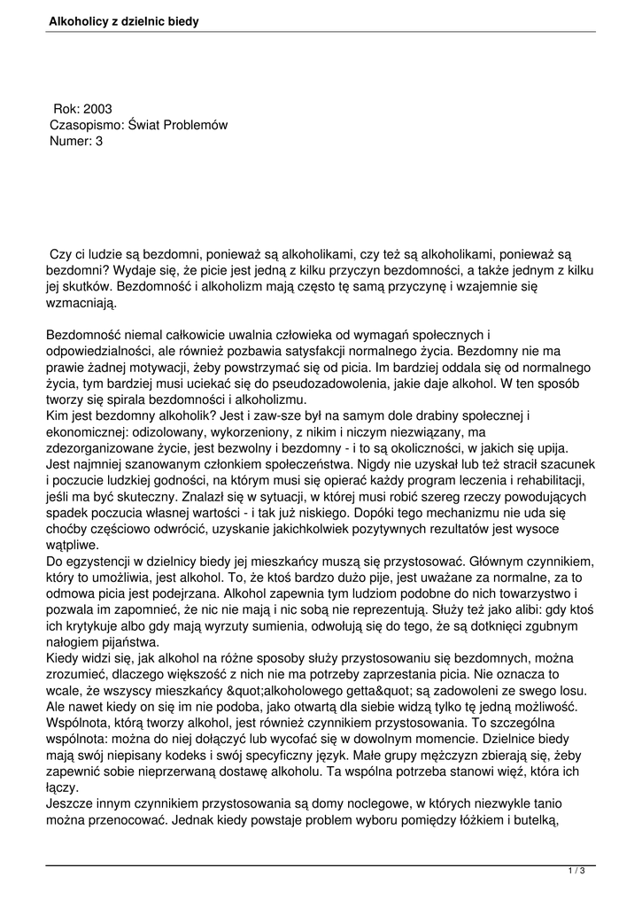 Alkoholicy z dzielnic biedy Rok: 2003 Czasopismo: Świat Problemów Numer: 3 Czy ci ludzie są bezdomni, ponieważ są alkoholikami, czy też są alkoholikami, ponieważ są bezdomni? Wydaje się, że picie jest jedną z kilku przyczyn bezdomności, a także jednym z kilku jej skutków. Bezdomność i alkoholizm mają często tę samą przyczynę i wzajemnie się wzmacniają. Bezdomność niemal całkowicie uwalnia człowieka od wymagań społecznych i odpowiedzialności, ale również pozbawia satysfakcji normalnego życia. Bezdomny nie ma prawie żadnej motywacji, żeby powstrzymać się od picia. Im bardziej oddala się od normalnego życia, tym bardziej musi uciekać się do pseudozadowolenia, jakie daje alkohol. W ten sposób tworzy się spirala bezdomności i alkoholizmu. Kim jest bezdomny alkoholik? Jest i zaw-sze był na samym dole drabiny społecznej i ekonomicznej: odizolowany, wykorzeniony, z nikim i niczym niezwiązany, ma zdezorganizowane życie, jest bezwolny i bezdomny - i to są okoliczności, w jakich się upija. Jest najmniej szanowanym członkiem społeczeństwa. Nigdy nie uzyskał lub też stracił szacunek i poczucie ludzkiej godności, na którym musi się opierać każdy program leczenia i rehabilitacji, jeśli ma być skuteczny. Znalazł się w sytuacji, w której musi robić szereg rzeczy powodujących spadek poczucia własnej wartości - i tak już niskiego. Dopóki tego mechanizmu nie uda się choćby częściowo odwrócić, uzyskanie jakichkolwiek pozytywnych rezultatów jest wysoce wątpliwe. Do egzystencji w dzielnicy biedy jej mieszkańcy muszą się przystosować. Głównym czynnikiem, który to umożliwia, jest alkohol. To, że ktoś bardzo dużo pije, jest uważane za normalne, za to odmowa picia jest podejrzana. Alkohol zapewnia tym ludziom podobne do nich towarzystwo i pozwala im zapomnieć, że nic nie mają i nic sobą nie reprezentują. Służy też jako alibi: gdy ktoś ich krytykuje albo gdy mają wyrzuty sumienia, odwołują się do tego, że są dotknięci zgubnym nałogiem pijaństwa. Kiedy widzi się, jak alkohol na różne sposoby służy przystosowaniu się bezdomnych, można zrozumieć, dlaczego większość z nich nie ma potrzeby zaprzestania picia. Nie oznacza to wcale, że wszyscy mieszkańcy "alkoholowego getta" są zadowoleni ze swego losu. Ale nawet kiedy on się im nie podoba, jako otwartą dla siebie widzą tylko tę jedną możliwość. Wspólnota, którą tworzy alkohol, jest również czynnikiem przystosowania. To szczególna wspólnota: można do niej dołączyć lub wycofać się w dowolnym momencie. Dzielnice biedy mają swój niepisany kodeks i swój specyficzny język. Małe grupy mężczyzn zbierają się, żeby zapewnić sobie nieprzerwaną dostawę alkoholu. Ta wspólna potrzeba stanowi więź, która ich łączy. Jeszcze innym czynnikiem przystosowania są domy noclegowe, w których niezwykle tanio można przenocować. Jednak kiedy powstaje problem wyboru pomiędzy łóżkiem i butelką, 1/3 Alkoholicy z dzielnic biedy butelka zawsze wygrywa. Spanie pod dachem jest luksusem - alkohol to konieczność. [na podst. Howard J. Clinebell jr.: Understanding and Counseling the Alcoholic na http: www.religion-online.org] Kilka istotnych faktów W USA liczba osób, które były bezdomne przynajmniej przez jedną noc w ciągu roku, wynosi prawdopodobnie ponad 3 miliony. Znaczna większość bezdomnych to mężczyźni, najczęściej samotni. Ich szeregi zasilają nielegalni imigranci. Co piąte dziecko żyje w rodzinie poniżej granicy ubóstwa, co przyczynia się do wzrostu udziału dzieci wśród bezdomnych. Wiele osób bezdomnych ukończyło szkołę średnią, niektóre uczęszczały do koledżu, a nawet na wyższą uczelnię. Bezdomnych można znaleźć nie tylko w miastach, ale i w małych miasteczkach oraz na zamożnych przedmieściach. Ukryta bezdomność dotyka setek tysięcy ludzi, znajdujących się tylko o jeden kryzys od utraty domu. To ci, którzy mieszkają gdzieś kątem, których czeka eksmisja albo wkrótce wyjdą ze szpitala albo z więzienia i nie będą mieli gdzie się podziać. Mit: Oni chcą być bezdomni. Fakt: Niespełna 6% bezdomnych w USA żyje w ten sposób z wyboru. Mit: Sami są winni swojej bezdomności. Fakt: Większość bezdomnych to ofiary. Niektórzy doświadczyli jako dzieci nadużyć albo przemocy. Blisko 1/4 to dzieci. Wielu bezdomnych straciło pracę, wszyscy stracili dach nad głową. Mit: Bezdomni nie pracują. Fakt: Wielu bezdomnych ma pracę, ale minimalne zarobki nie wystarczają na utrzymanie rodziny lub opłacenie czynszu. Mit: Oni są chorzy psychicznie. Fakt: Szacuje się, że około 1/4 bezdomnych w USA ma zaburzenia emocjonalne. Długoterminowej hospitalizacji może potrzebować 1%, pozostali zaś mogliby stać się samowystarczalni, gdyby uzyskali pomoc. Mit: Ostro nadużywają alkoholu i narkotyków. Fakt: Niektórzy bezdomni - rzeczywiście ich nadużywają. Wielu z nich to chorzy psychicznie, a więc należący do wymienionej przed chwilą 1/4. Mit: Bezdomni są niebezpieczni. Fakt: Bezdomni są jedną z najmniej groźnych grup w naszym społeczeństwie. Spotkanie z bezdomnym może zakończyć się tragicznie, dzieje się tak jednak skrajnie rzadko. W przypadku przestępstw są z reguły ofiarami, a nie sprawcami. 2/3 Alkoholicy z dzielnic biedy 3/3
