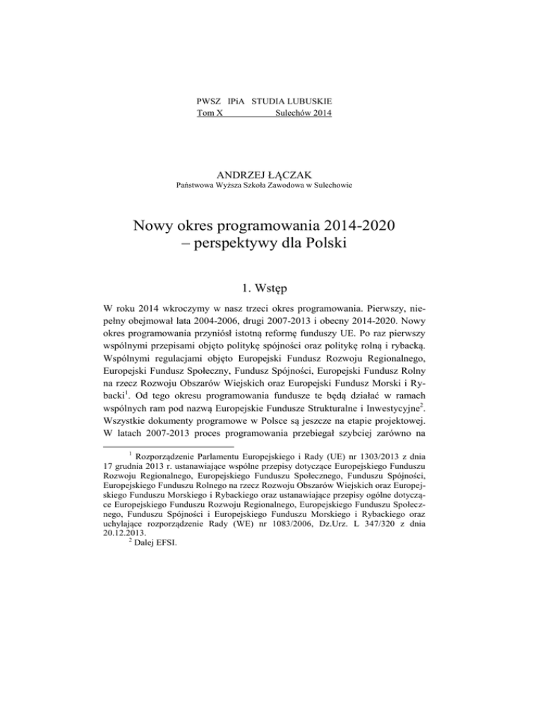 PWSZ IPiA STUDIA LUBUSKIE Tom X Sulechów 2014 ANDRZEJ ŁĄCZAK Państwowa Wyższa Szkoła Zawodowa w Sulechowie Nowy okres programowania 2014-2020 – perspektywy dla Polski 1. Wstęp W roku 2014 wkroczymy w nasz trzeci okres programowania. Pierwszy, niepełny obejmował lata 2004-2006, drugi 2007-2013 i obecny 2014-2020. Nowy okres programowania przyniósł istotną reformę funduszy UE. Po raz pierwszy wspólnymi przepisami objęto politykę spójności oraz politykę rolną i rybacką. Wspólnymi regulacjami objęto Europejski Fundusz Rozwoju Regionalnego, Europejski Fundusz Społeczny, Fundusz Spójności, Europejski Fundusz Rolny na rzecz Rozwoju Obszarów Wiejskich oraz Europejski Fundusz Morski i Rybacki1. Od tego okresu programowania fundusze te będą działać w ramach wspólnych ram pod nazwą Europejskie Fundusze Strukturalne i Inwestycyjne2. Wszystkie dokumenty programowe w Polsce są jeszcze na etapie projektowej. W latach 2007-2013 proces programowania przebiegał szybciej zarówno na 1 Rozporządzenie Parlamentu Europejskiego i Rady (UE) nr 1303/2013 z dnia 17 grudnia 2013 r. ustanawiające wspólne przepisy dotyczące Europejskiego Funduszu Rozwoju Regionalnego, Europejskiego Funduszu Społecznego, Funduszu Spójności, Europejskiego Funduszu Rolnego na rzecz Rozwoju Obszarów Wiejskich oraz Europejskiego Funduszu Morskiego i Rybackiego oraz ustanawiające przepisy ogólne dotyczące Europejskiego Funduszu Rozwoju Regionalnego, Europejskiego Funduszu Społecznego, Funduszu Spójności i Europejskiego Funduszu Morskiego i Rybackiego oraz uchylające rozporządzenie Rady (WE) nr 1083/2006, Dz.Urz. L 347/320 z dnia 20.12.2013. 2 Dalej EFSI. 182 ANDRZEJ ŁĄCZAK szczeblu europejskim, jak i krajowym. Unijny pakiet rozporządzeń związanych z wprowadzeniem funduszy europejskich został ogłoszony w połowie 2006 r., a 12 grudnia 2006 r. został zatwierdzony Program Operacyjny Kapitał Ludzki na lata 2007-2013. Adekwatny pakiet rozporządzeń unijnych na lata 2014-2020 opublikowano dopiero w połowie grudnia 2013 r., a na zatwierdzenie krajowych programów operacyjnych trzeba będzie zapewne poczekać do drugiej połowy 2014 r. Rozpoczęcie realizacji projektów nastąpi zapewne dopiero w roku 2015, co spowoduje faktyczne skrócenie okresu realizacji perspektywy finansowej o jeden rok. Sytuacja ta będzie wymagała zintensyfikowania działań instytucji odpowiedzialnych za realizację funduszy strukturalnych w Polsce. Jest ona także niekorzystna dla beneficjentów, którzy będą mieli mniej czasu na przygotowanie i realizację projektów. Szczególnie jest to ważne w przypadku dużych projektów infrastrukturalnych. 2. Nowe podejście do funduszy UE w perspektywie finansowej 2014-2020 Objęcie wspólnymi przepisami wszystkich funduszy ma poprawić koordynację i harmonizację ich wdrażania. EFSI nie powinny być wykorzystywane do finansowania inwestycji zakończonych i wdrożonych. Od tej zasady dopuszcza się odstępstwa w przypadku inwestycji w infrastrukturę wspierającą rozwój lub rewitalizację obszarów miejskich oraz inwestycji, których celem jest zróżnicowanie działalności nierolniczej na obszarach wiejskich. Zmianie ulega podejście do projektów, które po zakończeniu realizacji generują dochód. W celu uniknięcia nadmiernego finansowania projektów generujących dochód zaproponowano, aby do określenia wygenerowanego dochodu zawsze, gdy jest to możliwe, stosować stawki zryczałtowane dla sektorów lub podsektorów. Stawki zryczałtowane powinny być określane na podstawie danych historycznych, możliwości odzyskania kosztów oraz zgodnie z zasadą, że „zanieczyszczający płaci”. Stawki zryczałtowane powinny być stosowane w każdym przypadku, chyba że istnieją uzasadnione przypadki do odstępstwa od tej zasady. Każde państwo członkowskie powinno opracować reguły dopuszczające odstępstwa od tej zasady. W szczególności stawki zryczałtowane powinny znaleźć zastosowanie Nowy okres programowania 2014-2020 – perspektywy dla Polski 183 w dziedzinie technologii informacyjnych i komunikacyjnych, badań i rozwoju oraz efektywności energetycznej3. Przyjęto, że okres kwalifikowania wydatków rozpoczyna się 1 stycznia 2014 r. lub z chwilą przedłożenia programu operacyjnego w zależności od tego, który fakt nastąpił wcześniej. Jedynie okres kwalifikowania wydatków na wdrożenie Inicjatywy na rzecz zatrudnienia ludzi młodych rozpoczął się z 1 września 2013 r. Opracowanie szczegółowych zasad kwalifikowania wydatków spoczywa na państwach członkowskich. Zasady te muszą uwzględniać wyjątki przewidziane w rozporządzeniach wprowadzających poszczególne fundusze4. Nowe regulacje prawne dają więcej swobody państwom członkowskim w kształtowaniu zasad wydatkowania funduszy w ramach EFSI. Ma się ona przyczynić do uproszczenia procedury oraz zapewnić możliwość uwzględnienia specyfiki polityki wynikającej z istniejącego zróżnicowania pomiędzy państwami członkowskimi. Państwa członkowskie powinny dać możliwość stosowania różnych form wsparcia w EFSI. Głównie w formie dotacji, nagród, pomocy zwrotnej i instrumentów finansowych lub ich kombinacji. Podmioty ubiegające się o pomoc powinny mieć wybór najodpowiedniejszej dla siebie formy5. Wszystkie inwestycje zrealizowane przy wsparciu EFSI powinny zachować trwałość przez okres minimum 5 lat. Państwa członkowskie mogą skró3 Rozporządzenie Parlamentu Europejskiego i Rady (UE) nr 1303/2013, pkt 57, s. 328. 4 Rozporządzenie Parlamentu Europejskiego i Rady (UE) nr 1301/2013 z dnia 17 grudnia 2013 r. w sprawie Europejskiego Funduszu Rozwoju Regionalnego i przepisów szczegółowych szczególnych dotyczących celu „Inwestycje na rzecz wzrostu gospodarczego i zatrudnienia” oraz w sprawie uchylenia rozporządzenia (WE) nr 1080/2006, Dz.Urz. L 347/320 z dnia 20.12.2013, s. 289; Rozporządzenie Parlamentu Europejskiego i Rady (UE) nr 1300/