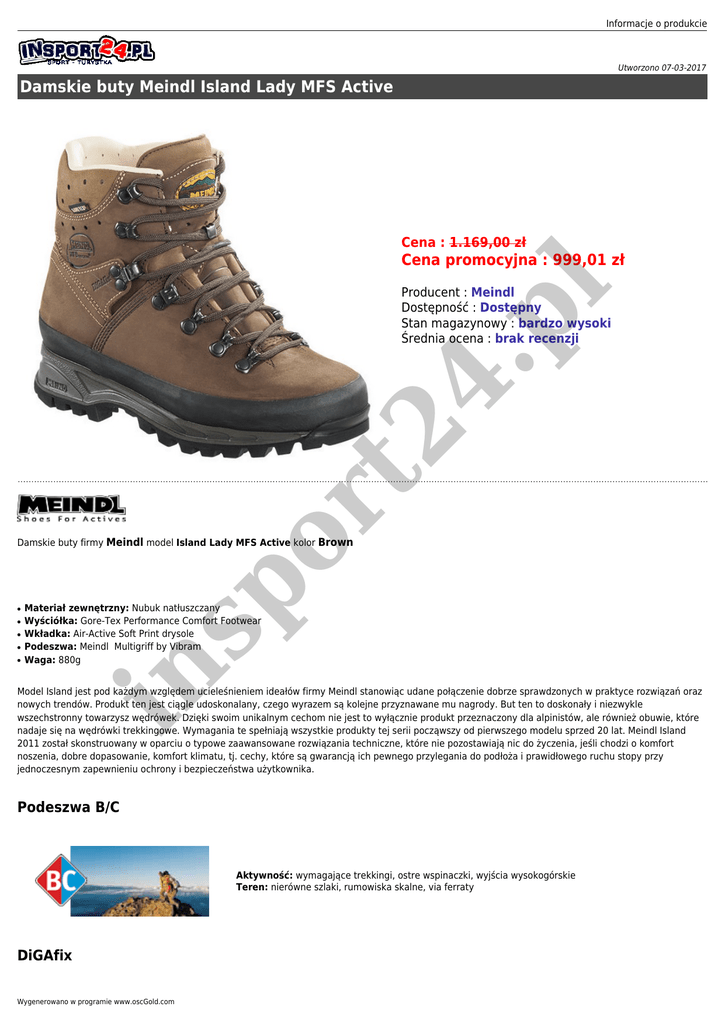 Informacje o produkcie Utworzono 07-03-2017 Damskie buty Meindl Island Lady MFS Active Cena : 1.169,00 zł l Cena promocyjna : 999,01 zł sp or t2 4. p Producent : Meindl Dostępność : Dostępny Stan magazynowy : bardzo wysoki Średnia ocena : brak recenzji Damskie buty firmy Meindl model Island Lady MFS Active kolor Brown ● ● ● ● in ● Materiał zewnętrzny: Nubuk natłuszczany Wyściółka: Gore-Tex Performance Comfort Footwear Wkładka: Air-Active Soft Print drysole Podeszwa: Meindl Multigriff by Vibram Waga: 880g Model Island jest pod każdym względem ucieleśnieniem ideałów firmy Meindl stanowiąc udane połączenie dobrze sprawdzonych w praktyce rozwiązań oraz nowych trendów. Produkt ten jest ciągle udoskonalany, czego wyrazem są kolejne przyznawane mu nagrody. But ten to doskonały i niezwykle wszechstronny towarzysz wędrówek. Dzięki swoim unikalnym cechom nie jest to wyłącznie produkt przeznaczony dla alpinistów, ale również obuwie, które nadaje się na wędrówki trekkingowe. Wymagania te spełniają wszystkie produkty tej serii począwszy od pierwszego modelu sprzed 20 lat. Meindl Island 2011 został skonstruowany w oparciu o typowe zaawansowane rozwiązania techniczne, które nie pozostawiają nic do życzenia, jeśli chodzi o komfort noszenia, dobre dopasowanie, komfort klimatu, tj. cechy, które są gwarancją ich pewnego przylegania do podłoża i prawidłowego ruchu stopy przy jednoczesnym zapewnieniu ochrony i bezpieczeństwa użytkownika. Podeszwa B/C Aktywność: wymagające trekkingi, ostre wspinaczki, wyjścia wysokogórskie Teren: nierówne szlaki, rumowiska skalne, via ferraty DiGAfix Wygenerowano w programie www.oscGold.com 4. p GORE-TEX Performance Comfort Footwear l DiGAfix - elastyczne, niepowodujące ucisku, ukośne mocowanie - umożliwia sznurowanie obejmujące stopę. W celu zapewnienia optymalnego sznurowania i dopasowania, punkt mocowania przy DIGAfix (1) leży o wiele niżej niż hak odciągający (2).To rozwiązanie zmniejsza niebezpieczeństwo zaczepienia o drugi but lub przeszkodę. Haki do dwustrefowego sznurowania (3) są umieszczone poniżej i gwarantują dobre trzymanie stopy. in sp or t2 Obuwie GORE-TEX Performance Comfort utrzymuje optymalny klimat dla Twoich stóp podczas wielu rodzajów aktywności outdoorowych i rożnych warunków pogodowych. MFS System Informacje o produkcie Memory Foam System to technologia sprawdzona i stosowana od lat w butach miendl. Dzięki niej odczuwamy idealne dopasowanie butów do naszych stóp. Specjalnie opracowana mieszanka pianki używana jest na wykończenie mankietu cholewki. Pianka działa pod wpływem ciepła prze co odpowiednio formuje się do stopy. Profil mankietu pracuje podczas marszu, stabilizuje stopy, ale ich nie uciska. Zapewnia to najwyższy możliwy komfort! 4. p l Technologia wykorzystująca piankę, która, dzięki unikalnemu systemowi rozpoznawania temperatury, doskonale dopasowuje się do kształtu stopy. Dostępne opcje Damskie buty Meindl Island Lady MFS Active in sp or t2 Rozmiar: 36, 36,5, 37, 37,5, 38, 38,5, 39, 39,5, 40, 40,5, 41. Wygenerowano w programie www.oscGold.com