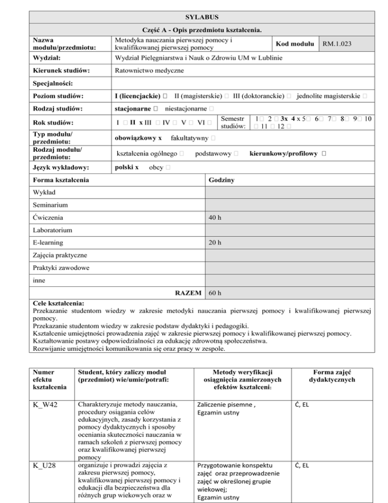 SYLABUS Część A - Opis przedmiotu kształcenia. Nazwa modułu/przedmiotu: Metodyka nauczania pierwszej pomocy i kwalifikowanej pierwszej pomocy Wydział: Wydział Pielęgniarstwa i Nauk o Zdrowiu UM w Lublinie Kierunek studiów: Ratownictwo medyczne Kod modułu RM.1.023 Specjalności: Poziom studiów: Rodzaj studiów: Rok studiów: Semestr studiów: II x Typ modułu/ przedmiotu: Rodzaj modułu/ przedmiotu: Język wykładowy: 3x 4 x obowiązkowy x polski x Forma kształcenia Godziny Wykład Seminarium Ćwiczenia 40 h Laboratorium E-learning 20 h Zajęcia praktyczne Praktyki zawodowe inne RAZEM 60 h Cele kształcenia: Przekazanie studentom wiedzy w zakresie metodyki nauczania pierwszej pomocy i kwalifikowanej pierwszej pomocy. Przekazanie studentom wiedzy w zakresie podstaw dydaktyki i pedagogiki. Kształcenie umiejętności prowadzenia zajęć w zakresie pierwszej pomocy i kwalifikowanej pierwszej pomocy. Kształtowanie postawy odpowiedzialności za edukację zdrowotną społeczeństwa. Rozwijanie umiejętności komunikowania się oraz pracy w zespole. Numer efektu kształcenia Student, który zaliczy moduł (przedmiot) wie/umie/potrafi: K_W42 Charakteryzuje metody nauczania, procedury osiągania celów edukacyjnych, zasady korzystania z pomocy dydaktycznych i sposoby oceniania skuteczności nauczania w ramach szkoleń z pierwszej pomocy oraz kwalifikowanej pierwszej pomocy organizuje i prowadzi zajęcia z zakresu pierwszej pomocy, kwalifikowanej pierwszej pomocy i edukacji dla bezpieczeństwa dla różnych grup wiekowych oraz w K_U28 Forma zajęć dydaktycznych Metody weryfikacji osiągnięcia zamierzonych efektów kształceni: Zaliczenie pisemne , Egzamin ustny Ć, EL Przygotowanie konspektu zajęć oraz przeprowadzenie zajęć w określonej grupie wiekowej; Egzamin ustny Ć, EL ramach różnych organizacji nadzorujących K_U29 K_U30 K_U31 K_U32 K_K02 K_K15 K_K16 dobiera odpowiednie metody nauczania z zakresu pierwszej pomocy, kwalifikowanej pierwszej pomocy, edukacji dla bezpieczeństwa w zależności od wieku uczniów, treści nauczania, celów i zadań pracy dydaktyczno-wychowawczej, organizacji i środków, które zamierza użyć w trakcie szkolenia dopasowując je d o poziomu wiedzy i umiejętności uczniów/ kursantów Przeprowadzenie zajęć w określonej grupie wiekowej Ć, EL wykorzystuje istniejące i opracowuje nowe pomoce dydaktyczne wspomagające proces dydaktyczny podczas kursów oraz szkoleń stosuje efektywne metody nauczania zasad zachowania bezpieczeństwa w miejscach publicznych i w domu oraz postępowania w przypadkach nagłych i nadzwyczajnych zagrożeń środowiskowych, klęsk i katastrof popularyzuje wiedzę z zakresu pierwszej pomocy i kwalifikowanej pierwszej pomocy w różnych środowiskach oraz motywuje ludzi do zapobiegania zagrożeniom ekologicznym aktualizuje wiedzę i doskonali umiejętności zawodowe związane z prowadzonymi kursami/ szkoleniami przestrzega zasad kultury i etyki jako instruktor/ nauczyciel, zachęcając tym do udziału w kursie/ szkoleniu jest kreatywny i konsekwentny w realizacji zadań, związanych z przekazywaniem wiedzy podczas kursów szkoleń z pierwszej pomocy, kwalifikowanej pierwszej pomocy Przygotowanie konspektu zajęć oraz przeprowadzenie zajęć w określonej grupie wiekowej Przygotowanie konspektu zajęć Ć Przygotowanie konspektu zajęć oraz przeprowadzenie zajęć na jego podstawie Ć Check list Ć Check list Ć Check list Ć Wiedza + + Umiejętności + + + Postawy + + Ć Nakład pracy studenta (bilans punktów ECTS) Forma nakładu pracy studenta 1. Godziny kontaktowe Obciążenie studenta (h) 60 2. Czas pracy własnej studenta 20 h Sumaryczne obciążenie pracy studenta 80 h Punkty ECTS za moduł/przedmiotu 2 ECTS Uwagi Treść zajęć: Wykłady: 1. Podstawy nauczania pierwszej pomocy i kwalifikowanej pierwszej pomocy różnych grup społeczeństwa. Nauczanie pierwszej pomocy w programach edukacyjnych dzieci, młodzieży i dorosłych. Techniczne środki kształcenia. Baza dydaktyczna i wymagania sprzętowe. 2. Nauczanie pierwszej pomocy – zalecenia metodyczne. Metodyka prowadzenia zajęć. Procedury osiągania celów edukacyjnych. 3. Metody nauczania. Dobór metod nauczania. Klasyfikacja metod nauczania. Funkcje metod nauczania. 4. Konspekt zajęć- zasady tworzenia. Omówienie przykładowych konspektów zajęć z pierwszej pomocy oraz kwalifikowanje pierwszje pomocy. 5. Zasady nauczania wg Europejskiej Rady Resuscytacji. Rodzaje szkoleń oraz zasady nabywania uprawnień instruktorskich w ramach ERC. Metoda czterech kroków. 6. Szkolenia w ramach Amarican Heart Asociation oraz WOSP. 7. Feedback i zasady udzielania feedbacku. 8. Omówienie modelu RIME. 9. Program kursu kwalifikowanje pierwszej pomocy. 10. Nauczanie dzieci- cechy charakterystyczne kursu/ lekcji dla młodszych grup wiekowych. Ćwiczenia: 1. Wprowadzenie do przedmiotu. Założenia programowe. Literatura do przedmiotu. Warunki zaliczenia przedmiotu. Regulamin Zakładu Dydaktyki i Symulacji Medycznej. Przepisy BHP. 1. Metody nauczania. Metody oparte na słowie: wykład; opowiadanie; pogadanka; opis; praca z książką, instruktaż- zastosowanie. 2. Metody nauczania. Metody aktywizujące: burza mózgów; sytuacyjna; techniki dramowe. 3. Metody nauczania. Metody aktywizujące: mapa semantyczna (mentalna, pamięci), dyskusja, (klasyczna, wielokrotna, konferencyjna, panelowa, punktowana). 4. Metody nauczania. Metody aktywizujące: metaplan, analiza SWOT, drzewko decyzyjne. 5. Metody nauczania. Metody aktywizujące: projekt, debata. 6. Konspekt zajęć. Scenariusz lekcji. Opracowanie programu kursu, podział materiału kursu. Opracowanie celów realizacji tematów kursu w zakresie wiedzy, umiejętności i motywacji. 7. Strategie aktywnego nauczania. Metody dydaktyczne a aktywność i kreatywność uczniów. Podsumowanie zajęć. 8. Scenariusze lekcji z pierwszej pomocy i kwalifikowanej pierwszej pomocy. Wykorzystywanie aktywizujących metod nauczania. 9. Ins
