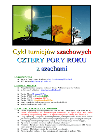 Cykl turniejów szachowych CZTERY PORY ROKU z szachami 1.ORGANIZATOR Kaliskie Towarzystwo Szachowe - http://szachmistrz.pl/klub.html SP 2 Kalisz - http://www.sp2.kalisz.pl/ 2. TERMIN I MIEJSCE Wszystkie turnieje rozegrane zostaną w Szkole Podstawowej nr 2 w Kaliszu ul. Tuwima 4 w Kaliszu - http://www.sp2.kalisz.pl/ Turniej ZIMA 18 marca 2017r. Turniej WIOSNA 8 kwietnia 2017r. Turniej LATO 16 września 2017r. Turniej JESIEŃ 28 października 2017r. każdy z turniejów będzie rozpoczynać się o godzinie 10.00, potwierdzenie gry do godz. 9.30 3. WARUNKI UCZESTNICTWA I WPISOWE Turniej rozgrywany w dwóch grupach: do lat 9 (ur.2008 i młodsi) i do 14 (ur.2003-2007r.) Turniej przeznaczony dla początkujących szachistów. W cyklu mogą brać udział zawodnicy, których ranking PZSZACH wynosi maksymalnie 1400 (III dz. lub IV ch.) Liczy się ranking i kategoria z pierwszego turnieju, w którym dziecko wzięło udział. Nawet jak w międzyczasie dziecko zdobędzie wyższą kategorię może grać w kolejnych turniejach. Obowiązują wcześniejsze zgłoszenia, zapisy w dniu turnieju mogą być nie przyjęte, Wpisowe do zawodów pobierane będzie w każdym z turniejów, Wpisowe – 6zł od zawodnika, dotyczy uczniów szkół z Kalisza, zawodników KTS Kalisz oraz uczniów Szkoły szachowej SzachMistrz, Wpisowe – 10zł od zawodnika, dla wszystkich pozostałych, Wpisowe należy wpłacać w dniu turnieju na sali rozgrywek do godziny 9.30, 4. ZAPISY Turniej ZIMA do lat 9 - 18.03.2017r. http://chessarbiter.com/turnieje/2017/ti_1241/ Turniej ZIMA do lat 14 -18.03.2017r. http://chessarbiter.com/turnieje/2017/ti_1242/ Turniej WIOSNA do lat 9 - 8.04.2017r. http://chessarbiter.com/turnieje/2017/ti_1243/ Turniej WIOSNA do lat 14 - 8.04.2017r. http://chessarbiter.com/turnieje/2017/ti_1244/ Turniej LATO do lat 9 - 16.09.2017r. http://chessarbiter.com/turnieje/2017/ti_1245/ Turniej LATO do lat 14 - 16.09.2017r. http://chessarbiter.com/turnieje/2017/ti_1246/ Turniej JESIEŃ do lat 9 - 28 .10.2017r. http://chessarbiter.com/turnieje/2017/ti_1247/ Turniej JESIEŃ do lat 14 - 28.10.2017r. http://chessarbiter.com/turnieje/2017/ti_1248/ Ewentualnie mailowo [email protected] z podaniem imienia nazwiska, klubu lub szkoły, daty urodzenia oraz kategorii szachowej, 5. NAGRODY W każdym z turniejów uczestnik otrzyma dyplom oraz drobny upominek, Po rozegraniu czterech turnieju rozdane zostaną puchary i nagrody. Puchary otrzymają zawodnicy z klasyfikacji końcowej: miejsca 1-3 dla dziewcząt i miejsca 1-3 chłopców, zarówno w grupie do lat 9, jak i do lat 14, Zawodnicy, którzy rozegrali minimum 3 turnieje otrzymają medal i dyplom za cykl turniejów, Najlepsi zawodnicy w klasyfikacji końcowej otrzymają również nagrody rzeczowe, 6. SYSTEM ROZGRYWEK Każdy z turniejów systemem szwajcarskim 6 rund, 10 minut na zawodnika, w przypadku równej ilości punktów w każdym z turniejów obowiązuje następująca punktacja pomocnicza: średni Bucholz, Bucholz, progres, większa liczba zwycięstw, KLASYFIKACJA KOŃCOWA Najgorszy wynik punktowy z czterech rozegranych turniejów może być odrzucony w klasyfikacji końcowej. Kryteria tabeli końcowej: 1) suma punktów zdobytych w trzech najlepszych turniejach, 2) w przypadku równości, mniejsza liczba miejsc uzyskanych w trzech najlepszych turniejach, 3) korzystniejszy wynik bezpośredni we wszystkich turniejach, 4) dogrywka 7. DODATKOWE INFORMACJE Kontakt [email protected] Maciej Sroczyński (tel. 793-733-396) Strona turnieju: http://www.szachmistrz.pl Organizator zapewnia sprzęt szachowy. Ostateczna interpretacja komunikatu należy do organizator ZAPRASZAMY!