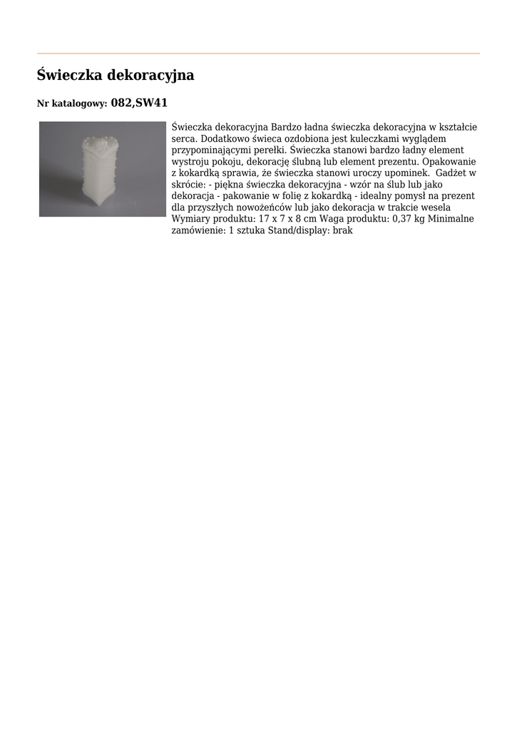 Świeczka dekoracyjna Nr katalogowy: 082,SW41 Świeczka dekoracyjna Bardzo ładna świeczka dekoracyjna w kształcie serca. Dodatkowo świeca ozdobiona jest kuleczkami wyglądem przypominającymi perełki. Świeczka stanowi bardzo ładny element wystroju pokoju, dekorację ślubną lub element prezentu. Opakowanie z kokardką sprawia, że świeczka stanowi uroczy upominek. Gadżet w skrócie: - piękna świeczka dekoracyjna - wzór na ślub lub jako dekoracja - pakowanie w folię z kokardką - idealny pomysł na prezent dla przyszłych nowożeńców lub jako dekoracja w trakcie wesela Wymiary produktu: 17 x 7 x 8 cm Waga produktu: 0,37 kg Minimalne zamówienie: 1 sztuka Stand/display: brak