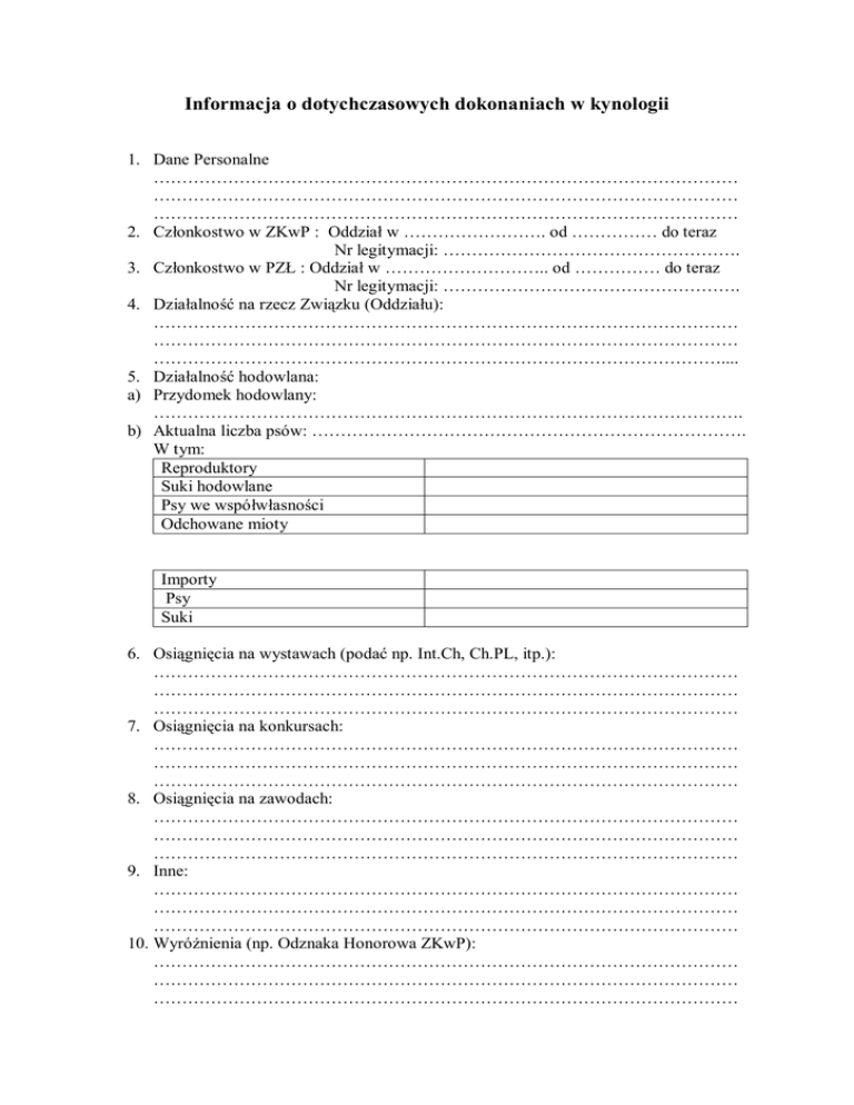 Informacja o dotychczasowych dokonaniach w kynologii 1. Dane Personalne ………………………………………………………………………………………… ………………………………………………………………………………………… ………………………………………………………………………………………… 2. Członkostwo w ZKwP : Oddział w ……………………. od …………… do teraz Nr legitymacji: ……………………………………………. 3. Członkostwo w PZŁ : Oddział w ……………………….. od …………… do teraz Nr legitymacji: ……………………………………………. 4. Działalność na rzecz Związku (Oddziału): ………………………………………………………………………………………… ………………………………………………………………………………………… ……………………………………………………………………………………….... 5. Działalność hodowlana: a) Przydomek hodowlany: …………………………………………………………………………………………. b) Aktualna liczba psów: …………………………………………………………………. W tym: Reproduktory Suki hodowlane Psy we współwłasności Odchowane mioty Importy Psy Suki 6. Osiągnięcia na wystawach (podać np. Int.Ch, Ch.PL, itp.): ………………………………………………………………………………………… ………………………………………………………………………………………… ………………………………………………………………………………………… 7. Osiągnięcia na konkursach: ………………………………………………………………………………………… ………………………………………………………………………………………… ………………………………………………………………………………………… 8. Osiągnięcia na zawodach: ………………………………………………………………………………………… ………………………………………………………………………………………… ………………………………………………………………………………………… 9. Inne: ………………………………………………………………………………………… ………………………………………………………………………………………… ………………………………………………………………………………………… 10. Wyróżnienia (np. Odznaka Honorowa ZKwP): ………………………………………………………………………………………… ………………………………………………………………………………………… …………………………………………………………………………………………