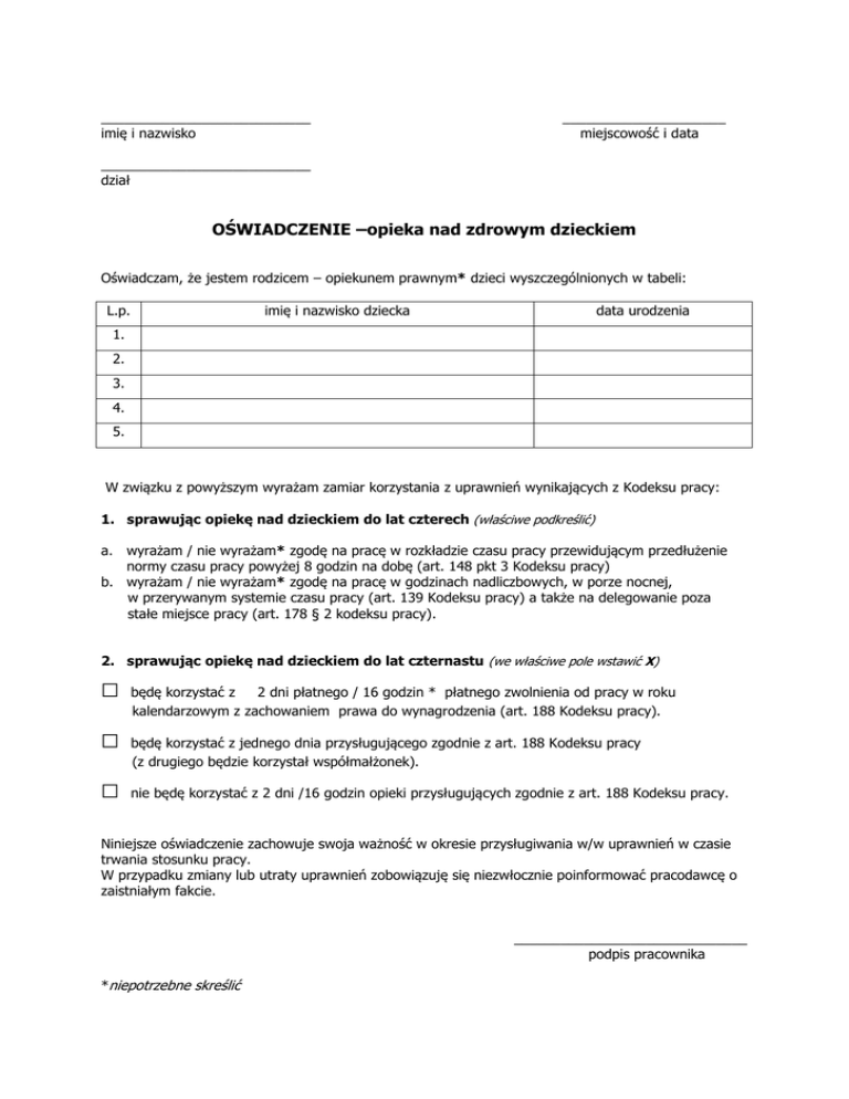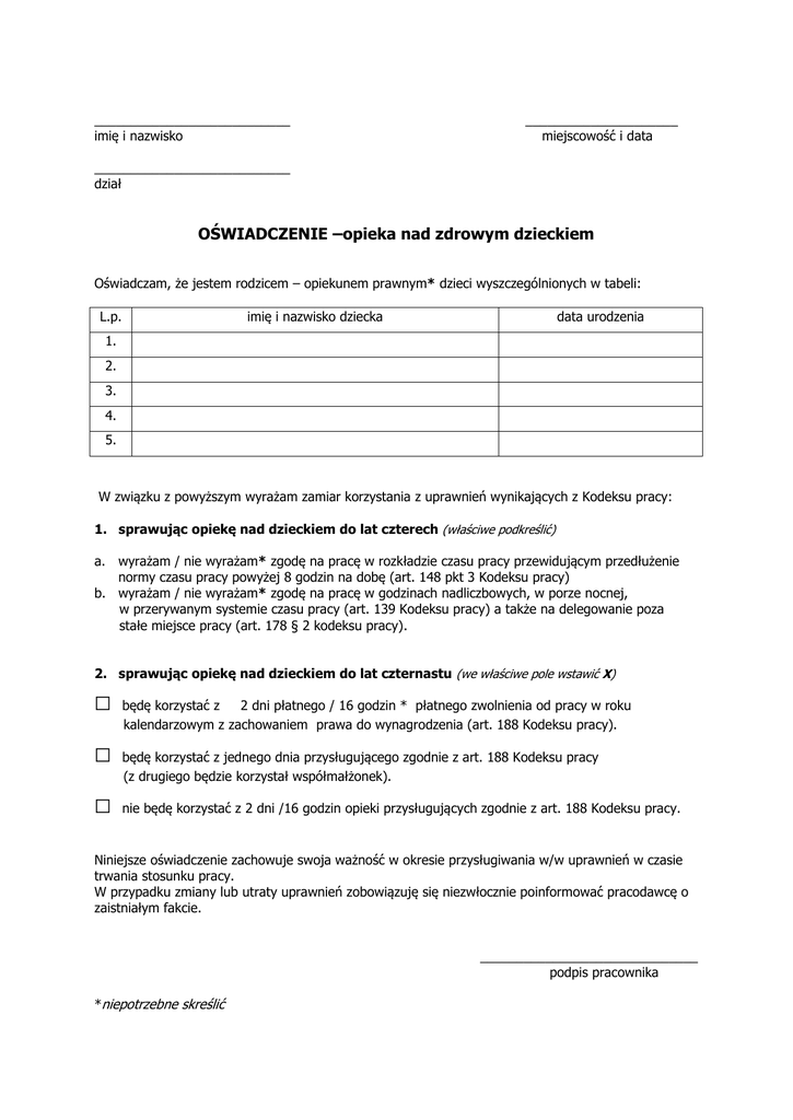 ___________________________ imię i nazwisko _____________________ miejscowość i data ___________________________ dział OŚWIADCZENIE –opieka nad zdrowym dzieckiem Oświadczam, że jestem rodzicem – opiekunem prawnym* dzieci wyszczególnionych w tabeli: L.p. imię i nazwisko dziecka data urodzenia 1. 2. 3. 4. 5. W związku z powyższym wyrażam zamiar korzystania z uprawnień wynikających z Kodeksu pracy: 1. sprawując opiekę nad dzieckiem do lat czterech (właściwe podkreślić) a. wyrażam / nie wyrażam* zgodę na pracę w rozkładzie czasu pracy przewidującym przedłużenie normy czasu pracy powyżej 8 godzin na dobę (art. 148 pkt 3 Kodeksu pracy) b. wyrażam / nie wyrażam* zgodę na pracę w godzinach nadliczbowych, w porze nocnej, w przerywanym systemie czasu pracy (art. 139 Kodeksu pracy) a także na delegowanie poza stałe miejsce pracy (art. 178 § 2 kodeksu pracy). 2. sprawując opiekę nad dzieckiem do lat czternastu (we właściwe pole wstawić X) □ □ □ będę korzystać z 2 dni płatnego / 16 godzin * płatnego zwolnienia od pracy w roku kalendarzowym z zachowaniem prawa do wynagrodzenia (art. 188 Kodeksu pracy). będę korzystać z jednego dnia przysługującego zgodnie z art. 188 Kodeksu pracy (z drugiego będzie korzystał współmałżonek). nie będę korzystać z 2 dni /16 godzin opieki przysługujących zgodnie z art. 188 Kodeksu pracy. Niniejsze oświadczenie zachowuje swoja ważność w okresie przysługiwania w/w uprawnień w czasie trwania stosunku pracy. W przypadku zmiany lub utraty uprawnień zobowiązuję się niezwłocznie poinformować pracodawcę o zaistniałym fakcie. ______________________________ podpis pracownika *niepotrzebne skreślić