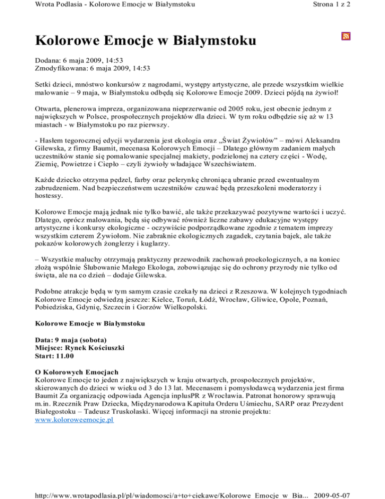 Wrota Podlasia - Kolorowe Emocje w Białymstoku Strona 1 z 2 Kolorowe Emocje w Białymstoku Dodana: 6 maja 2009, 14:53 Zmodyfikowana: 6 maja 2009, 14:53 Setki dzieci, mnóstwo konkursów z nagrodami, występy artystyczne, ale przede wszystkim wielkie malowanie – 9 maja, w Białymstoku odbędą się Kolorowe Emocje 2009. Dzieci pójdą na żywioł! Otwarta, plenerowa impreza, organizowana nieprzerwanie od 2005 roku, jest obecnie jednym z największych w Polsce, prospołecznych projektów dla dzieci. W tym roku odbędzie się aż w 13 miastach - w Białymstoku po raz pierwszy. - Hasłem tegorocznej edycji wydarzenia jest ekologia oraz „Świat Żywiołów” – mówi Aleksandra Gilewska, z firmy Baumit, mecenasa Kolorowych Emocji – Dlatego głównym zadaniem małych uczestników stanie się pomalowanie specjalnej makiety, podzielonej na cztery cz ęści - Wodę, Ziemię, Powietrze i Ciepło – czyli żywioły władające Wszechświatem. Każde dziecko otrzyma pędzel, farby oraz pelerynkę chroniącą ubranie przed ewentualnym zabrudzeniem. Nad bezpieczeństwem uczestników czuwać będą przeszkoleni moderatorzy i hostessy. Kolorowe Emocje mają jednak nie tylko bawić, ale także przekazywać pozytywne warto ści i uczyć. Dlatego, oprócz malowania, będą się odbywać również liczne zabawy edukacyjne występy artystyczne i konkursy ekologiczne - oczywiście podporządkowane zgodnie z tematem imprezy wszystkim czterem Żywiołom. Nie zabraknie ekologicznych zagadek, czytania bajek, ale także pokazów kolorowych żonglerzy i kuglarzy. – Wszystkie maluchy otrzymają praktyczny przewodnik zachowań proekologicznych, a na koniec złożą wspólnie Ślubowanie Małego Ekologa, zobowiązując się do ochrony przyrody nie tylko od święta, ale na co dzień – dodaje Gilewska. Podobne atrakcje będą w tym samym czasie czeka ły na dzieci z Rzeszowa. W kolejnych tygodniach Kolorowe Emocje odwiedzą jeszcze: Kielce, Toruń, Łódź, Wrocław, Gliwice, Opole, Poznań, Pobiedziska, Gdynię, Szczecin i Gorzów Wielkopolski. Kolorowe Emocje w Bia łymstoku Data: 9 maja (sobota) Miejsce: Rynek Kościuszki Start: 11.00 O Kolorowych Emocjach Kolorowe Emocje to jeden z największych w kraju otwartych, prospołecznych projektów, skierowanych do dzieci w wieku od 3 do 13 lat. Mecenasem i pomysłodawcą wydarzenia jest firma Baumit Za organizację odpowiada Agencja inplusPR z Wrocławia. Patronat honorowy sprawują m.in. Rzecznik Praw Dziecka, Międzynarodowa Kapituła Orderu Uśmiechu, SARP oraz Prezydent Białegostoku – Tadeusz Truskolaski. Więcej informacji na stronie projektu: www.koloroweemocje.pl http://www.wrotapodlasia.pl/pl/wiadomosci/a+to+ciekawe/Kolorowe_Emocje_w_Bia ... 2009-05-07