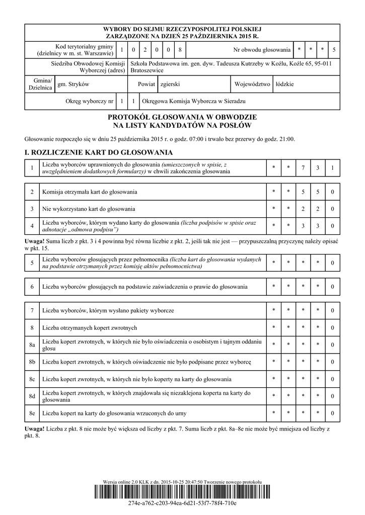 WYBORY DO SEJMU RZECZYPOSPOLITEJ POLSKIEJ ZARZĄDZONE NA DZIEŃ 25 PAŹDZIERNIKA 2015 R. Kod terytorialny gminy (dzielnicy w m. st. Warszawie) 1 0 2 0 0 8 Nr obwodu głosowania * * * 5 Siedziba Obwodowej Komisji Szkoła Podstawowa im. gen. dyw. Tadeusza Kutrzeby w Koźlu, Koźle 65, 95-011 Wyborczej (adres) Bratoszewice Gmina/ gm. Stryków Dzielnica Powiat zgierski Okręg wyborczy nr 1 1 Województwo łódzkie Okręgowa Komisja Wyborcza w Sieradzu PROTOKÓŁ GŁOSOWANIA W OBWODZIE NA LISTY KANDYDATÓW NA POSŁÓW Głosowanie rozpoczęło się w dniu 25 października 2015 r. o godz. 07:00 i trwało bez przerwy do godz. 21:00. I. ROZLICZENIE KART DO GŁOSOWANIA 1 Liczba wyborców uprawnionych do głosowania (umieszczonych w spisie, z uwzględnieniem dodatkowych formularzy) w chwili zakończenia głosowania * * 7 3 1 2 Komisja otrzymała kart do głosowania * * 5 5 0 3 Nie wykorzystano kart do głosowania * * 2 2 0 4 Liczba wyborców, którym wydano karty do głosowania (liczba podpisów w spisie oraz adnotacje „odmowa podpisu”) * * 3 3 0 Uwaga! Suma liczb z pkt. 3 i 4 powinna być równa liczbie z pkt. 2, jeśli tak nie jest — przypuszczalną przyczynę należy opisać w pkt. 15. 5 Liczba wyborców głosujących przez pełnomocnika (liczba kart do głosowania wydanych na podstawie otrzymanych przez komisję aktów pełnomocnictwa) * * * * 0 6 Liczba wyborców głosujących na podstawie zaświadczenia o prawie do głosowania * * * * 0 7 Liczba wyborców, którym wysłano pakiety wyborcze * * * * 0 8 Liczba otrzymanych kopert zwrotnych * * * * 0 8a Liczba kopert zwrotnych, w których nie było oświadczenia o osobistym i tajnym oddaniu głosu * * * * 0 8b Liczba kopert zwrotnych, w których oświadczenie nie było podpisane przez wyborcę * * * * 0 8c Liczba kopert zwrotnych, w których nie było koperty na karty do głosowania * * * * 0 8d Liczba kopert zwrotnych, w których znajdowała się niezaklejona koperta na karty do głosowania * * * * 0 8e Liczba kopert na karty do głosowania wrzuconych do urny * * * * 0 Uwaga! Liczba z pkt. 8 nie może być większa od liczby z pkt. 7. Suma liczb z pkt. 8a–8e nie może być mniejsza od liczby z pkt. 8. Wersja online 2.0 KLK z dn. 2015-10-25 20:47:50 Tworzenie nowego protokołu 274e-a762-c203-94ea-6d21-53f7-78f4-710e -2- II. USTALENIE WYNIKÓW GŁOSOWANIA Komisja stwierdziła, że pieczęcie na urnie pozostały nienaruszone. Po wyjęciu kart z urny Komisja ustaliła na ich podstawie następujące wyniki głosowania: 9 Liczba kart wyjętych z urny * * 3 3 0 9a w tym liczba kart wyjętych z kopert na karty do głosowania * * * * 0 Uwaga! Liczba z pkt. 9 pomniejszona o liczbę z pkt. 9a powinna być równa liczbie z pkt. 4. Dodatkowo liczba z pkt. 9a nie powinna być większa od liczby z pkt. 8e; jeśli tak nie jest — przypuszczalną przyczynę należy opisać w pkt. 16. 10 Liczba kart nieważnych (innych niż urzędowo ustalone lub nieopatrzonych pieczęcią obwodowej komisji wyborczej) * * * * 0 11 Liczba kart ważnych * * 3 3 0 Uwaga! Suma liczb z pkt. 10 i 11 musi być równa liczbie z pkt. 9. Jeśli w pkt. 10 liczba jest większa niż 0, przyczynę należy opisać w pkt. 17. 12 Liczba głosów nieważnych (z kart ważnych) * * * 1 7 12a w tym z powodu postawienia znaku „X” obok nazwiska dwóch lub większej liczby kandydatów z różnych list * * * 1 0 12b w tym z powodu niepostawienia znaku „X” obok nazwiska żadnego kandydata z którejkolwiek z list * * * * 7 12c w tym z powodu postawienia znaku „X” wyłącznie obok nazwiska kandydata z listy, której rejestracja została unieważniona (art. 227 § 3 Kodeksu) * * * * 0 * * 3 1 3 Uwaga! Suma liczba z pkt. 12a do 12c musi być równa lub mniejsza od liczby z pkt. 12. 13 Liczba głosów ważnych oddanych łącznie na wszystkie listy kandydatów (z kart ważnych) Uwaga! Suma liczb z pkt. 12 i 13 musi być równa liczbie z pkt. 11. 14. Na poszczególne listy kandydatów na posłów i umieszczonych na nich kandydatów na posłów oddano następujące liczby głosów ważnych: Lista nr 1 - KW Prawo i Sprawiedliwość Liczba głosów ważnych oddanych na listę: * * 1 5 8 Na poszczególnych kandydatów z tej listy oddano następujące liczby głosów ważnych: 1. WASZCZYKOWSKI Witold Jan * * * 2 4 2. SCHREIBER Grzegorz Zenon * * * * 8 3. MATEUSIAK-PIELUCHA Beata Anna * * * * 9 4. WOŹNIAK Tadeusz Jacek * * * * 5 5. MATUSZEWSKI Marek * * * 8 4 6. POLAK Piotr Stanisław * * * * 0 7. CIEBIADA Krzysztof * * * * 2 Wersja online 2.0 KLK z dn. 2015-10-25 20:47:50 Tworzenie nowego protokołu 274e-a762-c203-94ea-6d21-53f7-78f4-710e -38. RZEPECKI Łukasz Adrian * * * 1 3 9. ŚMIAŁEK Jolanta Krystyna * * * * 2 10. KAŹMIERCZAK Wieńczysław Jerzy * * * * 1 11. RYCHLIK Paweł Piotr * * * * 1 12. PAPROTA Katarzyna * * * * 1 13. ŚNIEGULA Andrzej Henryk * * * * 1 14. DYRGOŃ-BIAŁOWĄS Anna Elżbieta * * * * 0 15. KŁOPOTOWSKI Konrad * * * * 0 16. PRAŻNOWSKA Sylwia * * * * 0 17. ZNYK Marek Paweł * * * * 0 18. WRZAŁA Sylwia Marianna * * * * 1 19. DRABIK Marek * * * * 0 20. ZALEWSKI Piotr Andrzej * * * * 3 21. HENKE Elżbieta * * * * 1 22. KOCHAŃSKA Joanna Aneta * * * * 1 23. SZCZEPAŃCZYK Ewa Eugenia * * * * 1 24. KRZAK Michał Bazyli * * * * 0 * * 1 5 8 Razem Uwaga! Suma głosów oddanych na wszystkich kandydatów z danej listy (rubryka „Razem”) równa się liczbie głosów ważnych oddanych na tę listę. Wyjątek od tej zasady może dotyczyć listy, na której znajduje się nazwisko kandydata skreślonego z listy. Lista nr 2 - KW Platforma Obywatelska RP Liczba głosów ważnych oddanych na listę: * * * 4 1 Na poszczególnych kandydatów z tej listy oddano następujące liczby głosów ważnych: 1. TOMCZYK Cezary Józef * * * * 8 2. HANAJCZYK Agnieszka Małgorzata * * * * 4 3. STĘPIEŃ Witold Heronim * * * * 1 4. SIKORA Jacek * * * * 0 Wersja online 2.0 KLK z dn. 2015-10-25 20:47:50 Tworzenie nowego protokołu 274e-a762-c203-94ea-6d21-53f7-78f4-710e -45. SZKOPIŃSKA Iwona Barbara 