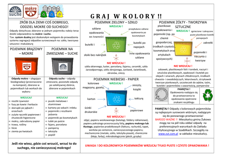 G R A J W K O L O R Y !! ZRÓB DLA ZIEMI COŚ DOBREGO, ODDZIEL MOKRE OD SUCHEGO! Odpady dotychczas zbierane w jednym pojemniku należy teraz dzielić odpowiednio na mokre i suche. Tzw. system dualny jest doskonałym wstępem do prowadzenia systemu segregacji odpadów surowcowych na: szkło, tworzywa sztuczne i makulaturę POJEMNIK BRĄZOWY – MOKRE POJEMNIK NA ZMIESZANE – SUCHE POJEMNIK ZIELONY – SZKŁO szklane opakowania po żywności WRZUCAJ ! przepłukane szklane opakowania po kosmetykach butelki po napojach butelki i inne opakowania szklane słoiki bez nakrętek NIE WRZUCAJ ! szkła okiennego, luster, porcelany, fajansu, ceramiki, szkła żaroodpornego, szkła zbrojonego, żarówek, świetlówek, ekranów, zniczy • • • • • • • • Odpady mokre – ulegające biodegradacji (przeznaczone na kompost), zbierane w pojemnikach lub workach do wyboru Odpady suche – odpady zmieszane, pozostałe odpady po selektywnej zbiórce, zbierane w pojemnikach WRZUCAJ! resztki żywności fusy po kawie i herbacie skorupki po jajkach i orzechach zużyte ręczniki papierowe i chusteczki higieniczne mokry, zabrudzony papier trawa, rośliny liście ziemia po kwiatach WRZUCAJ! puszki metalowe i aluminiowe kartony po sokach i mleku pojemniki z resztkami jedzenia pojemniki po kosmetykach tubki po paście fajans, porcelana pampersy tekstylia popiół POJEMNIK NIEBIESKI - PAPIER kolorowe magazyny, gazety, WRZUCAJ ! zeszyty, książki czasopisma • • • • • • • • • Jeśli nie wiesz, gdzie coś wrzucić, wrzuć to do suchego, nie zanieczyszczaj mokrego! tekturę karton y ścinki drukarskie NIE WRZUCAJ ! papierowe torby zdjęć, papieru woskowanego (katalogi, foldery reklamowe), papieru pokrytego przezroczystą folią, papieru mokrego lub tłustego, papierów przebitkowych (faktury, rachunki), tapet, worków po cemencie, zanieczyszczonego papieru; mechanicznie (metale, szkło, tekstylia piasek), chemicznie (kleje, farby), mikrobiologicznie (pleśń, grzyby) POJEMNIK ŻÓŁTY - TWORZYWA plastikowe SZTUCZNE opakowania i WRZUCAJ ! zgniecione i zakręcone pojemniki (np. po puste plastikowe butelki ponapojach chemii gospodarczej, zakrętki środkach czystości, kosmetykach oraz pojemniki i artykułach naczynia z spożywczych) tworzyw NIE WRZUCAJ ! sztucznych zabawek, plastikowych folii i torebek, naczyń i sztućców plastikowych, opakowań i butelek po: olejach i smarach, płynach chłodniczych, środkach chwasto- i owadobójczych, lekarstwach, strzykawek tworzyw piankowych, szczoteczek do zębów, taśm, butelek i pojemników z zawartością, pampersów PAMIĘTAJ ! Opakowania nadające się do przetworzenia to opakowania opatrzone znakami recyklingu PAMIĘTAJ ! Odpady z kolorowych pojemników są najlepszym surowcem wtórnym, nadającym się do ponownego przetworzenia! BARDZO WAŻNE !! Mieszkańcy gminy Żukowo mogą raz na pół roku oddać odpady na preferencyjnych warunkach do Zakładu Utylizacyjnego w Szadółkach. Szczegóły na www.zut.com.pl w zakładce mieszkańcy. UWAGA ! DO KOLOROWYCH POJEMNIKÓW WRZUCAJ TYLKO PUSTE I CZYSTE OPAKOWANIA ! SEGREGUJESZ ? – PŁACISZ MNIEJ! CZY WIESZ ŻE ? • Nie segreguję – płacę co najmniej 2 razy więcej • • • Mieszkańcy, którzy nie zdecydują się na segregację odpadów tj. nie będą sortować odpadów na suche, mokre lub dodatkowo na szkło, tworzywa sztuczne, makulaturę, a będą wrzucać wszystkie odpady do jednego pojemnika zapłacą nawet do 100% więcej. PONADTO W RAMACH AKCJI OD MIESZKAŃCÓW ODBIERANE SĄ NASTĘPUJĄCE RODZAJE ODPADÓW: NIEBEZPIECZNE o termometry, lampy rtęciowe, świetlówki o środki ochrony roślin i ich opakowania o rozpuszczalniki, odczynniki chemiczne o farby, lakiery oraz opakowania po nich o smary, środki do konserwacji drewna i metali o zużyty sprzęt elektryczny i elektroniczny o zużyte baterie i akumulatory o przeterminowane lub częściowo wykorzystane leki o przepracowane oleje BUDOWLANE I ROZBIÓRKOWE o odpady pochodzące z remontów gospodarstw domowych WIELKOGABARYTOWE o odpady nie mieszczące się w pojemnikach na odpady, głównie meble METALE UWAGA! W RAMACH „OPŁATY ŚMIECIOWEJ” NIE SĄ ODBIERANE: • azbest, papa • odpady nieoznaczone, niemożliwe do zidentyfikowania • odpady wskazujące na źródło pochodzenia inne niż gospodarstwo domowe Szkło to wszechstronny surowiec, jednak jego produkcja pochłania dużo energii. Produkcja szkła ze stłuczki szklanej jest znacznie mniej energochłonna. Szkło nie ulega rozkładowi, może jednak być przetwarzane nieograniczoną ilość razy. Z odzyskanej stłuczki szklanej można wyprodukować nowe butelki, włókna izolacyjne, watę szklaną i wiele innych. Ze 100 ton makulatury można wytworzyć aż 90 ton papieru, co pozwala oszczędzić ok. 1530 drzew. Tworzywa sztuczne, tzw. plastik wytwarza się z ropy naftowej. Plastikowa butelka, wyrzucona np. do lasu, rozkłada się ok. 500 lat. W czasie tego powolnego rozkładu uwalniają się toksyczne związki chemiczne, które przenikają do gleby i wód gruntowych. Niekontrolowane spalanie tego rodzaju tworzyw jest również bardzo niebezpieczne, gdyż prowadzi do powstawania substancji trujących i rakotwórczych, np. dioksyn i furanów. Plastik, w szczególności PET, bardzo łatwo poddaje się powtórnemu przetworzeniu. Wytwarza się z niego m. in. włókna i przędze (w tym przędza dywanowa i tekstylna, z której produkuje się np. popularne polary), płyty i folie (do formowania tacek, pojemników, pudełek), meble, części wyposażenia wnętrz samochodów, itp. OD 1 LIPCA 2013 ROKU NOWY SYSTEM SEGREGOWANIA ODPADÓW w GMINIE ŻUKOWO NIE TRUJ ! NIE SPALAJ ! NIE WYRZUCAJ DO LASU ! ODDAJ DO ZAKŁADU !!! ZA SPALANIE ODPADÓW W DOMOWYCH PIECACH GROZI KARA ARESZTU LUB GRZYWNY Spalanie odpadów komunalnych w domowych piecach powoduje niekontrolowane wprowadzanie do atmosfery bardzo trujących substancji: Dioxyny i furany – to jeden z najsilniejszych trucizn, jakie znamy. Wy