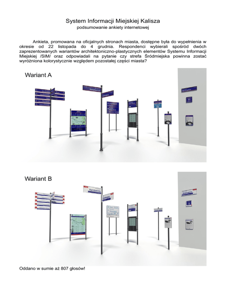 System Informacji Miejskiej Kalisza podsumowanie ankiety internetowej Ankieta, promowana na oficjalnych stronach miasta, dostępne była do wypełnienia w okresie od 22 listopada do 4 grudnia. Respondenci wybierali spośród dwóch zaprezentowanych wariantów architektoniczno-plastycznych elementów Systemu Informacji Miejskiej /SIM/ oraz odpowiadali na pytanie czy strefa Śródmiejska powinna zostać wyróżniona kolorystycznie względem pozostałej części miasta? Oddano w sumie aż 807 głosów! Wyniki głosowania Pytanie 1: Wskaż wariant, który - Twoim zdaniem - powinien zostać wdrożony w Kaliszu. 2% 1% 34% Wariant A Wariant B Żaden Nie mam zdania 63% Ogólne głosy 2% 2% 45% Wariant A Wariant B Żaden 51% Nie mam zdania Głosy kobiet 2% 1% 27% Wariant A Wariant B Żaden Nie mam zdania 70% Głosy mężczyzn Pytanie 2: Czy strefa Śródmiejska, Twoim zdaniem, powinna zostać wyróżniona kolorystycznie względem pozostałej części miasta? 2% 40% Tak Nie 58% Nie mam zdania Ogólne głosy 1% 45% Tak 54% Nie Nie mam zdania Głosy kobiet 0% 38% Tak Nie 62% Głosy mężczyzn Nie mam zdania Respondenci mieli również możliwość zgłoszenia swoich uwag i opinii. Wśród powtarzających się opinii, i to zarówno głosujących na wariant A jak i wariant B, dominuje pogląd, że tablice z nazwami ulic powinny zawierać informację o nazwie dzielnicy/obszaru. Powtarza się również sugestia, aby tablice kierujące kierowców w wariancie B dostosować plastycznie do pozostałych elementów systemu, a nie do znaków drogowych jak to jest obecnie. Próba badawcza i jej charakterystyka W badaniu wzięło udział 807 osób, które poza odpowiedziami na temat Systemu Informacji Miejskiej Kalisza udzielały również informacji na temat swojej płci, wieku (w podziale na pięć grup wiekowych) oraz miejsca zamieszkania (w podziale na mieszkańców Kalisza oraz pozostałych). 2% 37% kobiety mężczyźni b.d. 61% Płeć respondentów 2% 2% 7% 22% 26% 18 lat i mniej 19-25 lat 26-39 lat 40-65 lat 66 lat i więcej b.d. 41% Wiek respondentów 13% 2% mieszkaocy Kalisza pozostali b.d. 85% Miejsce zamieszkania respondentów Podsumowanie Respondenci wyraźnie wskazali na wariant B, który „zwyciężył” również przy analizie pod kątem płci, wieku (w najstarszej grupie wiekowej podział głosów był prawie pół na pół) i miejsca zamieszkania głosujących. Również odpowiedź na pytanie o zasadność wyróżnienia kolorystycznego strefy Śródmiejskiej była twierdząca w każdej, wyodrębnionej grupie respondentów, chociaż w tym przypadku w grupie wiekowej 40-65 lat rozkład głosów był praktycznie identyczny. Mając na uwadze wskazanie wariantu B do dalszych prac projektowych oraz zgłoszone uwagi należy rozważyć opracowanie tablic kierujących kierowców z treścią dostosowaną do pozostałych elementów SIM.