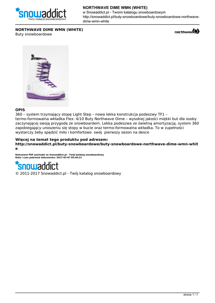 NORTHWAVE DIME WMN (WHITE) w Snowaddict.pl - Twoim katalogu snowboardowym http://snowaddict.pl/buty-snowboardowe/buty-snowboardowe-northwavedime-wmn-white NORTHWAVE DIME WMN (WHITE) Buty snowboardowe OPIS 360 – system trzymający stopę Light Step – nowa lekka konstrukcja podeszwy TF1 – termo-formowalna wkładka Flex: 4/10 Buty Northwave Dime – wysokiej jakości miękki but dla osoby zaczynającej swoją przygodę ze snowboardem. Lekka podeszwa ze świetną amortyzacją, system 360 zapobiegający unoszeniu się stopy w bucie oraz termo-formowalna wkładka. To w zupełności wystarczy żeby spędzić miło i komfortowo swój pierwszy sezon na desce Więcej na temat tego produktu pod adresem: http://snowaddict.pl/buty-snowboardowe/buty-snowboardowe-northwave-dime-wmn-whit e Dokument PDF pochodzi ze Snowaddict.pl - Twój katalog snowboardowy Data i czas pobrania dokumentu: 2017-03-07 05:46:21 © 2011-2017 Snowaddict.pl - Twój katalog snowboardowy strona 1 / 1 Powered by TCPDF (www.tcpdf.org)