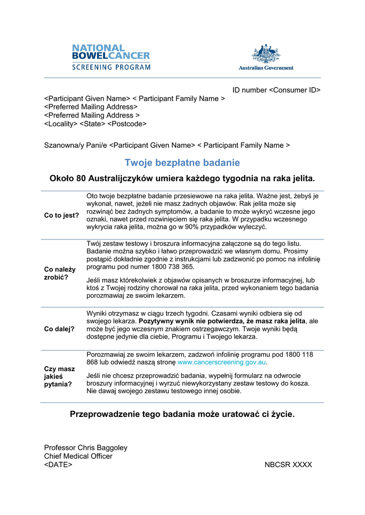 ID number <Consumer ID> <Participant Given Name> < Participant Family Name > <Preferred Mailing Address> <Preferred Mailing Address > <Locality> <State> <Postcode> Szanowna/y Pani/e <Participant Given Name> < Participant Family Name > Twoje bezpłatne badanie Około 80 Australijczyków umiera każdego tygodnia na raka jelita. Co to jest? Co należy zrobić? Co dalej? Czy masz jakieś pytania? Oto twoje bezpłatne badanie przesiewowe na raka jelita. Ważne jest, żebyś je wykonał, nawet, jeżeli nie masz żadnych objawów. Rak jelita może się rozwinąć bez żadnych symptomów, a badanie to może wykryć wczesne jego oznaki, nawet przed rozwinięciem się raka jelita. W przypadku wczesnego wykrycia raka jelita, można go w 90% przypadków wyleczyć. Twój zestaw testowy i broszura informacyjna załączone są do tego listu. Badanie można szybko i łatwo przeprowadzić we własnym domu. Prosimy postąpić dokładnie zgodnie z instrukcjami lub zadzwonić po pomoc na infolinię programu pod numer 1800 738 365. Jeśli masz którekolwiek z objawów opisanych w broszurze informacyjnej, lub ktoś z Twojej rodziny chorował na raka jelita, przed wykonaniem tego badania porozmawiaj ze swoim lekarzem. Wyniki otrzymasz w ciągu trzech tygodni. Czasami wyniki odbiera się od swojego lekarza. Pozytywny wynik nie potwierdza, że masz raka jelita, ale może być jego wczesnym znakiem ostrzegawczym. Twoje wyniki będą dostępne jedynie dla ciebie, Programu i Twojego lekarza. Porozmawiaj ze swoim lekarzem, zadzwoń infolinię programu pod 1800 118 868 lub odwiedź naszą stronę www.cancerscreening.gov.au. Jeśli nie chcesz przeprowadzić badania, wypełnij formularz na odwrocie broszury informacyjnej i wyrzuć niewykorzystany zestaw testowy do kosza. Nie dawaj swojego zestawu testowego innej osobie. Przeprowadzenie tego badania może uratować ci życie. Professor Chris Baggoley Chief Medical Officer <DATE> NBCSR XXXX