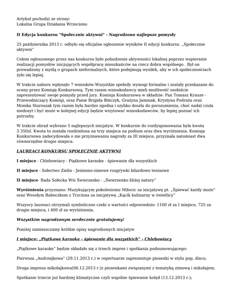 Artykuł pochodzi ze strony: Lokalna Grupa Działania Wrzeciono II Edycja konkursu "Społecznie aktywni" - Nagrodzono najlepsze pomysły 25 października 2013 r. odbyło się oficjalne ogłoszenie wyników II edycji konkursu „Społecznie aktywni” Celem ogłoszonego przez nas konkursu było pobudzenie aktywności lokalnej poprzez wspieranie realizacji pomysłów inicjujących współpracę mieszkańców na rzecz dobra wspólnego . Był on prowadzony z myślą o grupach nieformalnych, które podejmują wysiłek, aby w ich społecznościach żyło się lepiej. W trakcie naboru wpłynęło 7 wniosków.Wszystkie spełniły wymogi formalne i zostały przekazane do oceny przez Komisję Konkursową. Tym razem wnioskodawcy mieli możliwość osobiście zaprezentować swoje pomysły przed jury. Komisja Konkursowa w składzie: Pan Tomasz Krauze Przewodniczący Komisji, oraz Panie Brigida Bińczyk, Grażyna Jamniak, Krystyna Podraża oraz Monika Staroszak tym razem była bardzo zgodna i szybko doszła do porozumienia, choć nadal czuła niedosyt i być może w kolejnej edycji będzie wizytować wnioskodawców, by lepiej poznać ich potrzeby. W trakcie obrad wybrano 5 najlepszych inicjatyw. W konkursie do rozdysponowania była kwota 3 350zl. Kwota to została rozdzielona na trzy miejsca na podium oraz dwa wyróżnienia. Komisja Konkursowa zadecydowała o nie przyznawaniu nagrody za III miejsce, przyznała natomiast dwa równorzędne drugie miejsca. LAUREACI KONKURSU SPOŁECZNIE AKTYWNI I miejsce - Chlebowiacy - Piątkowe karaoke - śpiewanie dla wszystkich II miejsce - Sołectwo Zielin - Jesienno-zimowe rozgrywki bilardowo tenisowe II miejsce- Rada Sołecka Wsi Świerzenko - „Świerzenko bliżej natury” Wyróżnienia przyznano: Muzykującym pokoleniomz Miłocic za inicjatywę pt. „Śpiewać każdy może” oraz Wesołym Babeczkom z Trzcinna za inicjatywę „Kącik kulinarny w świetlicy” Wszyscy laureaci otrzymali symboliczne czeki o wartości odpowiednio: 1100 zł za I miejsce, 725 za drugie miejsca, i 400 zł za wyróżnienia. Wszystkim nagrodzonym serdecznie gratulujemy! Poniżej zamieszczamy krótkie opisy nagrodzonych inicjatyw I miejsce: „Piątkowe karaoke - śpiewanie dla wszystkich” - Chlebowiacy „Piątkowe karaoke” będzie składało się z trzech imprez i spotkania podsumowującego: Pierwsza „Andrzejkowa” (29.11.2013 r.) w repertuarze zaprezentuje piosenki w stylu pop, disco; Druga impreza mikołajkowa(06.12.2013 r.)z piosenkami związanymi z tematyką zimową i mikołajem; Spotkanie trzecie już bardziej klimatyczne czyli wspólne śpiewanie kolęd (13.12.2013 r.); Spotkanie podsumowujące projekt (30.12.2013 r.); Ponadto cotygodniowe codzienne spotkania w świetlicy na próbach i przygotowaniach do w/w imprez i spotkań w godz.16.00-19.00. II miejsce: „Jesienno-zimowe rozgrywki bilardowo-tenisowe” - Sołectwo Zielin Nasza inicjatywa polega na zorganizowaniu rozgrywek bilardowo – tenisowych dla mieszkańców sołectwa Zielin. Rozgrywki odbywać się będą w dwóch grupach wiekowych: dzieci i młodzież oraz dorośli i seniorzy, z których wyłonimy po trzy najlepsze osoby z grupy. Zajęcia odbywać się będą od 12 listopada do 15 grudnia trzy razy w tygodniu, nad którymi czuwać będzie sołtys. Przewidujemy około 50 uczestników rozgrywek. Zwieńczeniem naszej inicjatywy będzie uroczyste wręczenie nagród najlepszym sportowcom naszego sołectwa. II miejsce: „Świerzenko bliżej natury” - Rada Sołecka Wsi Świerzenko Na głównej ścianie świetlicy zostanie namalowany plan Świerzenka i okolicznych miejsc gdzie warto spędzać czas. Zostaną tam wskazane punkty gdzie można znaleźć gatunki roślin będących pod ochroną, lęgowiska ptaków, jeziora i ścieżki rowerowe oraz miejsca, które warte są uwagi mieszkańców czy turystów. Wszystkie te punkty zostaną oznakowane specjalnymi tablicami informacyjnymi, z których będzie się można dowiedzieć ważnych kwestii na temat tych miejsc. Wyróżnienie: „Śpiewać każdy może” - Muzykujące pokolenia (Miłocice) Zależy nam na dobrych warunkach do śpiewania, chodzi tutaj głównie o ćwiczenie i doskonalenie umiejętności artystycznych różnych pokoleń wiekowych, chcemy stworzyć miejsce, gdzie będzie można podnosić swoje umiejętności wokalne i fajnie spędzać czas przy różnych imprezach okolicznościowych. Każdy, kto tylko potrafi śpiewać wie, że trudno o silniejsze doznania podczas wykonywania muzyki jak te, które płyną bezpośrednio z naszego ciała. Śpiew zdecydowanie wiedzie tu prym. Nasz śpiew na imprezach bywa elementem centralnym, zasadniczym, głównym i w danym momencie pierwszoplanowym. Bywa też czasem swoistym łącznikiem, umożliwiającym płynne przejście od jednego punktu programu do następnych, pozwala na dotarcie do każdego człowieka. Jest też oczywistym towarzyszem wszelkich życzeń, wyrazów wdzięczności, smutków i ludzkiej krzywdy. Program szczegółowy: 1. Spotkania cotygodniowe w zespołach i kołach – godz.16.30-20.00 2. Przygotowanie do Giełdy Piosenki w Miastku 3. Koncert kolęd i pastorałek w Miastku i Miłocicach Wyróżnienie: „Kącik kulinarny w świetlicy” - Wesołe Babeczki (Trzcinno) Jako grupa chcemy stworzyć „Kącik kulinarny”, do którego potrzebne będą: kuchenka gazowa wraz z piekarnikiem, mikser do ciasta, dwie blachy do ciast i miski do mieszania produktów. Program jest skierowany dla całej społeczności sołectwa Dretynek - Trzcinno oraz dla dzieci i młodzieży w naszym sołectwie. Mamy nadzieję, że wszyscy razem się spotkamy i miło spędzimy czas podczas naszych zajęć kulinarnych. Mamy doświadczenie w tego typu realizacjach, gdyż podejmowałyśmy takie akcje związane z różnymi imprezami, spotkaniami itp. opublikował: Kinga Szlendakowska data publikacji: 2013-10-25 00:00:00 data ostatniej aktualizacji: 2013-10-28 11:51:04