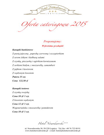 Oferta cateringowa 2015 Proponujemy: Wykwintne przekąski Kanapki bankietowe Z pastą jajeczną , papryką czerwoną i szczypiorkiem Z serem żółtym i kiełbasą salami Z szynką, pieczarką i ogórkiem korniszonem Z serkiem białym, z mozzarellą, camembert Z jajkiem i kawiorem Z wędzonym łososiem Patera 35 szt. Cena 122,50 zł Kanapki tostowe Z szynką swojską Cena 10 zł/ 1 szt. Z łososiem wędzonym Cena 12 zł/ 1 szt. Wegetariańska z mozzarellą i pomidorem Cena 10 zł/ 1 szt. Hotel Nowodworski*** ul. Nowodworska 30, 59-220 Legnica · Tel./fax +48 76 722 09 91 www.hotelnowodworski.pl · e-mail: [email protected] Koreczki bankietowe Z serem żółtym i szynką Śledziowe ze śliwką suszoną i pomidorem koktajlowym Z ananasem i szynką drobiową Łódeczki z kiełbasy salami Z serem pleśniowym i orzechami Patera koreczków 25 sztuk Cena 90 zł Półmisek rozmaitości duży W tym – 25 zakąsek: Łosoś po admiralsku (5 porcji) Rulon z szynki ze szparagą (5 porcji) Pasztet z chrzanem (5 porcji) Roladki schabowe faszerowane serkiem i kaparami (5 porcji) Tymbaliki drobiowe (5 porcji) Cena 180 zł Patera owoców dla 10 osób W tym: winogrona, mandarynki, ananas, banan, kiwi Cena 60zł Patera ciast domowych 10 porcji Cena 50 zł Patera ciast domowych 20 porcji Cena 100zł Patera ciast domowych 30 porcji Cena 150 zł Hotel Nowodworski*** ul. Nowodworska 30, 59-220 Legnica · Tel./fax +48 76 722 09 91 www.hotelnowodworski.pl · e-mail: [email protected] D ania do skomponowania Przystawka 1. Carpaccio z polędwicy wołowej i wędzonej kaczki ½ porcji (100g) 16zł 2. Wykwintny śledź w śmietanie lub oleju (120g) 12 zł 3. Terrina z łososia (120g) 16zł 4. Naleśnikowe roladki faszerowane szynką parmeńską i suszonym pomidorem(120g) 16zł Zupy 1. Zupa brokułowa z łososiową grzanką (300ml) 16zł 2. Pikantna zupa węgierska (300ml) 15zł 3. Krem borowikowy z nutką bitej śmietany i prażonymi migdałami (250ml) 14 zł 4. Włoski krem pomidorowy z serem fetą i bazylią (250ml) 12 zł 5. Zupa serowa podana z chrupiącą grzanką (250ml) 12 zł 6. Francuska zupa cebulowa z chrupiącą grzanką (250ml) 12 zł 7. Barszcz z krokietem (250ml) 12 zł 8. Żurek z jajkiem (250ml) 12 zł 9. Rosół z makaronem (300ml) 10 zł Hotel Nowodworski*** ul. Nowodworska 30, 59-220 Legnica · Tel./fax +48 76 722 09 91 www.hotelnowodworski.pl · e-mail: [email protected] Dania główne 1. Eskalopki drobiowe z grillowanym pomidorem na szpinaku(140g) 26zł 2. Filet z kurczaka z mozzarellą i pomidorem (140g) 27 zł 3. Schab saute po neapolitańsku serwowany z żółtym serem oraz papryką (140g) 30 zł 4. Pierś z kaczki sosie żurawinowym (200g) 48 zł 5. Duszony łosoś w sosie maślano-cytrynowym (150g) 30 zł 6. Staropolski zawijaniec wieprzowy z grzybkami w sosie własnym (140g) 30 zł 7. Stek z polędwicy wołowej z masłem czosnkowym (180g) 54zł 8. Cukinia faszerowana suszonymi pomidorami, oliwkami, serem 22 zł serwowana z sosem jogurtowym (200g) 9. Grillowany oscypek z żurawiną (200g) 25zł 10. Golonka wieprzowa z chrzanem (300g) 26 zł Dodatki: 1. Frytki (140g) 6 zł 2. Ziemniaczki z wody lub puree (200g) 5 zł 3. Kluseczki gnocchi (140g) 6 zł 4. Ryż (100g) 5zł 5. Bukiet surówek sezonowych (150g) 6 zł 6. Bukiet warzyw gotowanych (150g) 6 zł 7. Mix sałat w sosie winegret (100g) 6 zł 8. Szpinak duszony (125g) 6 zł 9. Mizeria (100g) 6 zł Hotel Nowodworski*** ul. Nowodworska 30, 59-220 Legnica · Tel./fax +48 76 722 09 91 www.hotelnowodworski.pl · e-mail: [email protected] Desery 1. Sernik (120g/porcja) 10 zł 2. Szarlotka (120g/porcja) 10 zł 3. Naleśniki z białym serkiem lub owocami z nutką bitej śmietany (2 szt) 14zł Bufet napoi gorących 1.Termos kawy rozpuszczalnej + dodatki (34 porcje) 68zł 2. Termos herbaty Lipton + dodatki (34 porcje) 68zł Zakąski na zimno 1. Befsztyk tatarski z polędwicy wołowej (100g) 27 zł 2. Przysmak sofijski (120g) 14 zł 3. Carpaccio z polędwicy wołowej (100g) 28 zł 4. Carpaccio z wędzonej kaczki (120g) 28 zł 5. Pasztecik staropolski z chrzanem (100g) 8 zł 6. Półmisek swojskich wędlin (karczek, schab, boczek,szynka) (200g) 55 zł 7. Patera serów żółtych i pleśniowych (300g) 45 zł 8. Roladki schabowe faszerowane grzybkami – w auszpiku (120g) 12 zł 9. Roladki drobiowe faszerowane boczkiem i szpinakiem (120g) 10 zł 10. Ryba (filet) po grecku (120g) 12 zł 11. Sałatka grecka/ sałatka caprese (200g) 20 zł 12. Śledzie w śmietanie z jajkiem (120g) 12 zł 13. Tymbaliki drobiowe (100g) 12 zł Hotel Nowodworski*** ul. Nowodworska 30, 59-220 Legnica · Tel./fax +48 76 722 09 91 www.hotelnowodworski.pl · e-mail: [email protected]