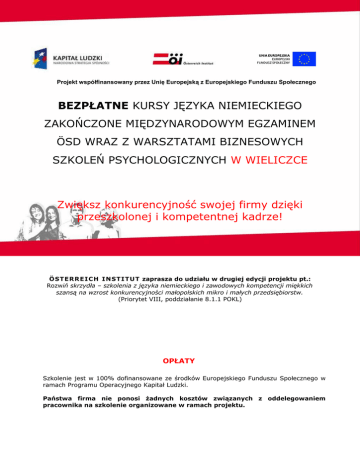 Projekt współfinansowany przez Unię Europejską z Europejskiego Funduszu Społecznego BEZPŁATNE KURSY JĘZYKA NIEMIECKIEGO ZAKOŃCZONE MIĘDZYNARODOWYM EGZAMINEM ÖSD WRAZ Z WARSZTATAMI BIZNESOWYCH SZKOLEŃ PSYCHOLOGICZNYCH W WIELICZCE Zwiększ konkurencyjność swojej firmy dzięki przeszkolonej i kompetentnej kadrze! ÖSTERREI CH IN STI TUT zaprasza do udziału w drugiej edycji projektu pt.: Rozwiń skrzydła – szkolenia z języka niemieckiego i zawodowych kompetencji miękkich szansą na wzrost konkurencyjności małopolskich mikro i małych przedsiębiorstw. (Priorytet VIII, poddziałanie 8.1.1 POKL) OPŁATY Szkolenie jest w 100% dofinansowane ze środków Europejskiego Funduszu Społecznego w ramach Programu Operacyjnego Kapitał Ludzki. Państwa firma nie ponosi żadnych kosztów związanych z oddelegowaniem pracownika na szkolenie organizowane w ramach projektu. KTO MOŻE WZIĄĆ UDZIAŁ? W szkoleniach mogą wziąć udział mikro i małe przedsiębiorstwa oraz ich pracownicy, spełniający następujące warunki: • Mikro i małe przedsiębiorstwo posiadające siedzibę, oddział, filię na terenie województwa małopolskiego • Przedsiębiorstwo nie przekroczyło dopuszczalnego poziomu pomocy de minimis tj. 200 tyś. euro w okresie 3 ostatnich lat obrachunkowych • Pracodawca może oddelegować do projektu jednego pracownika zatrudnionego na podstawie umowy o pracę, powołania, wyboru, mianowania lub spółdzielczej umowy o pracę. • W projekcie mogą brać udział osoby prowadzące jednoosobową działalność gospodarczą • Projekt przewidziany jest dla pracowników ze znajomością lub bez znajomości języka niemieckiego Projekt współfinansowany przez Unię Europejską z Europejskiego Funduszu Społecznego O SZKOLENIACH: KURS JĘZYKA NIEMIECKIEGO WRAZ Z WYJAZDOWYM SZKOLENIEM POŚWIĘCONYM STARTEGIOM UCZENIA SIĘ JĘZYKÓW OBCYCH: - 2 semestry nauki języka na różnych poziomach zaawansowania (120 godzin) konwersacje z native speaker (24 godziny) konsultacje indywidualne z lektorem (2 godziny) międzynarodowy egzamin ÖSD wyjazdowy trening pt: ”Strategie uczenia się języka niemieckiego”– 16 godzin 10 osobowe grupy szkoleniowe zajęcia prowadzone przez wykwalifikowanych lektorów i trenerów opieka metodyka MODUŁ PSYCHOLOGICZNYCH SZKOLEŃ BIZNESOWYCH pt.: „SKUTECZNIE W PRACY” 7 BLOKÓW TEMATYCZNYCH: 56 godzin szkoleń przypadających na każdego kursanta, podczas których dowiedzą się jak: - odkrywać swój potencjał zawodowy i wykorzystywać swoje mocne strony świadomie kreować swój wizerunek skutecznie się komunikować zwiększać swoją efektywność w pracy radzić sobie z negatywnymi emocjami zawodowymi negocjować Projekt współfinansowany przez Unię Europejską z Europejskiego Funduszu Społecznego REKRUTACJA 17.09.2012r.- 09.11.2012r.- Złożenie dokumentów rekrutacyjnych– wypełnione dokumenty (do pobrania ze strony internetowej Instytutu tj. www.oei.krakow.pl w zakładce projektu: „Rozwiń Skrzydła…”- II nabór) należy poprawnie wypełnić (zgodnie z wytycznymi zawartymi w Regulaminie rekrutacji) i wysłać pocztą lub dostarczyć osobiście do biura projektu (ul. Basztowa 3, 31-134 Kraków). 12.11.2012r.– 16.11.2012r.- Selekcja, określenie poziomu językowego, ogłoszenie wyników 20.11.2012r.– 28.11.2012r.- Podpisywanie umów Uwaga: Warunkiem utworzenia grupy jest zebranie 10 osób będących na tym samym poziomie zaawansowania językowego deklarujących chęć udziału w zajęciach w tym samym miejscu. Przy selekcji brane będą pod uwagę kryteria preferencyjne i kryteria dotyczące utworzenia się grupy- opisane szczegółowo w Regulaminie rekrutacji. Zajęcia rozpoczynają się od grudnia WYMAGANE DOKUMENTY REKRUTACYJNE • Dokument rejestrowy przedsiębiorstwa (ksero poświadczone za zgodność z oryginałem) • Kserokopie sprawozdań finansowych za trzy zamknięte lata obrachunkowe lub oświadczenie o przychodach (w przypadku braku sporządzania sprawozdań) • Kserokopie zaświadczeń o pomocy de minimis za okres ostatnich trzech lat obrachunkowych (w przypadku gdy dotyczy) • Oświadczenie o otrzymaniu lub nieotrzymaniu pomocy de minimis w okresie 3 ostatnich lat obrachunkowych– załącznik do rozporządzenia Rady Ministrów z dnia 29marca 2010 r. (poz.311) • Formularz zgłoszeniowy przedsiębiorstwa do Projektu wraz delegacją pracownika • Formularz zgłoszeniowy pracownika • Ankiety: udział w szkoleniach POKL i zgoda na przetwarzanie danych osobowych • Zaświadczenie o zatrudnieniu pracownika wg. wzoru zamieszczonego na stronie internetowej • Wypełniony test językowy lub oświadczenie o braku znajomości niemieckiego INFORMACJE O PROJEKCIE tel. (12) 430 98 05 fax.: (12) 428 21 70 pon – pt. godz. 9.00-17.00 e- mail [email protected]