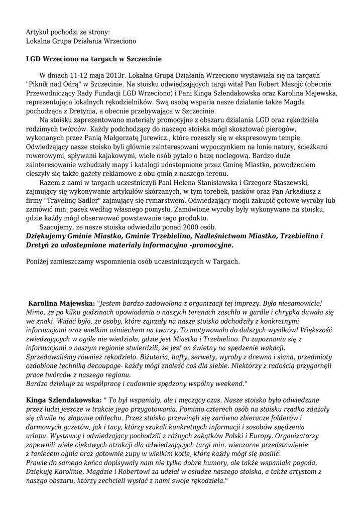Artykuł pochodzi ze strony: Lokalna Grupa Działania Wrzeciono LGD Wrzeciono na targach w Szczecinie W dniach 11-12 maja 2013r. Lokalna Grupa Działania Wrzeciono wystawiała się na targach "Piknik nad Odrą" w Szczecinie. Na stoisku odwiedzających targi witał Pan Robert Masojć (obecnie Przewodniczący Rady Fundacji LGD Wrzeciono) i Pani Kinga Szlendakowska oraz Karolina Majewska, reprezentująca lokalnych rękodzielników. Swą osobą wsparła nasze działanie także Magda pochodząca z Dretynia, a obecnie przebywająca w Szczecinie. Na stoisku zaprezentowano materiały promocyjne z obszaru dzialania LGD oraz rękodzieła rodzimych twórców. Każdy podchodzący do naszego stoiska mógł skosztować pierogów, wykonanych przez Panią Małgorzatę Jurewicz., które rozeszły się w ekspresowym tempie. Odwiedzający nasze stoisko byli głównie zainteresowani wypoczynkiem na łonie natury, ścieżkami rowerowymi, spływami kajakowymi, wiele osób pytało o bazę noclegową. Bardzo duże zainteresowanie wzbudzały mapy i katalogi udostepnione przez Gminę Miastko, powodzeniem cieszyły się także gażety reklamowe z obu gmin z naszego terenu. Razem z nami w targach uczestniczyli Pani Helena Stanisławska i Grzegorz Staszewski, zajmujący się wykonywanie artykułów skórzanych, w tym torebek, pasków oraz Pan Arkadiusz z firmy "Traveling Sadler" zajmujący się rymarstwem. Odwiedzający mogli zakupić gotowe wyroby lub zamówić min. pasek według własnego pomysłu. Zamówione wyroby były wykonywane na stoisku, gdzie każdy mógł obserwować powstawanie tego produktu. Szacujemy, że nasze stoiska odwiedziło ponad 2000 osób. Dziękujemy Gminie Miastko, Gminie Trzebielino, Nadleśnictwom Miastko, Trzebielino i Dretyń za udostepnione materiały informacyjno -promocyjne. Poniżej zamieszczamy wspomnienia osób uczestniczących w Targach. Karolina Majewska: "Jestem bardzo zadowolona z organizacji tej imprezy. Było niesamowicie! Mimo, że po kilku godzinach opowiadania o naszych terenach zaschło w gardle i chrypka dawała się we znaki. Widać było, że osoby, które zajrzały na nasze stoisko odchodziły z konkretnymi informacjami oraz wielkim uśmiechem na twarzy. To motywowało do dalszych wysiłków! Większość zwiedzających w ogóle nie wiedziała, gdzie jest Miastko i Trzebielino. Po zapoznaniu się z informacjami o naszym regionie stwierdzili, że jest on świetny na spędzenie wakacji. Sprzedawaliśmy również rękodzieło. Biżuteria, hafty, serwety, wyroby z drewna i siana, przedmioty ozdobione techniką decoupage- każdy mógł znaleźć coś dla siebie. Niektórzy z radością przygarnęli prace twórców z naszego regionu. Bardzo dziekuje za współpracę i cudownie spędzony wspólny weekend." Kinga Szlendakowska: " To był wspaniały, ale i męczący czas. Nasze stoisko było odwiedzane przez ludzi jeszcze w trakcie jego przygotowania. Pomimo czterech osób na stoisku rzadko zdażały się chwile na złapanie oddechu. Przez stoisko przewinęli się zarówno zbieracze folderów i darmowych gażetów, jak i tacy, którzy szukali konkretnych informacji i sosobów spędzenia urlopu. Wystawcy i odwiedzający pochodzili z różnych zakątków Polski i Europy. Organizatorzy zapewnili wiele ciekawych atrakcji dla odwiedzających targi min. wieczorne przedstawienie z taniecem ognia oraz gotownie zupy w wielkim kotle, którą każdy mógł się posilić. Prawie do samego końca dopisywały nam nie tylko dobre humory, ale także wspaniała pogoda. Dziękuję Karolinie, Magdzie i Robertowi za udział w osłudze naszego stoiska, a także artystom z naszgo obszaru, którzy zechcieli wysłać z nami swoje rękodzieła." Helena Stanisławska: " Jestem zachwycona organizacją całej imprezy. Organizatorzy dopięli wszystko na przysłowiowy ostatni guzik! Cieszy mnie również zainteresowanie, z jakim spotkaliśmy się ze strony mieszkańców Szecina i turystów odwiedzających nasze stoisko. Szczególnym zainteresowaniem cieszył się pokaz szycia ręcznego na ławeczce rymarskiej oraz możliwość obserwacji pracy w warsztacie "na żywo", padało wiele pytań odnośnie naszych wyrobów i asortymentu, jaki oferujemy. Dziękuję bardzo pani Kindze z LGD Wrzeciono za możliwość uczestniczenia w Targach, był to na prawdę świetnie spędzony czas." Robert Masojć: " Czas który spędziłem podczas targów w Szczecinie był bardzo intensywny. Mogłem się podzielić swoim doświadczeniem w zakresie marketingu i komunikacji z uczestnikami naszego punktu. Mogłem się podzielić też wiedzą o naszych lokalnych gospodarstwach agroturystyczncyh i ośrodkach wypoczynkowych z terenu działania LGD Wrzeciono. Cała impreza była zorganizowana perfekcyjnie. Miałem mozliwość porównania jej do podobnych imprez z przed 8 lat, w których uczestniczyłem w czasie podróży po Niemczech. Jestem pewien, że relacja wideo którą przygotowywałem podczas targów pozwoli przybliżyć gorący klimat panujacy w naszej ekpie. " Zapraszamy do obejrzenia relacji video z targów "Market Tour" oraz zdjęć w galerii zdjęć. opublikował: Kinga Szlendakowska data publikacji: 2013-05-14 10:01:04 data ostatniej aktualizacji: 2013-05-14 15:02:17