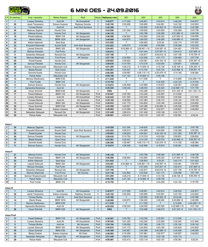 6 MINI OES – 24.09.2016 LP Nr startowy Imię i nazwisko Marka Pojazdu Klub 1 20 4 24 21 16 14 22 33 12 27 9 18 25 26 34 19 31 6 15 3 11 7 28 17 2 5 13 30 23 10 29 Łukasz Zbrzeźny Jacek Tarazewicz Tomasz Buńka Mateusz Zagórski Mariusz Kumor Paweł Kiełbasa Marek Walas Adrian Klejnocki Krzysztof Kłosowski Leszek Dobrucki Mariusz Konopka Sebastian Nietupski Mariusz Majchrzak Paweł Krysiak Dariusz Pekalski Damian Wojciechowski Błażej Roszak Dominik Kosiło Patryk Keller Mariusz Słodkowicz Piotr Furtak Dariusz Subocz Agnieszka Baryłowicz Oscar Schmidt Paweł Kiełbasa Łukasz Zbrzeźny Tomasz Buńka Leszek Dobrucki Oscar Schmidt Błażej Czekan Sebastian Nietupski Patryk Keller Audi S4 Subaru Impreza Audi A4 Honda Civic Honda Civic BMW 318 BMW 323ti Seat Ibiza Suzuki Swift BMW 320 Fiat Punto Renault Clio Ford Puma Honda Civic Honda Civic Mitsubishi Colt Opel Corsa Honda Civic Mitsubishi Colt BMW E36 BMW 316 Honda Civic Audi A4 BMW E36 BMW 318 Audi S4 Audi A4 BMW 320 BMW E36 Subaru Impreza Renault Clio Mitsubishi Colt AK Koszaliński Rajdowy Gorzów Auto Klub Szczecin AK Stargardzki AK Stargardzki AK Stargardzki Auto Klub Szczecin AK Stargardzki AK Stargardzki AK Gorzów AK Stargardzki AK Stargardzki AK Stargardzki AK Stargardzki AK Koszaliński AK Szczecin AK Stargardzki AK Stargardzki AK Orski AK Stargardzki - 3 3 3 1 2 2 3 2 1 2 2 2 2 1 1 2 1 1 2 3 2 1 3 3 Profi Profi Profi Profi Profi Profi Profi Profi 3:40.877 3:42.192 3:42.386 3:43.520 3:46.125 3:46.596 3:48.008 3:51.622 3:53.203 3:54.481 3:54.613 3:57.106 3:57.738 3:59.603 3:59.635 4:01.205 4:03.261 4:06.580 4:09.196 4:11.039 4:15.792 4:19.874 4:20.525 DSQ 24 33 25 26 19 31 11 Mateusz Zagórski Krzysztof Kłosowski Paweł Krysiak Dariusz Pekalski Błażej Roszak Dominik Kosiło Dariusz Subocz Honda Civic Suzuki Swift Honda Civic Honda Civic Opel Corsa Honda Civic Honda Civic Auto Klub Szczecin AK Stargardzki AK Stargardzki 1 2 3 4 5 6 7 8 9 10 21 16 22 12 27 9 18 34 6 3 Mariusz Kumor Paweł Kiełbasa Adrian Klejnocki Leszek Dobrucki Mariusz Konopka Sebastian Nietupski Mariusz Majchrzak Damian Wojciechowski Patryk Keller Piotr Furtak Honda Civic BMW 318 Seat Ibiza BMW 320 Fiat Punto Renault Clio Ford Puma Mitsubishi Colt Mitsubishi Colt BMW 316 klasa III 1 2 3 4 5 6 7 1 20 4 14 15 7 28 Łukasz Zbrzeźny Jacek Tarazewicz Tomasz Buńka Marek Walas Mariusz Słodkowicz Agnieszka Baryłowicz Oscar Schmidt Paweł Kiełbasa Łukasz Zbrzeźny Tomasz Buńka Leszek Dobrucki Oscar Schmidt Błażej Czekan Sebastian Nietupski Patryk Keller 1 2 3 4 5 6 7 8 9 10 11 12 13 14 15 16 17 18 19 20 21 22 23 24 25 26 27 28 29 30 31 32 Klasa Najlepszy czas SZ1 SZ2 SZ3 SZ4 SZ5 3:30.507 3:30.542 3:35.104 3:40.833 3:45.368 3:48.083 3:51.449 4:00.081 4:17.045 3:53.406 T 3:51.044 T 4:06.924 4:04.873 T 4:09.073 4:03.968 +5 T T 4:34.850 3:59.603 5:14.754 4:28.216 4:35.437 4:38.997 4:21.163 T T 4:26.548 4:38.344 T 3:35.782 3:41.300 3:39.556 3:47.173 3:45.657 4:15.356 3:56.514 4:03.413 3:49.801 3:56.890 3:52.600 3:49.935 3:54.768 3:53.850 3:56.025 3:56.903 4:04.669 3:59.851 +10 4:01.044 4:02.877 4:03.638 4:05.581 4:10.319 4:17.609 +5 4:14.154 4:48.115 +10 4:19.806 +5 4:11.039 T 4:22.969 4:28.030 3:53.489 3:33.236 3:40.300 3:37.383 3:44.830 3:45.368 3:57.861 3:51.449 4:03.119 3:43.814 3:44.581 3:49.502 +5 3:43.520 3:48.380 3:50.322 3:48.264 3:53.49 4:04.650 3:54.587 +5 3:57.847 +5 4:04.615 +5 4:01.173 4:24.104 +5 4:03.054 4:10.136 4:03.724 4:20.479 +5 4:09.196 T 4:34.309 4:19.874 4:20.525 3:48.010 3:30.507 3:33.500 3:36.172 3:43.180 3:45.896 +5 3:52.577 3:53.136 4:02.157 3:46.234 3:42.192 03:44.66 3:50.569 4:01.966 +5 3:47.950 +5 3:45.686 +5 3:52.174 3:59.268 3:54.481 3:54.613 3:57.106 3:59.468 4:01.363 3:59.651 4:08.108 +5 4:02.996 +5 4:14.185 --:--:-4:15.895 4:24.120 4:28.361 4:32.969 +10 3:51.333 +5 5:13.026 3:30.542 3:35.104 3:40.833 3:45.536 3:48.827 4:24.173 4:00.081 3:40.877 3:42.603 3:42.386 3:45.156 3:48.799 3:46.596 3:48.008 3:51.622 3:53.203 3:55.593 3:57.949 +5 4:10.726 +5 3:57.738 3:55.397 +5 3:59.635 3:56.205 +5 3:58.261 +5 4:06.580 --:--:-4:04.289 +10 4:15.792 4:26.864 4:31.150 3:41.192 +10 --:--:-3:31.840 3:35.143 3:43.852 3:46.094 3:48.083 --:--:-4:02.54 1 1 1 1 1 1 1 3:43.520 3:53.203 3:59.603 3:59.635 4:03.261 4:06.580 4:19.874 3:51.044 4:09.073 3:59.603 5:14.754 4:35.437 4:38.997 4:26.548 3:49.935 4:04.669 4:05.581 4:10.319 4:14.154 4:48.115 +10 4:22.969 3:43.520 4:04.650 4:24.104 +5 4:03.054 4:03.724 4:20.479 +5 4:19.874 3:50.569 3:59.268 4:01.363 3:59.651 4:02.996 +5 4:14.185 4:28.361 3:45.156 3:53.203 3:55.397 +5 3:59.635 3:58.261 +5 4:06.580 4:26.864 AK Stargardzki AK Stargardzki AK Stargardzki AK Stargardzki AK Gorzów - 2 2 2 2 2 2 2 2 2 2 3:46.125 3:46.596 3:51.622 3:54.481 3:54.613 3:57.106 3:57.738 4:01.205 4:09.196 4:15.792 T 4:06.924 T 4:03.968 +5 T T 4:34.850 4:28.216 4:21.163 T 3:54.768 3:53.850 3:56.903 3:59.851 +10 4:01.044 4:02.877 4:03.638 4:17.609 +5 4:19.806 +5 T 3:48.380 3:50.322 3:53.49 3:54.587 +5 3:57.847 +5 4:04.615 +5 4:01.173 4:10.136 4:09.196 4:34.309 4:01.966 +5 3:47.950 +5 3:52.174 3:54.481 3:54.613 3:57.106 3:59.468 4:08.108 +5 --:--:-4:24.120 3:48.799 3:46.596 3:51.622 3:55.593 3:57.949 +5 4:10.726 +5 3:57.738 3:56.205 +5 --:--:-4:15.792 Audi S4 Subaru Impreza Audi A4 BMW 323ti BMW E36 Audi A4 BMW E36 AK Koszaliński Rajdowy Gorzów Auto Klub Szczecin AK Stargardzki AK Stargardzki 3 3 3 3 3 3 3 3:40.877 3:42.192 3:42.386 3:48.008 4:11.039 4:20.525 DSQ 4:17.045 3:53.406 T 4:04.873 T 4:38.344 T 3:49.801 3:56.890 3:52.600 3:56.025 4:11.039 4:28.030 3:53.489 3:43.814 3:44.581 3:49.502 +5 3:48.264 T 4:20.525 3:48.010 3:46.234 3:42.192 03:44.66 3:45.686 +5 4:15.895 4:32.969 +10 3:51.333 +5 3:40.877 3:42.603 3:42.386 3:48.008 4:04.289 +10 4:31.150 3:41.192 +10 BMW 318 Audi S4 Audi A4 BMW 320 BMW E36 Subaru Impreza Renault Clio Mitsubishi Colt AK Stargardzki AK Koszaliński AK Szczecin AK Stargardzki AK Stargardzki AK Orski AK Stargardzki - Profi Profi Profi Profi Profi Profi Profi Profi 3:30.507 3:30.542 3:35.104 3