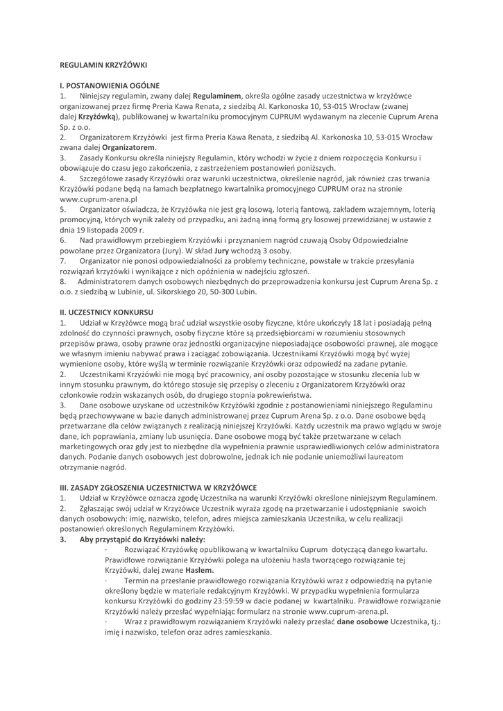 REGULAMIN KRZYŻÓWKI I. POSTANOWIENIA OGÓLNE 1. Niniejszy regulamin, zwany dalej Regulaminem, określa ogólne zasady uczestnictwa w krzyżówce organizowanej przez firmę Preria Kawa Renata, z siedzibą Al. Karkonoska 10, 53-015 Wrocław (zwanej dalej Krzyżówką), publikowanej w kwartalniku promocyjnym CUPRUM wydawanym na zlecenie Cuprum Arena Sp. z o.o. 2. Organizatorem Krzyżówki jest firma Preria Kawa Renata, z siedzibą Al. Karkonoska 10, 53-015 Wrocław zwana dalej Organizatorem. 3. Zasady Konkursu określa niniejszy Regulamin, który wchodzi w życie z dniem rozpoczęcia Konkursu i obowiązuje do czasu jego zakończenia, z zastrzeżeniem postanowień poniższych. 4. Szczegółowe zasady Krzyżówki oraz warunki uczestnictwa, określenie nagród, jak również czas trwania Krzyżówki podane będą na łamach bezpłatnego kwartalnika promocyjnego CUPRUM oraz na stronie www.cuprum-arena.pl 5. Organizator oświadcza, że Krzyżówka nie jest grą losową, loterią fantową, zakładem wzajemnym, loterią promocyjną, których wynik zależy od przypadku, ani żadną inną formą gry losowej przewidzianej w ustawie z dnia 19 listopada 2009 r. 6. Nad prawidłowym przebiegiem Krzyżówki i przyznaniem nagród czuwają Osoby Odpowiedzialne powołane przez Organizatora (Jury). W skład Jury wchodzą 3 osoby. 7. Organizator nie ponosi odpowiedzialności za problemy techniczne, powstałe w trakcie przesyłania rozwiązań krzyżówki i wynikające z nich opóźnienia w nadejściu zgłoszeń. 8. Administratorem danych osobowych niezbędnych do przeprowadzenia konkursu jest Cuprum Arena Sp. z o.o. z siedzibą w Lubinie, ul. Sikorskiego 20, 50-300 Lubin. II. UCZESTNICY KONKURSU 1. Udział w Krzyżówce mogą brać udział wszystkie osoby fizyczne, które ukończyły 18 lat i posiadają pełną zdolność do czynności prawnych, osoby fizyczne które są przedsiębiorcami w rozumieniu stosownych przepisów prawa, osoby prawne oraz jednostki organizacyjne nieposiadające osobowości prawnej, ale mogące we własnym imieniu nabywać prawa i zaciągać zobowiązania. Uczestnikami Krzyżówki mogą być wyżej wymienione osoby, które wyślą w terminie rozwiązanie Krzyżówki oraz odpowiedź na zadane pytanie. 2. Uczestnikami Krzyżówki nie mogą być pracownicy, ani osoby pozostające w stosunku zlecenia lub w innym stosunku prawnym, do którego stosuje się przepisy o zleceniu z Organizatorem Krzyżówki oraz członkowie rodzin wskazanych osób, do drugiego stopnia pokrewieństwa. 3. Dane osobowe uzyskane od uczestników Krzyżówki zgodnie z postanowieniami niniejszego Regulaminu będą przechowywane w bazie danych administrowanej przez Cuprum Arena Sp. z o.o. Dane osobowe będą przetwarzane dla celów związanych z realizacją niniejszej Krzyżówki. Każdy uczestnik ma prawo wglądu w swoje dane, ich poprawiania, zmiany lub usunięcia. Dane osobowe mogą być także przetwarzane w celach marketingowych oraz gdy jest to niezbędne dla wypełnienia prawnie usprawiedliwionych celów administratora danych. Podanie danych osobowych jest dobrowolne, jednak ich nie podanie uniemożliwi laureatom otrzymanie nagród. III. ZASADY ZGŁOSZENIA UCZESTNICTWA W KRZYŻÓWCE 1. Udział w Krzyżówce oznacza zgodę Uczestnika na warunki Krzyżówki określone niniejszym Regulaminem. 2. Zgłaszając swój udział w Krzyżówce Uczestnik wyraża zgodę na przetwarzanie i udostępnianie swoich danych osobowych: imię, nazwisko, telefon, adres miejsca zamieszkania Uczestnika, w celu realizacji postanowień określonych Regulaminem Krzyżówki. 3. Aby przystąpić do Krzyżówki należy: · Rozwiązać Krzyżówkę opublikowaną w kwartalniku Cuprum dotyczącą danego kwartału. Prawidłowe rozwiązanie Krzyżówki polega na ułożeniu hasła tworzącego rozwiązanie tej Krzyżówki, dalej zwane Hasłem. · Termin na przesłanie prawidłowego rozwiązania Krzyżówki wraz z odpowiedzią na pytanie określony będzie w materiale redakcyjnym Krzyżówki. W przypadku wypełnienia formularza konkursu Krzyżówki do godziny 23:59:59 w dacie podanej w kwartalniku. Prawidłowe rozwiązanie Krzyżówki należy przesłać wypełniając formularz na stronie www.cuprum-arena.pl. · Wraz z prawidłowym rozwiązaniem Krzyżówki należy przesłać dane osobowe Uczestnika, tj.: imię i nazwisko, telefon oraz adres zamieszkania. 4. Uczestnik, który przystąpił do Krzyżówki i spełnia powyższe postanowienia niniejszego Regulaminu staje się Uczestnikiem Krzyżówki. IV. ZASADY WYŁONIENIA ZWYCIĘZCÓW KONKURSU I WYDANIE NAGRÓD 1. Zwycięzcy Krzyżówki zostaną wyłonieni spośród Uczestników, którzy nadeślą prawidłowe rozwiązanie Krzyżówki i będą to 3 pierwsze osoby, które nadeślą prawidłowe rozwiązanie wypełniając formularz na stronie www.cuprum-arena.pl 2. Rozwiązanie Krzyżówki będzie miało miejsce w siedzibie Organizatora nie później niż 2 dni po terminie zakończenia danej Krzyżówki opublikowanym w kwartalniku. Ogłoszenie wyników Krzyżówki nastąpi poprzez publikację listy Laureatów na stronie administratora danych czyli www.cuprum-arena.pl 3. Nagrody zostaną przekazane jedynie drogą osobistego odbioru w sklepie Sephora, mieszczącego się na terenie CH Cuprum Arena w Lubinie w terminie wskazanym w kwartalniku. 4. Organizator nie ponosi odpowiedzialności za brak możliwości przekazania nagrody z przyczyn leżących po stronie Uczestnika, a w szczególności w przypadku: niepodania danych adresowych w wyznaczonym terminie oraz podania błędnych, nieaktualnych lub niepełnych danych adresowych. 5. Laureatom nie przysługuje prawo zamiany nagród przyznanych w Konkursie na jej ekwiwalent pieniężny lub na inne nagrody rzeczowe. 6. Laureatom nie wolno przenosić nagrody na osoby trzecie. 7. Nadesłanie przez Czytelnika rozwiązania Krzyżówki oznacza, że wyraża on zgodę na opublikowanie imienia, nazwiska oraz miejsca zamieszkania na liście laureatów na łamach kwartalnika 