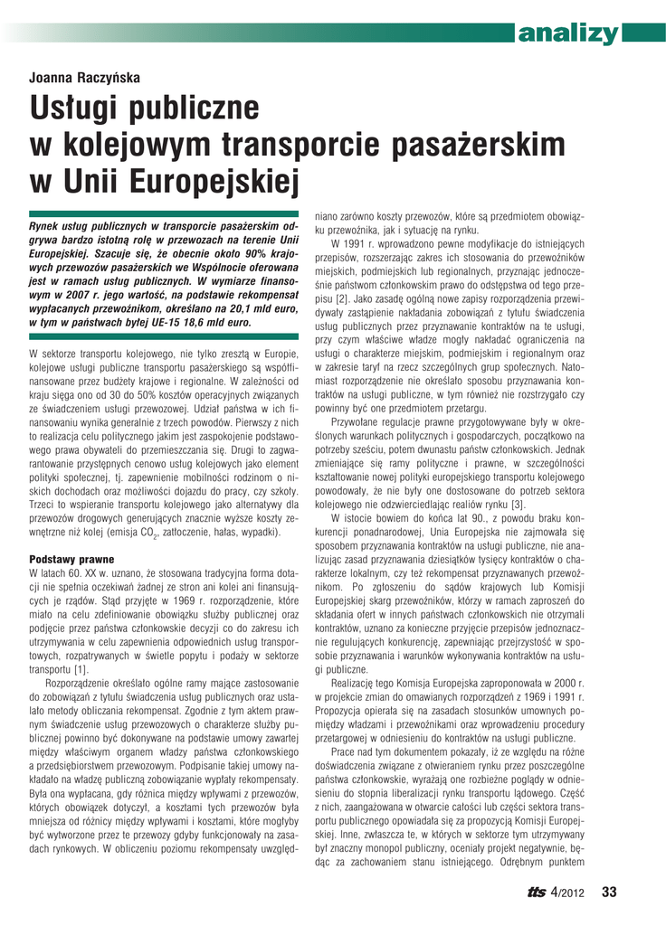 Joanna Raczyńska Usługi publiczne w kolejowym transporcie pasażerskim w Unii Europejskiej Rynek usług publicznych w transporcie pasażerskim odgrywa bardzo istotną rolę w przewozach na terenie Unii Europejskiej. Szacuje się, że obecnie około 90% krajowych przewozów pasażerskich we Wspólnocie oferowana jest w ramach usług publicznych. W wymiarze finansowym w 2007 r. jego wartość, na podstawie rekompensat wypłacanych przewoźnikom, określano na 20,1 mld euro, w tym w państwach byłej UE-15 18,6 mld euro. W sektorze transportu kolejowego, nie tylko zresztą w Europie, kolejowe usługi publiczne transportu pasażerskiego są współfinansowane przez budżety krajowe i regionalne. W zależności od kraju sięga ono od 30 do 50% kosztów operacyjnych związanych ze świadczeniem usługi przewozowej. Udział państwa w ich finansowaniu wynika generalnie z trzech powodów. Pierwszy z nich to realizacja celu politycznego jakim jest zaspokojenie podstawowego prawa obywateli do przemieszczania się. Drugi to zagwarantowanie przystępnych cenowo usług kolejowych jako element polityki społecznej, tj. zapewnienie mobilności rodzinom o niskich dochodach oraz możliwości dojazdu do pracy, czy szkoły. Trzeci to wspieranie transportu kolejowego jako alternatywy dla przewozów drogowych generujących znacznie wyższe koszty zewnętrzne niż kolej (emisja CO2, zatłoczenie, hałas, wypadki). Podstawy prawne W latach 60. XX w. uznano, że stosowana tradycyjna forma dotacji nie spełnia oczekiwań żadnej ze stron ani kolei ani finansujących je rządów. Stąd przyjęte w 1969 r. rozporządzenie, które miało na celu zdefiniowanie obowiązku służby publicznej oraz podjęcie przez państwa członkowskie decyzji co do zakresu ich utrzymywania w celu zapewnienia odpowiednich usług transportowych, rozpatrywanych w świetle popytu i podaży w sektorze transportu [1]. Rozporządzenie określało ogólne ramy mające zastosowanie do zobowiązań z tytułu świadczenia usług publicznych oraz ustalało metody obliczania rekompensat. Zgodnie z tym aktem prawnym świadczenie usług przewozowych o charakterze służby publicznej powinno być dokonywane na podstawie umowy zawartej między właściwym organem władzy państwa członkowskiego a przedsiębiorstwem przewozowym. Podpisanie takiej umowy nakładało na władzę publiczną zobowiązanie wypłaty rekompensaty. Była ona wypłacana, gdy różnica między wpływami z przewozów, których obowiązek dotyczył, a kosztami tych przewozów była mniejsza od różnicy między wpływami i kosztami, które mogłyby być wytworzone przez te przewozy gdyby funkcjonowały na zasadach rynkowych. W obliczeniu poziomu rekompensaty uwzględ- niano zarówno koszty przewozów, które są przedmiotem obowiązku przewoźnika, jak i sytuację na rynku. W 1991 r. wprowadzono pewne modyfikacje do istniejących przepisów, rozszerzając zakres ich stosowania do przewoźników miejskich, podmiejskich lub regionalnych, przyznając jednocześnie państwom członkowskim prawo do odstępstwa od tego przepisu [2]. Jako zasadę ogólną nowe zapisy rozporządzenia przewidywały zastąpienie nakładania zobowiązań z tytułu świadczenia usług publicznych przez przyznawanie kontraktów na te usługi, przy czym właściwe władze mogły nakładać ograniczenia na usługi o charakterze miejskim, podmiejskim i regionalnym oraz w zakresie taryf na rzecz szczególnych grup społecznych. Natomiast rozporządzenie nie określało sposobu przyznawania kontraktów na usługi publiczne, w tym również nie rozstrzygało czy powinny być one przedmiotem przetargu. Przywołane regulacje prawne przygotowywane były w określonych warunkach politycznych i gospodarczych, początkowo na potrzeby sześciu, potem dwunastu państw członkowskich. Jednak zmieniające się ramy polityczne i prawne, w szczególności kształtowanie nowej polityki europejskiego transportu kolejowego powodowały, że nie były one dostosowane do potrzeb sektora kolejowego nie odzwierciedlając realiów rynku [3]. W istocie bowiem do końca lat 90., z powodu braku kon kurencji ponadnarodowej, Unia Europejska nie zajmowała się sposobem przyznawania kontraktów na usługi publiczne, nie analizując zasad przyznawania dziesiątków tysięcy kontraktów o charakterze lokalnym, czy też rekompensat przyznawanych przewoźnikom. Po zgłoszeniu do sądów krajowych lub Komisji Europejskiej skarg przewoźników, którzy w ramach zaproszeń do składania ofert w innych państwach członkowskich nie otrzymali kontraktów, uznano za konieczne przyjęcie przepisów jednoznacznie regulujących konkurencję, zapewniając przejrzystość w sposobie przyznawania i warunków wykonywania kontraktów na usługi publiczne. Realizację tego Komisja Europejska zaproponowała w 2000 r. w projekcie zmian do omawianych rozporządzeń z 1969 i 1991 r. Propozycja opierała się na zasadach stosunków umownych pomiędzy władzami i przewoźnikami oraz wprowadzeniu procedury przetargowej w odniesieniu do kontraktów na usługi publiczne. Prace nad tym dokumentem pokazały, iż ze względu na różne doświadczenia związane z otwieraniem rynku przez poszczególne państwa członkowskie, wyrażają one rozbieżne poglądy w odniesieniu do stopnia liberalizacji rynku transportu lądowego. Część z nich, zaangażowana w otwarcie całości lub części sektora transportu publicznego opowiadała się za propozycją Komisji Europejskiej. Inne, zwłaszcza te, w których w sektorze tym utrzymywany był znaczny monopol publiczny, oceniały projekt negatywnie, będąc za zachowaniem stanu istniejącego. Odrębnym punktem 4/2012 33 spornym pomiędzy państwami członkowskimi, czyniącym uzyskanie ostatecznego porozumienia praktycznie niemożliwym, był zakres stosowania rozporządzenia i rodzaje transportu, które powinno ono objąć. Po 2000 r. Komisja Europejska próbowała jeszcze kilkakrotnie wprowadzić zmiany do rozporządzeń z 1969 i 
