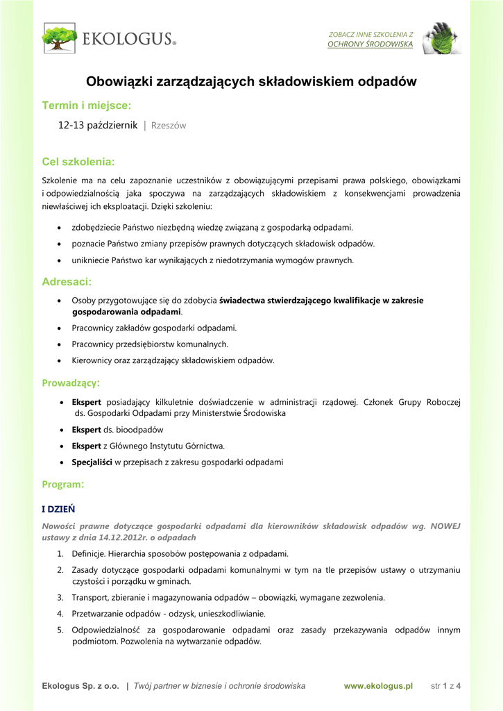 ZOBACZ INNE SZKOLENIA Z OCHRONY ŚRODOWISKA Obowiązki zarządzających składowiskiem odpadów Termin i miejsce: 12-13 październik | Rzeszów Cel szkolenia: Szkolenie ma na celu zapoznanie uczestników z obowiązującymi przepisami prawa polskiego, obowiązkami i odpowiedzialnością jaka spoczywa na zarządzających składowiskiem z konsekwencjami prowadzenia niewłaściwej ich eksploatacji. Dzięki szkoleniu: zdobędziecie Państwo niezbędną wiedzę związaną z gospodarką odpadami. poznacie Państwo zmiany przepisów prawnych dotyczących składowisk odpadów. unikniecie Państwo kar wynikających z niedotrzymania wymogów prawnych. Adresaci: Osoby przygotowujące się do zdobycia świadectwa stwierdzającego kwalifikacje w zakresie gospodarowania odpadami. Pracownicy zakładów gospodarki odpadami. Pracownicy przedsiębiorstw komunalnych. Kierownicy oraz zarządzający składowiskiem odpadów. Prowadzący: Ekspert posiadający kilkuletnie doświadczenie w administracji rządowej. Członek Grupy Roboczej ds. Gospodarki Odpadami przy Ministerstwie Środowiska Ekspert ds. bioodpadów Ekspert z Głównego Instytutu Górnictwa. Specjaliści w przepisach z zakresu gospodarki odpadami Program: I DZIEŃ Nowości prawne dotyczące gospodarki odpadami dla kierowników składowisk odpadów wg. NOWEJ ustawy z dnia 14.12.2012r. o odpadach 1. Definicje. Hierarchia sposobów postępowania z odpadami. 2. Zasady dotyczące gospodarki odpadami komunalnymi w tym na tle przepisów ustawy o utrzymaniu czystości i porządku w gminach. 3. Transport, zbieranie i magazynowania odpadów – obowiązki, wymagane zezwolenia. 4. Przetwarzanie odpadów - odzysk, unieszkodliwianie. 5. Odpowiedzialność za gospodarowanie odpadami oraz zasady przekazywania odpadów innym podmiotom. Pozwolenia na wytwarzanie odpadów. Ekologus Sp. z o.o. | Twój partner w biznesie i ochronie środowiska www.ekologus.pl str 1 z 4 ZOBACZ INNE SZKOLENIA Z OCHRONY ŚRODOWISKA 6. Przepisy szczególne dotyczące składowisk odpadów a w tym: rodzaje składowisk, zasady eksploatacji, instrukcja prowadzenia składowiska, fundusz rekultywacyjny. 7. Nowe zasady ewidencji i sprawozdawczości składowisk odpadów w 2016 r. 8. Sankcje za naruszenia dotyczące gospodarki odpadami - przepisy karne, administracyjne kary pieniężne, wstrzymywanie działalności posiadacza odpadów. II DZIEŃ 1. Sposób i warunki prowadzenia monitoringu wód na terenie składowisk odpadów w świetle nowych przepisów. 2. Budowa i eksploatacja składowiska odpadów. 3. Biologiczne zagospodarowanie odpadów BIO i osadów ściekowych metodą kompostowania. 4. Zarządzanie składowiskiem w końcowej fazie eksploatacji – zamknięcie i rekultywacja składowiska. Na zakończenie każdy uczestnik otrzymuje imienne zaświadczenie o udziale w szkoleniu oraz 10-dniowe darmowe konsultacje mailowe z wykładowcą. Cena: TERMIN SZKOLENIA 12-13.10.2016 Rzeszów CENY netto/os 940 zł +VAT* (N) 1105 zł +VAT* (BN) * Zwolnienie z podatku VAT w przypadku finansowania szkolenia co najmniej w 70% ze środków publicznych (Art. 43 ust. 1 pkt. 29 Ustawy o VAT) (BN) CENA BEZ NOCLEGU zawiera: udział w 2-dniowym szkoleniu, komplet materiałów drukowanych, zaświadczenie imienne potwierdzające udział w szkoleniu, 10-dniowe darmowe mailowe konsultacje z wykładowcą po zakończeniu szkolenia. Wyżywienie: obiady i przerwy kawowe. (N) CENA Z NOCLEGIEM zawiera: Zakres jak wyżej. Nocleg w pokoju 2-osobowym od I do II dnia szkolenia (1 doba hotelowe). Wyżywienie: śniadanie II dnia szkolenia, kolacja I dnia szkolenia, obiady, przerwy kawowe. Możliwość rezerwacji noclegu w pokoju 1-osobowym za dodatkową opłatą. Ekologus Sp. z o.o. | Twój partner w biznesie i ochronie środowiska www.ekologus.pl str 2 z 4 ZOBACZ INNE SZKOLENIA Z OCHRONY ŚRODOWISKA Rabaty: DLA STAŁYCH KLIENTÓW FIRST MINUTE UPUST NALICZANY INDYWIDUALNE -10% PRZY ZGŁOSZENIU DLA OSÓB/PRZEDSIĘBIORSTW, KTÓRE DO 42 DNI (6 TYGODNI) PRZED KORZYSTAJĄ Z NASZYCH USŁUG ROZPOCZĘCIEM SZKOLENIA DLA GRUPY 3+ -50% DLA CO TRZECIEJ OSOBY ZGŁOSZONEJ Z TEJ SAMEJ FIRMY/INSTYTUCJI UWAGA! Rabaty naliczane od cen podstawowych (bez noclegu). Rabaty nie sumują się. Warunkiem uczestnictwa w szkoleniu jest przesłanie do Ekologus Sp. z o.o. wypełnionego formularza zgłoszenia. W ciągu kolejnych 2 dni roboczych nasi pracownicy potwierdzą przyjęcie zgłoszenia. Organizator zastrzega sobie prawo do dokonywania modyfikacji programu lub terminu szkolenia w merytorycznie uzasadnionych przypadkach. O zmianach uczestnik zostanie poinformowany mailowo oraz telefonicznie. ZOBACZ HARMONOGRAM SZKOLEŃ ZAPRASZAMY DO KONTAKTU Z DZIAŁEM SZKOLEŃ NASI SPECJALIŚCI SĄ DO PAŃSTWA DYSPOZYCJI tel.: (33) 496 03 00, wewn. 15 i 20 fax: (33) 496 03 22 kom: e-mail: 606 914 909, 575 914 909 [email protected] A MOŻE SZKOLENIE ZAMKNIĘTE? Jeśli jesteś zainteresowany danym tematem w formie szkolenia zamkniętego napisz do nas. Dobierzemy indywidualnie do potrzeb Klienta zakres, termin i lokalizację szkolenia. KARTA ZGŁOSZENIA NA OSTATNIEJ STRONIE Ekologus Sp. z o.o. | Twój partner w biznesie i ochronie środowiska www.ekologus.pl str 3 z 4 KARTA ZGŁOSZENIA UDZIAŁU W SZKOLENIU Przesłana uzupełniona karta zgłoszenia stanowi umowę uczestnictwa w szkoleniu oraz oznacza akceptację poniższych warunków Warunki uczestnictwa: Podstawą udziału w szkoleniu jest przesłania faxem lub pocztą elektroniczną wypełnionej karty zgłoszenia w terminie do 7 dni roboczych przed rozpoczęciem szkolenia oraz dokonanie wpłaty do 3 dni przed szkoleniem na konto nr: 63 1090 1740 0000 0001 0246 2320 (BZ WBK S.A. O/Bielsko-Biała). W tytule przelewy należy wpisać imię i nazwisko uczestnika szkolenia oraz nr NIP Instytucji zgłaszającej. Zgłaszający upoważnia Ekologus Sp. z o.o. – NIP 547-19-40-780, do wystawienia faktury VAT bez podpisu osoby upoważnionej. Warunki rezygnacji: 1. Rezygnacja musi nastąpić w formie pisemnej w terminie do 7 dni robo