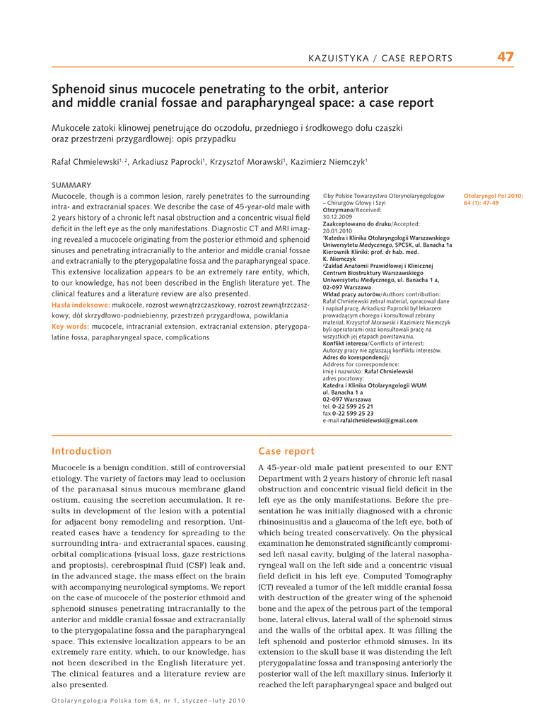KAZUISTYKA / CASE REPORTS 47 Sphenoid sinus mucocele penetrating to the orbit, anterior and middle cranial fossae and parapharyngeal space: a case report Mukocele zatoki klinowej penetrujące do oczodołu, przedniego i środkowego dołu czaszki oraz przestrzeni przygardłowej: opis przypadku Rafał Chmielewski1, 2, Arkadiusz Paprocki1, Krzysztof Morawski1, Kazimierz Niemczyk1 SUMMARY Mucocele, though is a common lesion, rarely penetrates to the surrounding intra- and extracranial spaces. We describe the case of 45-year-old male with 2 years history of a chronic left nasal obstruction and a concentric visual field deficit in the left eye as the only manifestations. Diagnostic CT and MRI imaging revealed a mucocele originating from the posterior ethmoid and sphenoid sinuses and penetrating intracranially to the anterior and middle cranial fossae and extracranially to the pterygopalatine fossa and the parapharyngeal space. This extensive localization appears to be an extremely rare entity, which, to our knowledge, has not been described in the English literature yet. The clinical features and a literature review are also presented. Hasła indeksowe: mukocele, rozrost wewnątrzczaszkowy, rozrost zewnątrzczaszkowy, dół skrzydłowo-podniebienny, przestrzeń przygardłowa, powikłania Key words: mucocele, intracranial extension, extracranial extension, pterygopalatine fossa, parapharyngeal space, complications ©by Polskie Towarzystwo Otorynolaryngologów – Chirurgów Głowy i Szyi Otrzymano/Received: 30.12.2009 Zaakceptowano do druku/Accepted: 20.01.2010 1 Katedra i Klinika Otolaryngologii Warszawskiego Uniwersytetu Medycznego, SPCSK, ul. Banacha 1a Kierownik Kliniki: prof. dr hab. med. K. Niemczyk 2 Zakład Anatomii Prawidłowej i Klinicznej Centrum Biostruktury Warszawskiego Uniwersytetu Medycznego, ul. Banacha 1 a, 02-097 Warszawa Wkład pracy autorów/Authors contribution: Rafał Chmielewski zebrał materiał, opracował dane i napisał pracę, Arkadiusz Paprocki był lekarzem prowadzącym chorego i konsultował zebrany materiał, Krzysztof Morawski i Kazimierz Niemczyk byli operatorami oraz konsultowali pracę na wszystkich jej etapach powstawania. Konflikt interesu/Conflicts of interest: Autorzy pracy nie zgłaszają konfliktu interesów. Adres do korespondencji/ Address for correspondence: imię i nazwisko: Rafał Chmielewski adres pocztowy: Katedra i Klinika Otolaryngologii WUM ul. Banacha 1 a 02-097 Warszawa tel. 0-22 599 25 21 fax 0-22 599 25 23 e-mail [email protected] Introduction Case report Mucocele is a benign condition, still of controversial etiology. The variety of factors may lead to occlusion of the paranasal sinus mucous membrane gland ostium, causing the secretion accumulation. It results in development of the lesion with a potential for adjacent bony remodeling and resorption. Untreated cases have a tendency for spreading to the surrounding intra- and extracranial spaces, causing orbital complications (visual loss, gaze restrictions and proptosis), cerebrospinal fluid (CSF) leak and, in the advanced stage, the mass effect on the brain with accompanying neurological symptoms. We report on the case of mucocele of the posterior ethmoid and sphenoid sinuses penetrating intracranially to the anterior and middle cranial fossae and extracranially to the pterygopalatine fossa and the parapharyngeal space. This extensive localization appears to be an extremely rare entity, which, to our knowledge, has not been described in the English literature yet. The clinical features and a literature review are also presented. A 45-year-old male patient presented to our ENT Department with 2 years history of chronic left nasal obstruction and concentric visual field deficit in the left eye as the only manifestations. Before the presentation he was initially diagnosed with a chronic rhinosinusitis and a glaucoma of the left eye, both of which being treated conservatively. On the physical examination he demonstrated significantly compromised left nasal cavity, bulging of the lateral nasopharyngeal wall on the left side and a concentric visual field deficit in his left eye. Computed Tomography (CT) revealed a tumor of the left middle cranial fossa with destruction of the greater wing of the sphenoid bone and the apex of the petrous part of the temporal bone, lateral clivus, lateral wall of the sphenoid sinus and the walls of the orbital apex. It was filling the left sphenoid and posterior ethmoid sinuses. In its extension to the skull base it was distending the left pterygopalatine fossa and transposing anteriorly the posterior wall of the left maxillary sinus. Inferiorly it reached the left parapharyngeal space and bulged out O t o l a r y ngo l og i a Po l sk a t o m 6 4 , nr 1, s t yc ze ń – l ut y 2 010 Otolaryngol Pol 2010; 64 (1): 47-49 48 KAZU ISTYKA / CASE REPORTS Fig. 1. MRI of the mucocele in the axial plane. Well defi ned lesion in the size of 67x41x66 mm in the left posterior ethmoid, sphenoid and most of the left middle cranial fossa. In both T1 and T2 weighted images the lesion is hyperintensive and is not enhanced by the contrast medium. The signal intensity of the adjacent brain tissue is not changed. Ryc. 1. Mukocele w obrazie rezonansu magnetycznego, płaszczyzna pozioma. Dobrze odgraniczona zmiana o wymiarach 67x41x66 mm w okolicy lewego tylnego sitowia oraz zatoki klinowej i lewego dołu środkowego czaszki. W projekcjach T1 i T2 zależnych zmiana jest hiperintensywna i nie wzmacnia się po podaniu kontrastu. Sygnał otaczającej tkanki mózgowej pozostaje niezmieniony. Fig. 2. MRI of the mucocele in the sagittal plane. Ryc. 2. Mukocele w obrazie rezonansu magnetycznego, płaszczyzna strzałkowa. the superior and lateral walls of the nasopharynx. The tumor density of 30 Hounsfield units and capsular enhancement were characteristic for the mucocele. Magnetic Resonance Imaging (MRI) confirmed the localization and the morphology of the tumor and determined the exact siz