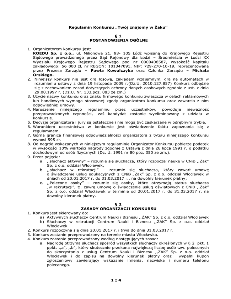 Regulamin Konkursu „Twój znajomy w Żaku” §1 POSTANOWIENIA OGÓLNE 1. Organizatorem konkursu jest: KOEDU Sp. z o.o., ul. Milionowa 21, 93- 105 Łódź wpisaną do Krajowego Rejestru Sądowego prowadzonego przez Sąd Rejonowy dla Łodzi – Śródmieścia w Łodzi XX Wydziału Krajowego Rejestru Sądowego pod nr 0000408587, wysokość kapitału zakładowego: 56 000 zł, nr REGON: 101347091, NIP: 729-270-10-19, reprezentowaną przez Prezesa Zarządu – Pawła Kowalczyka oraz Członka Zarządu – Michała Orskiego. 2. Niniejszy konkurs nie jest grą losową, zakładem wzajemnym, grą na automatach w rozumieniu ustawy z dnia 19 listopada 2009 r.(Dz.U. 2010.127.857) Konkurs odbędzie się z zachowaniem zasad dotyczących ochrony danych osobowych zgodnie z ust. z dnia 29.08.1997 r. (Dz.U. Nr. 133,poz. 883 ze zm.) 3. Użycie nazwy konkursu oraz znaku firmowego konkursu zwłaszcza w celach reklamowych lub handlowych wymaga stosownej zgody organizatora konkursu oraz zawarcia z nim odpowiedniej umowy. 4. Naruszenie niniejszego regulaminu przez uczestników, powoduje nieważność przeprowadzonych czynności, zaś kandydat zostanie wyeliminowany z udziału w konkursie. 5. Decyzje organizatora i jury są ostateczne i nie mogą być zaskarżane w odrębnym trybie. 6. Warunkiem uczestnictwa w konkursie jest oświadczenie faktu zapoznania się z regulaminem. 7. Górna granica finansowej odpowiedzialności organizatora z tytułu niniejszego konkursu wynosi 595 zł. 8. Od nagród wskazanych w niniejszym regulaminie Organizator Konkursu pobierze podatek w wysokości 10% wartości nagrody zgodnie z Ustawą z dnia 26 lipca 1991 r. o podatku dochodowym od osób fizycznych (Dz. U. 1991 nr 80 poz. 350 ze zm.). 9. Przez pojęcie: a. ,,słuchacz aktywny” – rozumie się słuchacza, który rozpoczął naukę w CNiB ,,Żak” Sp. z o.o. oddział Włocławek, b. ,,słuchacz w rekrutacji” – rozumie się słuchacza, który zawarł umowę o świadczenie usług edukacyjnych z CNiB „Żak” Sp. z o.o. oddział Włocławek w dniach od 20.01.2017 r. do 31.03.2017 r.. na dowolny kierunek płatny; c. ,,Polecone osoby” – rozumie się osoby, które otrzymają status słuchacza „w rekrutacji”, tj. zawrą umowę o świadczenie usług oświatowych z CNiB ,,Żak” Sp. z o.o. oddział Włocławek w terminie od 20.01.2017 r. do 31.03.2017 r. na dowolny kierunek płatny. 1. 2. 3. 4. §2 ZASADY ORGANIZACJI KONKURSU Konkurs jest skierowany do: a) Aktywnych słuchaczy Centrum Nauki i Biznesu ,,ŻAK” Sp. z o.o. oddział Włocławek b) Słuchaczy w rekrutacji Centrum Nauki i Biznesu ,,ŻAK” Sp. z o.o. oddział Włocławek Konkurs rozpoczyna się dnia 20.01.2017 r. i trwa do dnia 31.03.2017 r. Konkurs zostanie przeprowadzony na terenie miasta Włocławka. Konkurs zostanie przeprowadzony według następujących zasad: a. Nagrodę otrzyma słuchacz spośród wszystkich słuchaczy określonych w § 2 pkt. 1 ppkt. ,,a”, ,,b”, który skutecznie przekona największą liczbę osób tzw. poleconych do skorzystania z usług Centrum Nauki i Biznesu ,,ŻAK” Sp. z o.o. oddział Włocławek i do zapisu na dowolny kierunek płatny oraz wypełni kupon zgłoszeniowy zawierający wskazanie imienia, nazwiska i numeru telefonu polecanego. 1z4 b. W/w osoby aby wziąć udział w konkursie muszą polecić przynajmniej trzy osoby poprzez podanie imienia i nazwiska oraz numeru telefonu osoby polecanej – dane zamieszczane są na kuponie konkursowym. c. Osoba polecona przy zawieraniu umowy o świadczenie usług oświatowych z CNiB ŻAK filia Włocławek musi podać imię i nazwisko osoby polecającej. d. Kupony zgłoszeniowe dostępne będą w sekretariacie szkoły usług edukacyjnych z Centrum Nauki i Biznesu „ŻAK” Sp. z o.o., filia Włocławek przez okres trwania konkursu i w godzinach otwarcia sekretariatu. e. Polecenie/wskazanie osoby jest ważne kiedy osoba polecona zawrze umowę o świadczenie usług oświatowych z Centrum Nauki i Biznesu „ŻAK” Sp. z o.o., filia Włocławek na wybranym kierunku płatnym do dnia 31.03.2017 r. roku włącznie i nie złoży oświadczenia o jej wypowiedzeniu przed pierwszymi zajęciami. f. Osoby, które polecą najwięcej osób, które zawrą umowę o świadczenie usług oświatowych z Centrum Nauki i Biznesu „ŻAK” Sp. z o.o., filia Włocławek na kierunkach płatnych, do dnia 31.03.2017 roku wygrywają nagrody rzeczowe, o których mowa w §5 niniejszego regulaminu. Miejsce w konkursie zależy od ilości zapisanych osób polecanych. g. Aby wygrać nagrodę słuchacz musi polecić minimum trzy osoby, które zawrą umowę o świadczenie usług oświatowych z Centrum Nauki i Biznesu „ŻAK” Sp. z o.o., filia Włocławek na dowolnym kierunku płatnym, do dnia 31.03.2017 r. h. W przypadku, gdy dwie lub więcej osób polecą jednakową ilość osób, (dotyczy miejsca I, II i III) o wygranej decyduje kolejność zapisów poleconych osób. §3 SPOSÓB INFORMOWANIA O PRZEBIEGU KONKURSU Informacje o konkursie ukażą się na stronie: http://www.zak.edu.pl/, w zakładce „Aktualności” oraz na Facebookowym profilu CNiB Żak Włocławek www.facebook.com/szkolaZakWloclawek §4 PRZEBIEG KONKURSU 1. Konkurs rozpoczyna się dnia 20.01.2017 i trwa do dnia 31.03.2017 r. 2. Nagrody zostaną przyznane osobom, które polecą największą liczbę osób przez Komisję Konkursową w składzie: a. Kinga Mroczkowska - Przewodniczący Komisji Konkursowej b. Monika Krajewska - Członek Komisji Konkursowej 3. Komisja Konkursowa wyłoni zwycięzców w oparciu o następujące kryteria: zwycięzcy muszą być aktywnymi słuchaczami CNiB Żak Włocławek lub być słuchaczami w rekrutacji zwycięzcami zostają osoby, które polecą najwięcej osób, które zapiszą się do CNiB Żak z zastrzeżeniem § 2 ust. 4 pkt h. 4. Ogłoszenie wyników i przyznanie nagród odbędzie się 3 kwietnia 2017 r. 1. W §5 NAGRODY konkursie przyznane zostaną trzy nagrody: I miejsce - tablet Huawei Media Pad T1-701W, o wa
