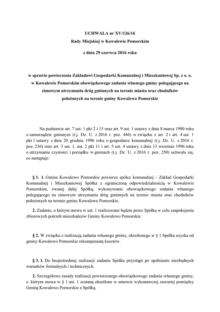 UCHWAŁA nr XV/126/16 Rady Miejskiej w Kowalewie Pomorskim z dnia 29 czerwca 2016 roku w sprawie powierzenia Zakładowi Gospodarki Komunalnej i Mieszkaniowej Sp. z o. o. w Kowalewie Pomorskim obowiązkowego zadania własnego gminy polegającego na zimowym utrzymaniu dróg gminnych na terenie miasta oraz chodników położonych na terenie gminy Kowalewo Pomorskie Na podstawie art. 7 ust. 1 pkt 2 i 15 oraz art. 9 ust. 1 ustawy z dnia 8 marca 1990 roku o samorządzie gminnym (t.j. Dz. U. z 2016 r. poz. 446) w związku z art. 2 i art. 4 ust. 1 pkt 1 ustawy z dnia 20 grudnia 1996 roku o gospodarce komunalnej (t.j. Dz. U. z 2016 r. poz. 236) oraz art. 3 ust. 1, ust. 2 pkt 11 i art. 5 ust. 4 ustawy z dnia 13 września 1996 roku o utrzymaniu czystości i porządku w gminach (t.j. Dz. U. z 2016 r. poz. 250) uchwala się, co następuje: § 1. 1. Gmina Kowalewo Pomorskie powierza spółce komunalnej - Zakład Gospodarki Komunalnej i Mieszkaniowej Spółka z ograniczoną odpowiedzialnością w Kowalewie Pomorskim, zwanej dalej Spółką, wykonywanie obowiązkowego zadania własnego polegającego na zimowym utrzymaniu dróg gminnych na terenie miasta oraz chodników położonych na terenie gminy Kowalewo Pomorskie. 2. Zadanie, o którym mowa w ust. 1 realizowane będzie przez Spółkę w celu zaspokojenia zbiorowych potrzeb mieszkańców Gminy Kowalewo Pomorskie. § 2. W związku z realizacją zadania własnego gminy, określonego w § 1 Spółka uzyska od gminy Kowalewo Pomorskie rekompensatę kosztów. § 3. 1. Do bezpośredniej realizacji zadania Spółka przystąpi po spełnieniu niezbędnych warunków formalnych i technicznych. 2. Szczegółowe zasady realizacji powierzonego obowiązkowego zadania własnego gminy, o którym mowa w § 1 ust. 1 zostaną określone w umowie wykonawczej zawartej pomiędzy Gminą Kowalewo Pomorskie a Spółką. § 4. Wykonanie uchwały powierza się Burmistrzowi Miasta Kowalewo Pomorskie. § 5. Uchwała wchodzi w życie z dniem podjęcia. Przewodniczący Rady Jerzy Orłowski UZASADNIENIE do Uchwały nr XV/126/16 Rady Miejskiej w Kowalewie Pomorskim z dnia 29 czerwca 2016 roku Z art. 7 ustawy z dnia 8 marca 1990 roku o samorządzie gminnym (t.j. Dz. U. z 2016 r. poz. 446) wynika, że zaspokajanie zbiorowych potrzeb wspólnoty należy do zadań własnych gminy. Zadania własne obejmują m.in. sprawy: - gminnych dróg, ulic, mostów, placów oraz organizacji ruchu drogowego; - utrzymania gminnych obiektów i urządzeń użyteczności publicznej oraz obiektów administracyjnych. Dodatkowo art. 9 ust. 1 ww. ustawy stanowi, że w celu wykonywania zadań gmina może tworzyć jednostki organizacyjne, a także zawierać umowy z innymi podmiotami, w tym z organizacjami pozarządowymi Zgodnie z art. 2 i art. 4 ust. 1 pkt 1 ustawy z dnia 20 grudnia 1996 roku o gospodarce komunalnej (t.j. Dz. U. z 2016 r. poz. 236) gospodarka komunalna może być prowadzona przez jednostki samorządu terytorialnego w szczególności w formach samorządowego zakładu budżetowego lub spółek prawa handlowego. Jeżeli przepisy szczególne nie stanowią inaczej, organy stanowiące jednostek samorządu terytorialnego postanawiają o wyborze sposobu prowadzenia i form gospodarki komunalnej. Ponadto zgodnie z art. 3 ust. 1, ust. 2 pkt 11 i art. 5 ust. 4 ustawy z dnia 13 września 1996 roku o utrzymaniu czystości i porządku w gminach (t.j. Dz. U. z 2016 r. poz. 250) utrzymanie czystości i porządku w gminach należy do obowiązkowych zadań własnych gminy. Gminy zapewniają czystość i porządek na swoim terenie i tworzą warunki niezbędne do ich utrzymania - m.in. zapobiegają zanieczyszczaniu ulic, placów i terenów otwartych, w szczególności przez: zbieranie i pozbywanie się błota, śniegu, lodu oraz innych zanieczyszczeń uprzątniętych z chodników przez właścicieli nieruchomości oraz odpadów zgromadzonych w przeznaczonych do tego celu pojemnikach ustawionych na chodniku. Jednocześnie należy zaznaczyć, że obowiązki utrzymania czystości i porządku na drogach publicznych należą do zarządu drogi, a według art. 19 ust. 2 ustawy z dnia 21 marca 1985 r. (t.j. Dz. U. z 2015 r. poz. 460 z późn. zm.) o drogach publicznych zarządcą dróg gminnych jest wójt (burmistrz, prezydent miasta). Wobec powyższego, obowiązek właściwego utrzymania dróg, w tym utrzymania czystości i porządku jezdni i chodników oraz innych elementów pasa drogowego w okresie zimowym należy do zadań własnych gminy. Oznacza to, że powierzone niniejszą uchwałą zadanie należy do zadań własnych Gminy Kowalewo Pomorskie. W ramach swoich kompetencji rada gminy może jednostronnie nałożyć na spółkę komunalną realizację zadań własnych gminy. Jest to akt władczy, który bezpośrednio powierza realizację określonego zadania „podmiotowi wewnętrznemu”. Spółka komunalna ma charakter podmiotu wewnętrznego, w przypadku gdy: - jednostka samorządu terytorialnego ma decydujący wpływ na decyzje podejmowane przez spółkę komunalną w zakresie prowadzonej przez nią działalności o charakterze użyteczności publicznej zleconej przez jednostkę samorządu terytorialnego, - jednostka samorządu terytorialnego posiada 100% udziałów w spółce komunalnej i zachowuje ten udział przez cały okres trwania zobowiązania do świadczenia usług publicznych, - usługi zlecone przez jednostkę samorządu terytorialnego stanowią przedmiot działalności spółki komunalnej. Z powyższego wynika, że Zakład Gospodarki Komunalnej i Mieszkaniowej Sp. z o. o. w Kowalewie Pomorskim spełnia warunki, dotyczące charakteru podmiotu wewnętrznego, dlatego też możliwe jest powierzenie ww. spółce komunalnej zadań własnych Gminy Kowalewo Pomorskie. Kwestie szczegółowe związane z realizacją ww. zadań należy uregulować w umowie wykonawczej, która nie podlega ustawie - Prawo zamówień publicznych, ponieważ źródłem zobowiązania do świadczenia usług jest w takim przypadku odpowiedni a