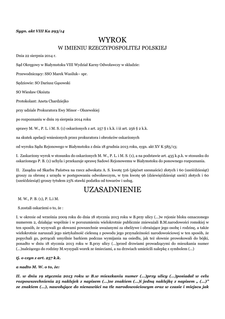 Sygn. akt VIII Ka 293/14 WYROK W IMIENIU RZECZYPOSPOLITEJ POLSKIEJ Dnia 22 sierpnia 2014 r. Sąd Okręgowy w Białymstoku VIII Wydział Karny Odwoławczy w składzie: Przewodniczący: SSO Marek Wasiluk– spr. Sędziowie: SO Dariusz Gąsowski SO Wiesław Oksiuta Protokolant: Aneta Chardziejko przy udziale Prokuratora Ewy Minor - Olszewskiej po rozpoznaniu w dniu 19 sierpnia 2014 roku sprawy M. W., P. L. i M. S. (1) oskarżonych z art. 257 § 1 k.k. i iż art. 256 § 2 k.k. na skutek apelacji wniesionych przez prokuratora i obrońców oskarżonych od wyroku Sądu Rejonowego w Białymstoku z dnia 18 grudnia 2013 roku, sygn. akt XV K 585/13; I. Zaskarżony wyrok w stosunku do oskarżonych M. W., P. L. i M. S. (1), a na podstawie art. 435 k.p.k. w stosunku do oskarżonego P. B. (1) uchyla i przekazuje sprawę Sadowi Rejonowemu w Białymstoku do ponownego rozpoznania. II. Zasądza od Skarbu Państwa na rzecz adwokata A. S. kwotę 516 (pięćset szesnaście) złotych i 60 (sześćdziesiąt) groszy za obronę z urzędu w postępowaniu odwoławczym, w tym kwotę 96 (dziewięćdziesiąt sześć) złotych i 60 (sześćdziesiąt) groszy tytułem 23% stawki podatku od towarów i usług. UZASADNIENIE M. W., P. B. (1), P. L.i M. S.zostali oskarżeni o to, że : I. w okresie od września 2009 roku do dnia 18 stycznia 2013 roku w B.przy ulicy (...)w rejonie bloku oznaczonego numerem 2, działając wspólnie i w porozumieniu wielokrotnie publicznie znieważali B.M.narodowości romskiej w ten sposób, że wyzywali go słowami powszechnie uważanymi za obelżywe i obrażające jego osobę i rodzinę, a także wielokrotnie naruszali jego nietykalność cielesną z powodu jego przynależności narodowościowej w ten sposób, że popychali go, potrącali umyślnie barkiem podczas wymijania na osiedlu, jak też słownie prowokowali do bójki, ponadto w dniu 18 stycznia 2013 roku w B.przy ulicy (...)przed drzwiami prowadzącymi do mieszkania numer (...)należącego do rodziny M.wysypali worek ze śmieciami, a na drzwiach umieścili nalepkę z symbolem (...) tj. o czyn z art. 257 k.k. a nadto M. W. o to, że: II. w dniu 19 stycznia 2013 roku w B.w mieszkaniu numer (...)przy ulicy (...)posiadał w celu rozpowszechnienia 25 naklejek z napisem (...)ze znakiem (...)i jedną naklejkę z napisem „ (...)” ze znakiem (...), nawołujące do nienawiści na tle narodowościowym oraz w czasie i miejscu jak powyżej posiadał na swoim telefonie (...)- numer (...) (...)- (...)-0 w celu rozpowszechnienia dwa pliki zdjęciowe zawierające wizerunek orła białego ze znakiem (...)i napisem „ Wielka Polska na zawsze” oraz wizerunek orła białego ze znakiem (...)i napisem (...)nawołujące do nienawiści na tle narodowościowym, tj. o czyn z art. 256 § 2 k.k. oraz P. L. o to, że: III. w dniu 19 stycznia 2013 roku w B.w mieszkaniu numer (...)przy ulicy (...)posiadał w celu rozpowszechnienia naklejkę z napisem (...)ze znakiem (...)oraz dziewięć naklejek z napisem „ (...)” ze znakiem (...), nawołujące do nienawiści na tle narodowościowym, tj. o czyn z art. 256 § 2 k.k. oraz M. S. (1) o to, że: IV. w dniu 19 stycznia 2013 roku w B.w mieszkaniu numer (...)przy ulicy (...)posiadał w celu rozpowszechnienia 23 naklejki z napisem (...)ze znakiem (...)jedną naklejkę z napisem „ (...)” ze znakiem (...), jedną naklejkę z wizerunkiem orła białego i umięśnionego mężczyzny z napisem „ (...)nawołujące do nienawiści na tle narodowościowym, jedną naklejkę przedstawiającą postać która kopie okręg z napisem „ (...)”, zawierającą treść propagującą faszystowski ustrój państwa oraz w czasie i miejscu jak powyżej posiadał na swoim telefonie (...)numer (...)w celu rozpowszechnienia dwa pliki zdjęciowe zawierające wizerunek orła białego ze znakiem (...)i napisem „ (...)” oraz wizerunek orła białego ze znakiem (...)i napisem (...)nawołujące do nienawiści na tle narodowościowym, tj. o czyn z art. 256 § 2 k.k. Sąd Rejonowy w Białymstoku wyrokiem z dnia 18 grudnia 2013 roku oskarżonych M. W., P. B. (1), P. L.i M. S. (1)w zakresie czynu opisanego w pkt I uznał za winnych tego, że w okresie od września 2009 roku do dnia 18 stycznia 2013 roku w B.przy ulicy (...)w rejonie bloku oznaczonego numerem (...)działając wspólnie i w porozumieniu wielokrotnie publicznie znieważali B.M.narodowości romskiej w ten sposób, że wyzywali go słowami powszechnie uważanymi za obelżywe i obrażające jego osobę i rodzinę, a także wielokrotnie naruszali jego nietykalność cielesną z powodu jego przynależności narodowościowej w ten sposób, że popychali go, potrącali umyślnie barkiem podczas wymijania, jak też słownie prowokowali do bójki, w szczególności nieustalonego dnia w pierwszej połowie stycznia 2013 r. na klatce schodowej bloku nr (...)przy ul. (...)zaczepili B.M.uniemożliwiając wejście do mieszkania i wyzywali go słowami „czarnuch, brudas, cygan, ciota, lamus obszczymurek, cygany to brudasy, cygany to złodzieje” krzycząc przy tym „Polska dla Polaków, (...)P.” tj. popełnienia czynu z art. 257 k.k. i za to na podstawie art. 257 k.k. skazał ich na kary po 8 (osiem) miesięcy pozbawienia wolności. Na podstawie art. 69 § 1 i 2 k.k., art. 70 § 2 k.k., art. 73 § 2 k.k. wykonanie orzeczonych kar pozbawienia wolności warunkowo zawiesił wszystkim oskarżonym na okres próby wynoszący 3 (trzy) lata i oddał ich w tym czasie pod dozór kuratora. Oskarżonego M. W. uniewinnił od popełnienia czynu opisanego w pkt II. Oskarżonego P. L. uniewinnił od popełnienia czynu opisanego w pkt III. Oskarżonego M. S. (1) uniewinnił od popełnienia czynu opisanego w pkt IV. Zasądził od Skarbu Państwa na rzecz adw. A. S. kwotę 708,48 (siedemset osiem 48/100) złotych w tym 132,48 (sto trzydzieści dwa 48/100) złote podatku VAT, tytułem zwrotu kosztów obrony z urzędu. Pobrał od oskarżonych M. W., P. B. (1) i M. S. (1) kwoty po 180 (sto osiemdziesiąt) 