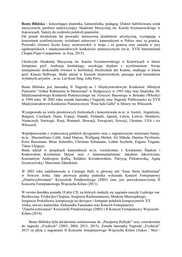 Beata Bilińska - koncertująca pianistka, kameralistka, pedagog. Doktor habilitowana sztuk muzycznych, profesor nadzwyczajny Akademii Muzycznej im. Karola Szymanowskiego w Katowicach. Należy do czołówki polskich pianistów. Od ponad dwudziestu lat prowadzi intensywną działalność artystyczną, występując z koncertami symfonicznymi, recitalami solowymi i kameralnymi w Polsce oraz za granicą. Prowadzi również liczne kursy mistrzowskie w kraju i za granicą oraz zasiada w jury ogólnopolskich i międzynarodowych konkursów pianistycznych (m.in. XVII International Chopin Piano Competition in Asia, 2015). Ukończyła Akademię Muzyczną im. Karola Szymanowskiego w Katowicach w klasie fortepianu prof. Andrzeja Jasińskiego, uzyskując dyplom z wyróżnieniem. Swoje umiejętności doskonaliła również w berlińskiej Hochschule der Kunste, studiując w klasie prof. Klausa Hellwiga. Brała udział w kursach mistrzowskich, pracując pod kierunkiem wybitnych artystów , m.in. Lee Kum Sing, John Perry. Beata Bilińska jest laureatką II Nagrody na I Międzynarodowym Konkursie Młodych Pianistów "Arthur Rubinstein in Memoriam" w Bydgoszczy w 1993 roku oraz finalistką 46. Międzynarodowego Konkursu Pianistycznego im. Feruccio Busoniego w Bolzano (Włochy) w 1994 roku. W 2002 roku została laureatką I Nagrody oraz Nagrody Publiczności na XVII Międzynarodowym Konkursie Pianistycznym "Rina Sala Gallo" w Monzy we Włoszech. Występowała na wielu prestiżowych festiwalach i koncertowała m.in. w Austrii, Argentynie, Bułgarii, Czechach, Danii, Francji, Irlandii, Finlandii, Japonii, Litwie, Łotwie, Mołdawii, Niemczech, Norwegii, Rosji, Rumunii, Słowacji, Szwajcarii, Szwecji, Ukrainie, USA i we Włoszech. Współpracowała z większością polskich dyrygentów oraz z zagranicznymi mistrzami batuty, m.in.: Massimiliano Caldi, Antal Matyas, Wolfgang Michel, Jiri Mikula, Dainius Pavilionis, Kriss Russmann, Brian Schembri, Christian Schumann, Lothar Seyfarth, Eugene Tzigane, Takao Ukigaya. Brała udział w projektach kameralnych m.in. wielokrotnie z Kwartetem Śląskim i Krakowskim Kwintetem Dętym oraz z instrumentalistami: Jakubem Jakowiczem, Konstantym Andrzejem Kulką, Rafałem Kwiatkowskim, Patrycją Piekutowską, Agatą Szymczewską i Marcinem Zdunikiem. W 2003 roku zadebiutowała w Carnegie Hall, w głównej sali "Isaac Stern Auditorium" w Nowym Jorku. Jako pierwsza polska pianistka wykonała Koncert Fortepianowy „Zmartwychwstanie” Krzysztofa Pendereckiego (2005) oraz jest prawykonawczynią II Koncertu Fortepianowego Wojciecha Kilara (2011). W swoim dorobku posiada 10 płyt CD, na których znalazły się nagrania muzyki Ludwiga van Beethovena, Fryderyka Chopina, Sergiusza Rachmaninowa, Modesta Musorgskiego, Sergiusza Prokofiewa, kompozycje na skrzypce i fortepian polskich kompozytorów XX wieku, utwory kameralne Aleksandra Tansmana oraz Koncert Fortepianowy "Zmartwychwstanie" Krzysztofa Pendereckiego (2005) i II Koncert Fortepianowy Wojciecha Kilara (2014). Beata Bilińska była dwukrotnie nominowana do „Paszportu Polityki” oraz czterokrotnie do nagrody „Fryderyk" (2003, 2004, 2013, 2015). Została laureatką Nagrody „Fryderyk” 2015 za płytę z nagraniem II Koncertu fortepianowego Wojciecha Kilara (Aukso / Moś / 2014). Za swoje pozostałe płyty otrzymała liczne nagrody fonograficzne, m.in.: dwukrotnie "Pizzicato Supersonic Award" w Luxemburgu, "Joker Award" przyznawaną przez belgijskie "Les Crescendo", "Scherzo Award" w Madrycie i "Musica Award" w Rzymie oraz najbardziej prestiżowe wyróżnienie fonograficzne MIDEM Classical Award 2008.