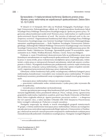 336 Sprawozdania i recenzje Sprawozdanie z II międzynarodowej konferencji Społeczne granice pracy. Wymiary pracy nieformalnej we współczesnych społeczeństwach, Zielona Góra 12–13.11.2015 W dniach 12–13 listopada 2015 roku na Wydziale Pedagogiki, Psychologii i Socjologii Uniwersytetu Zielonogórskiego odbyła się II międzynarodowa konferencja Sekcji Socjologii Pracy Polskiego Towarzystwa Socjologicznego pt. Społeczne granice pracy. Tegoroczna edycja konferencji nosiła tytuł Wymiary pracy nieformalnej we współczesnych społeczeństwach (Social boundaries of work. The varieties of informal work in the contemporary societies)1. Organizatorami konferencji byli Sekcja Socjologii Pracy Polskiego Towarzystwa Socjologicznego oraz Instytut Socjologii Uniwersytetu Zielonogórskiego, natomiast współorganizatorami — Koło Naukowe Socjologów Uniwersytetu Zielonogórskiego, Zielonogórski Oddział Polskiego Towarzystwa Socjologicznego oraz Instytut Socjologii Uniwersytetu Wrocławskiego. Konferencja była współfinansowana przez Ministerstwo Nauki i Szkolnictwa Wyższego. Zgromadziła ponad 70 uczestników, reprezentantów m.in. Polski, Wielkiej Brytanii, Niemiec, Czech, Turcji oraz Bułgarii. Dyskusja w czasie II konferencji skoncentrowana była na problematyce pracy poza formalnym zatrudnieniem we współczesnych społeczeństwach. Pod uwagę wzięte zostały praca w szarej strefie, praca wykonywana nieodpłatnie (praca reprodukcyjna, wolontariat), a także praca w nietypowych formach zatrudnienia, takich jak umowy cywilnoprawne w Polsce. Wystąpienia konferencyjne podejmowały zarówno wątki teoretyczne, jak i praktyczne, związane z pracą nieformalną, a także rolę i opinie związków zawodowych i organizacji pracowniczych dotyczące pracy nieformalnej. Głównymi celami konferencji były próby socjologicznej redefi nicji kategorii pracy nieformalnej, konsekwencji i warunków oraz wymiarów pracy nieformalnej. W trakcie konferencji uczestnicy przedstawiali swoje wystąpienia w ramach trzech grup tematycznych: — koncepcje pracy nieformalnej i obszary jej występowania, — pracownicy nieformalni wobec zróżnicowania i rynku pracy jako wyzwanie dla praktyki społecznej, — warunki pracy nieformalnej i jej konsekwencje. Gośćmi specjalnymi pierwszego dnia konferencji byli: prof. Kazimierz Z. Sowa (Uniwersytet Jagielloński), który przedstawił referat pt. Praca, rodzaje, formy, ograniczenia; gospodarka nieformalna, kapitalizm socjalizm, prof. Jane Hardy (University of Hertfordshire), która wygłosiła referat pt. Against pessimism: precarious workers — a dangerous but not separate class, a także Jarosław Urbański (KK OZZ Inicjatywa Pracownicza), który wystąpił z referatem pt. Prekariat a związki zawodowe. Następnie rozpoczęły się obrady w trzech równoległych grupach tematycznych. W grupie, w której analizowano koncepcje pracy nieformalnej i obszary jej występowania jako pierwsza swój referat zaprezentowała Birgit Apitzsch z Uniwersytetu w Duisburgu, a dotyczył on nowych i starych procesów związanych z nieformalnym rynkiem pracy i konsekwencji dla jednostek w kontekście socjologii pracy. Następnie wystąpił Zbigniew 1 www.socialboundariesofwork.pl. Forum Socjologiczne 6, 2015 © for this edition by CNS forum_socjologiczne6.indd 336 2016-09-12 10:45:48 Sprawozdania i recenzje 337 Galor z Uniwersytetu Szczecińskiego z referatem związanym z lumpen ekonomią. Kolejną występującą była Dagmara Nikulin z Politechniki Gdańskiej, której wystąpienie miało na celu przedstawienie problemów definicyjnych związanych z nieformalną pracą i sposobami jej pomiaru. Następnie Julia Kubisa z Uniwersytetu w Gothenburgu przedstawiła referat dotyczący podziałów na rynku pracy związanych z płcią. Ostatnią prelegentką w tej części była Olga Czeranowska z Uniwersytetu Warszawskiego, która w swoim wystąpieniu poruszyła kwestie związane z prestiżem nieformalnej pracy opiekuńczej. Po krótkiej przerwie w tej samej grupie tematycznej jako pierwsza wystąpiła Agata Krasowska z Uniwersytetu Wrocławskiego z referatem dotyczącym pracy dla zatrudnienia. Następna prelegentka, Alexandra Florea z Uniwersytetu Goethego, przedstawiła tezy dotyczące pracy z wykorzystaniem najnowszych technologii, zdalnych pracowników i ich jakości życia. Następnie Katarzyna Dębska z Uniwersytetu Warszawskiego wygłosiła referat dotyczący pracy reprodukcyjnej i jej prawnych granic. Paul Stewart z Uniwersytetu w Strathclyde wygłosił referat o ekonomii politycznej w ruchach społecznych Brazylii. Grupę tematyczną pierwszego dnia konferencji zamknęło wystąpienie Alicji Bobek z TASC z Dublina, odnoszące się do sytuacji na rynku pracy we współczesnej Irlandii. W drugiej grupie tematycznej analizowano sytuację pracowników nieformalnych. Jako pierwsza w tej grupie wystąpiła Krystyna Janicka z Uniwersytetu Zielonogórskiego, która przedstawiła referat dotyczący pracy i zawodu jako źródła strukturalizacji społecznej. Następnie Radomir Miński w swoim wystąpieniu poruszył kwestie dyferencjacji pracowników naukowych w gospodarce rynkowej. Kolejni prelegenci, Hrvoje Butković i Višnja Samardžija z Instytutu Rozwoju i Relacji Międzynarodowych z Chorwacji, przedstawili sytuację nietypowych form pracy w Chorwacji. Jako ostatnia w tej części wystąpiła Anna Trofimova z Ukraińskiej Akademii Nauk z referatem o młodych ukraińskich migrantach w Polsce i ich strategiach na rynku pracy. Po przerwie jako pierwsza w grupie wystąpiła Dominika Polkowska z Uniwersytetu Marii Curie-Skłodowskiej, która mówiła o pułapce prekaryjności wśród osób wchodzących na rynek pracy. Następnie Anna Mielczarek-Żejmo z Uniwersytetu Zielonogórskiego przedstawiła tezy na temat partnerstwa lokalnego na rzecz rynku pracy w kontekście zatrudnienia nieformalnego. Kolejna prelegentka z Uniwersytetu Zielonogórskiego, Joanna Frątczak-Muller, mówiła o 