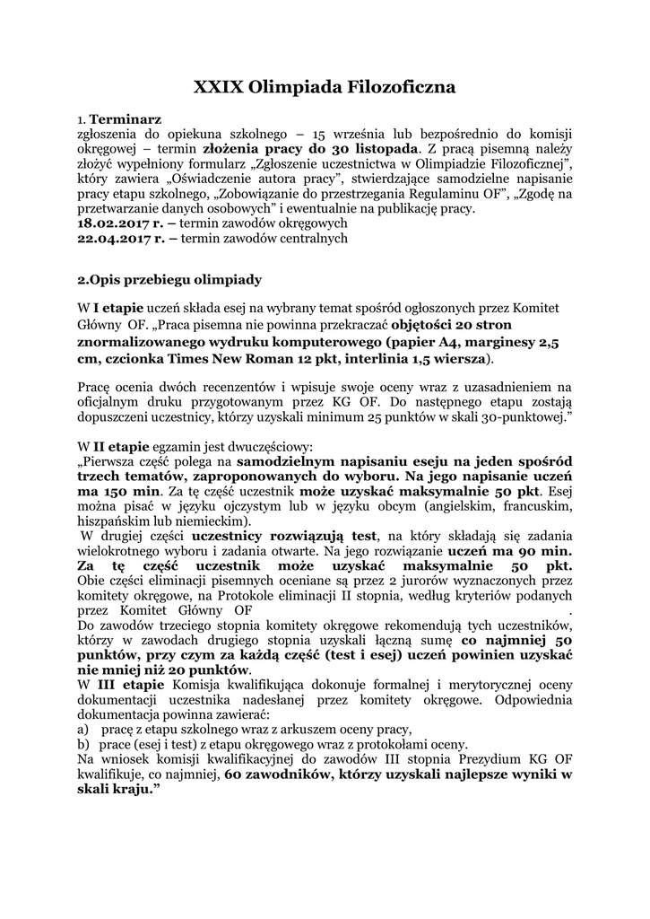 XXIX Olimpiada Filozoficzna 1. Terminarz zgłoszenia do opiekuna szkolnego – 15 września lub bezpośrednio do komisji okręgowej – termin złożenia pracy do 30 listopada. Z pracą pisemną należy złożyć wypełniony formularz „Zgłoszenie uczestnictwa w Olimpiadzie Filozoficznej”, który zawiera „Oświadczenie autora pracy”, stwierdzające samodzielne napisanie pracy etapu szkolnego, „Zobowiązanie do przestrzegania Regulaminu OF”, „Zgodę na przetwarzanie danych osobowych” i ewentualnie na publikację pracy. 18.02.2017 r. – termin zawodów okręgowych 22.04.2017 r. – termin zawodów centralnych 2.Opis przebiegu olimpiady W I etapie uczeń składa esej na wybrany temat spośród ogłoszonych przez Komitet Główny OF. „Praca pisemna nie powinna przekraczać objętości 20 stron znormalizowanego wydruku komputerowego (papier A4, marginesy 2,5 cm, czcionka Times New Roman 12 pkt, interlinia 1,5 wiersza). Pracę ocenia dwóch recenzentów i wpisuje swoje oceny wraz z uzasadnieniem na oficjalnym druku przygotowanym przez KG OF. Do następnego etapu zostają dopuszczeni uczestnicy, którzy uzyskali minimum 25 punktów w skali 30-punktowej.” W II etapie egzamin jest dwuczęściowy: „Pierwsza część polega na samodzielnym napisaniu eseju na jeden spośród trzech tematów, zaproponowanych do wyboru. Na jego napisanie uczeń ma 150 min. Za tę część uczestnik może uzyskać maksymalnie 50 pkt. Esej można pisać w języku ojczystym lub w języku obcym (angielskim, francuskim, hiszpańskim lub niemieckim). W drugiej części uczestnicy rozwiązują test, na który składają się zadania wielokrotnego wyboru i zadania otwarte. Na jego rozwiązanie uczeń ma 90 min. Za tę część uczestnik może uzyskać maksymalnie 50 pkt. Obie części eliminacji pisemnych oceniane są przez 2 jurorów wyznaczonych przez komitety okręgowe, na Protokole eliminacji II stopnia, według kryteriów podanych przez Komitet Główny OF . Do zawodów trzeciego stopnia komitety okręgowe rekomendują tych uczestników, którzy w zawodach drugiego stopnia uzyskali łączną sumę co najmniej 50 punktów, przy czym za każdą część (test i esej) uczeń powinien uzyskać nie mniej niż 20 punktów. W III etapie Komisja kwalifikująca dokonuje formalnej i merytorycznej oceny dokumentacji uczestnika nadesłanej przez komitety okręgowe. Odpowiednia dokumentacja powinna zawierać: a) pracę z etapu szkolnego wraz z arkuszem oceny pracy, b) prace (esej i test) z etapu okręgowego wraz z protokołami oceny. Na wniosek komisji kwalifikacyjnej do zawodów III stopnia Prezydium KG OF kwalifikuje, co najmniej, 60 zawodników, którzy uzyskali najlepsze wyniki w skali kraju.” 3. Dlaczego warto wziąć udział w tej olimpiadzie? Olimpiada Filozoficzna jest prostsza niż wiele innych olimpiad przedmiotowych. Nie znaczy to, że jest bardzo łatwa. Jednak przy systematycznej pracy można odnieść w niej sukces zaledwie w ciągu jednego roku szkolnego. Zapraszamy wszystkich uczniów lubiących wyzwania i przygodę z nowością, nie tylko interesujących się filozofią. 4.Adres strony internetowej olimpiady: http://www.ptfilozofia.pl/ 5. Koordynator olimpiady: Grzegorz Śliwiński