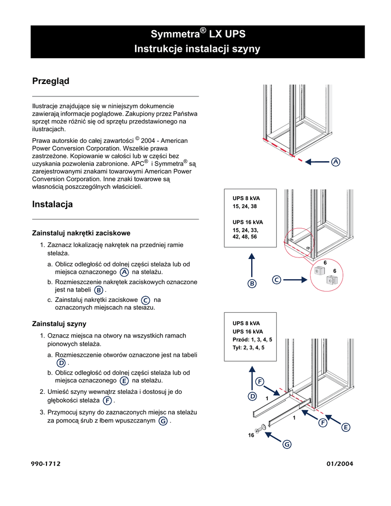 Symmetra® LX UPS Instrukcje instalacji szyny . Przegląd Ilustracje znajdujące się w niniejszym dokumencie zawierają informacje poglądowe. Zakupiony przez Państwa sprzęt może różnić się od sprzętu przedstawionego na ilustracjach. Prawa autorskie do całej zawartości © 2004 - American Power Conversion Corporation. Wszelkie prawa zastrzeżone. Kopiowanie w całości lub w części bez uzyskania pozwolenia zabronione. APC® i Symmetra® są zarejestrowanymi znakami towarowymi American Power Conversion Corporation. Inne znaki towarowe są własnością poszczególnych właścicieli. Instalacja Zainstaluj nakrętki zaciskowe A UPS 8 kVA 15, 24, 38 UPS 16 kVA 15, 24, 33, 42, 48, 56 1. Zaznacz lokalizację nakrętek na przedniej ramie stelaża. 6 a. Oblicz odległość od dolnej części stelaża lub od miejsca oznaczonego A na stelażu. b. Rozmieszczenie nakrętek zaciskowych oznaczone jest na tabeli B . 6 C B c. Zainstaluj nakrętki zaciskowe C na oznaczonych miejscach na stelażu. Zainstaluj szyny 1. Oznacz miejsca na otwory na wszystkich ramach pionowych stelaża. UPS 8 kVA UPS 16 kVA Przód: 1, 3, 4, 5 Tył: 2, 3, 4, 5 a. Rozmieszczenie otworów oznaczone jest na tabeli D . b. Oblicz odległość od dolnej części stelaża lub od miejsca oznaczonego E na stelażu. 2. Umieść szyny wewnątrz stelaża i dostosuj je do głębokości stelaża F . F D 1 3. Przymocuj szyny do zaznaczonych miejsc na stelażu za pomocą śrub z łbem wpuszczanym G . 1 F E 16 G 990-1712 01/2004 . Szafa zasilacza awaryjnego Symmetra® LX Extended Run Instrukcje instalacji szyny Instalacja Zainstaluj nakrętki zaciskowe 1. Zaznacz lokalizację nakrętek na przedniej ramie stelaża. a. Oblicz odległość od pierwszego miejsca A nad zasilaczem UPS. A b. Rozmieszczenie nakrętek zaciskowych oznaczone jest na tabeli B . c. Zainstaluj nakrętki zaciskowe C na oznaczonych miejscach na stelażu. 3 rama akumulatora 13 Zainstaluj szyny 1. Oznacz miejsca na otwory na wszystkich ramach pionowych stelaża. 9 rama akumulatora 15, 24, 33 a. Rozmieszczenie otworów oznaczone jest na tabeli D . b. Oblicz odległość od pierwszego miejsca E nad zasilaczem UPS. 3 3 2. Umieść szyny wewnątrz stelaża i dostosuj je do głębokości stelaża F . C B 3. Przymocuj szyny do zaznaczonych miejsc na stelażu za pomocą śrub z łbem wpuszczanym G . 3 rama akumulatora 9 rama akumulatora Tył: 1, 3, 4, 5 Tył: 2, 3, 4, 5 F D 1 1 F E 16 G 990-1712 01/2004