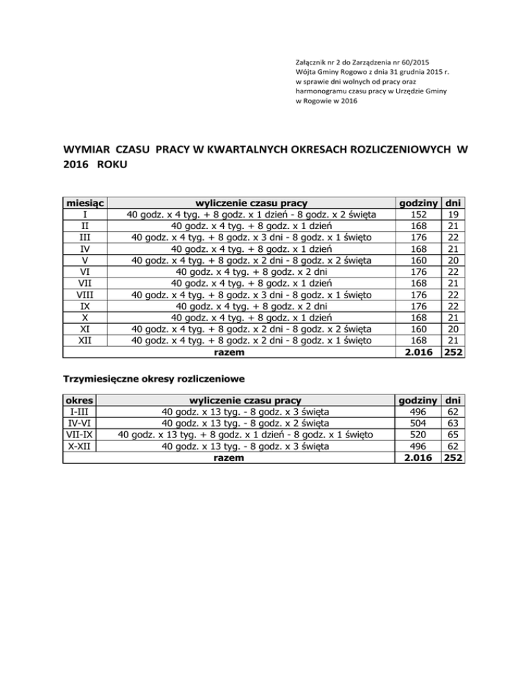 Załącznik nr 2 do Zarządzenia nr 60/2015 Wójta Gminy Rogowo z dnia 31 grudnia 2015 r. w sprawie dni wolnych od pracy oraz harmonogramu czasu pracy w Urzędzie Gminy w Rogowie w 2016 WYMIAR CZASU PRACY W KWARTALNYCH OKRESACH ROZLICZENIOWYCH W 2016 ROKU miesiąc I II III IV V VI VII VIII IX X XI XII wyliczenie czasu pracy 40 godz. x 4 tyg. + 8 godz. x 1 dzień - 8 godz. x 2 święta 40 godz. x 4 tyg. + 8 godz. x 1 dzień 40 godz. x 4 tyg. + 8 godz. x 3 dni - 8 godz. x 1 święto 40 godz. x 4 tyg. + 8 godz. x 1 dzień 40 godz. x 4 tyg. + 8 godz. x 2 dni - 8 godz. x 2 święta 40 godz. x 4 tyg. + 8 godz. x 2 dni 40 godz. x 4 tyg. + 8 godz. x 1 dzień 40 godz. x 4 tyg. + 8 godz. x 3 dni - 8 godz. x 1 święto 40 godz. x 4 tyg. + 8 godz. x 2 dni 40 godz. x 4 tyg. + 8 godz. x 1 dzień 40 godz. x 4 tyg. + 8 godz. x 2 dni - 8 godz. x 2 święta 40 godz. x 4 tyg. + 8 godz. x 2 dni - 8 godz. x 1 święto razem godziny dni 152 19 168 21 176 22 168 21 160 20 176 22 168 21 176 22 176 22 168 21 160 20 168 21 2.016 252 Trzymiesięczne okresy rozliczeniowe okres I-III IV-VI VII-IX X-XII wyliczenie czasu pracy 40 godz. x 13 tyg. - 8 godz. x 3 święta 40 godz. x 13 tyg. - 8 godz. x 2 święta 40 godz. x 13 tyg. + 8 godz. x 1 dzień - 8 godz. x 1 święto 40 godz. x 13 tyg. - 8 godz. x 3 święta razem godziny dni 496 62 504 63 520 65 496 62 2.016 252
