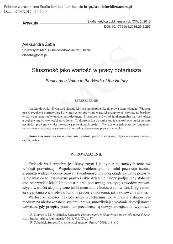 Pobrane z czasopisma Studia Iuridica Lublinensia http://studiaiuridica.umcs.pl Data: 07/03/2017 05:45:40 Studia Iuridica Lublinensia vol. XXV, 2, 2016 Artykuły DOI: 10.17951/sil.2016.25.2.257 Aleksandra Żaba Uniwersytet Marii Curie-Skłodowskiej w Lublinie CS [email protected] Słuszność jako wartość w pracy notariusza M Equity as a Value in the Work of the Notary STRESZCZENIE U Artykuł dowodzi, iż wartość słuszności nieustannie przenika do prawa stanowionego. Wkracza ona w regulacje normatywne i otwiera system prawa na wartości pozaprawne, czyniąc go bardziej wrażliwym na potrzeby otoczenia społecznego. Słuszność to również fundamentalna wartość leżąca u podstaw prawniczej etyki zawodowej. To doprowadza do wniosku, że stanowi ona punkt styczny pomiędzy prawem a etyką zawodową prawniczych profesji. Wyraża ona jednocześnie fundamentalny nakaz etycznego postępowania i wspólną płaszczyznę prawa oraz etyki. Słowa kluczowe: notariusz; słuszność; wartość; prawo stanowione; etyka zawodowa prawniczych profesji WproWAdzenie związek lex i aequitas jest klasycznym i jednym z najstarszych tematów releksji prawniczej1. Współcześnie problematyka ta nadal pozostaje istotna. z punktu widzenia oceny prawa i świadomości prawnej ciągle aktualne pozostają pytania: co to jest słuszne prawo i jakie działania należy podjąć, aby stało się ono rzeczywistością?2 natomiast biorąc pod uwagę praktykę zawodów prawniczych, wartości aksjologiczne także nieustannie budzą wątpliwości. Ciągle mnożą się pytania o ich rolę zarówno w procesie tworzenia, jak i stosowania prawa. Wartość słuszności niekiedy służy wypełnianiu luk w prawie i stanowi remedium na niedoskonałość systemu prawa, umożliwiając wydanie decyzji nawet wówczas, gdy przepisy prawa lub precedensy są niewystarczające do wyprowaA. Korybski, M. Myślińska, Słuszność postępowania mediacyjnego (w świetle teorii dyskursu), „Studia iuridica Lublinensia” 2011, Vol. XV, s. 57. 2 r. Sobański, Słuszność w prawie, „państwo i prawo” 2001, z. 8, s. 3. 1 Pobrane z czasopisma Studia Iuridica Lublinensia http://studiaiuridica.umcs.pl Data: 07/03/2017 05:45:40 258 Aleksandra Żaba U M CS dzenia z nich podstawy normatywnej3. L. Leszczyński zauważa, że od strony tworzenia prawa stanowi ona niemożliwy do zakwestionowania aksjologiczny czynnik kształtujący treść prawa4, natomiast jeżeli chodzi o stosowanie prawa, wskazuje, że daje ona potencjalną możliwość aksjologicznej korekty litery prawa5. za jedną z największych zalet, a zarazem wad, słuszności uważa się jej elastyczność. powoduje ona, że w procesie stosowania prawa sądy, rozstrzygając konkretne przypadki, stosują zasady słuszności dla określonej sytuacji. Jednocześnie – jak zauważa J. połatyńska – elastyczność to największa wada słuszności, gdyż zawsze do pewnego stopnia zależy od tego, kto i w jakich okolicznościach ją stosuje, w czym upatruje się zagrożenia dla stabilności i przewidywalności prawa6. Widać zarazem, że owa uznaniowość słuszności łączy w sobie pozytywne i negatywne aspekty, mając na uwadze proces stosowania prawa. Wspomniana wcześniej elastyczność doprowadza do zjawiska otwarcia systemu prawa na kategorie pozaprawne. prawodawca w ten sposób jakby zakodowuje w formie klauzul tę wartość, choć jeszcze nieskonkretyzowaną, treściowo niedookreśloną, ogólnie tylko ukierunkowaną, uznając tym samym, iż jest ona cenna7. zakłada zatem i jednocześnie przesądza, że istnieje wartość, jaką jest słuszność8. Konstrukcje klauzul generalnych potwierdzają więc wspomnianą wcześniej elastyczność, a także – na co zwraca uwagę L. Leszczyński – ułatwiają indywidualizację procesów stosowania prawa9. Funkcję tę wypełniają również inne klauzule, a nawet niektóre zwroty niedookreślone (ocenne)10. negatywny aspekt z kolei może powodować zagrożenia dla systemu prawa. Stawia bowiem on pod znakiem zapytania pewność, spójność i niesprzeczność, a więc trzy „idealizacyjne” cechy systemu prawa. oczywiście osiągnięcie ich wszystkich w stopniu pełnym jest niemożliwe, ale zarówno doktryna, jak i praktyka powinny działać w kierunku jak najpełniejszego urzeczywistnienia tych postulatów. A. Kalisz, Ugoda przed mediatorem jako przykład połączenia „lex” i aequitas”, „Studia iuridica Lublinensia” 2011, Vol. XV, s. 109. 4 L. Leszczyński, Kategoria słuszności w wykładni prawa, „Studia iuridica Lublinensia” 2011, Vol. XV, s. 47. 5 A. Korybski, L. Leszczyński, A. pieniążek, Wstęp do prawoznawstwa, Lublin 2003, s. 130– 131. 6 J. połatyńska, Equity – słuszność w prawie międzynarodowym publicznym, „państwo i prawo” 2013, z. 3, s. 43. 7 L. Leszczyński, Klauzule generalne w stosowaniu prawa, Lublin 1986, s. 79. 8 Ibidem, s. 80. 9 Ibidem, s. 81. 10 L. Leszczyński, Stosowanie klauzul generalnych odsyłających, Kraków 2001, s. 265–266. 3 Pobrane z czasopisma Studia Iuridica Lublinensia http://studiaiuridica.umcs.pl Data: 07/03/2017 05:45:40 Słuszność jako wartość w pracy notariusza 259 i. poJĘCie SŁUSzneGo inTereSU STronY CS przez pojęcie interesu e. iserzon i J. Starościak rozumieją emocjonalny stan pragnienia pewnego stanu rzeczy przez podmiot, o którego interes chodzi. prawodawca, uznając za słuszną ochronę tak rozumianego interesu jednostki, ustanawia normę prawną (prawo przedmiotowe) stwarzającą podmiotowi, o którego interes chodzi, podstawę (uprawnienie, prawo podmiotowe) do roszczenia, by ten interes był zaspokojony11. Samo pojęcie słusznego interesu strony nie zostało ustawowo zdeiniowane, dlatego w każdym przypadku znaczenie nadawane jest przez organ orzekający12. Wiąże się to z aksjologicznym uwikłaniem prowadzonych rozważań i dokonaniem pewnych merytorycznych ustaleń tego kryterium13. na przykład naczelny Sąd Administracyjny w wyroku z