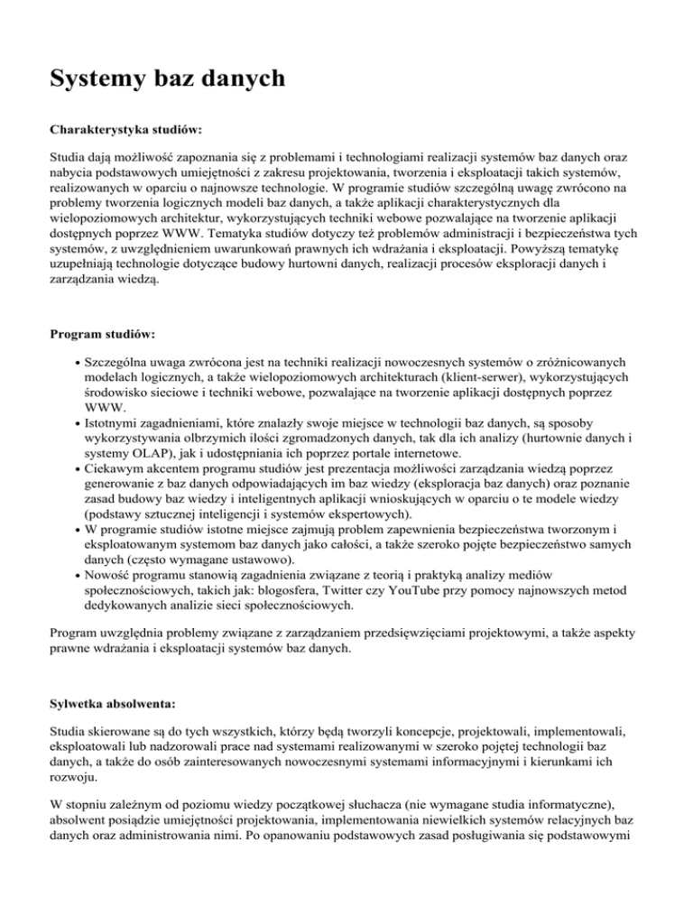 Systemy baz danych Charakterystyka studiów: Studia dają możliwość zapoznania się z problemami i technologiami realizacji systemów baz danych oraz nabycia podstawowych umiejętności z zakresu projektowania, tworzenia i eksploatacji takich systemów, realizowanych w oparciu o najnowsze technologie. W programie studiów szczególną uwagę zwrócono na problemy tworzenia logicznych modeli baz danych, a także aplikacji charakterystycznych dla wielopoziomowych architektur, wykorzystujących techniki webowe pozwalające na tworzenie aplikacji dostępnych poprzez WWW. Tematyka studiów dotyczy też problemów administracji i bezpieczeństwa tych systemów, z uwzględnieniem uwarunkowań prawnych ich wdrażania i eksploatacji. Powyższą tematykę uzupełniają technologie dotyczące budowy hurtowni danych, realizacji procesów eksploracji danych i zarządzania wiedzą. Program studiów: Szczególna uwaga zwrócona jest na techniki realizacji nowoczesnych systemów o zróżnicowanych modelach logicznych, a także wielopoziomowych architekturach (klient-serwer), wykorzystujących środowisko sieciowe i techniki webowe, pozwalające na tworzenie aplikacji dostępnych poprzez WWW. Istotnymi zagadnieniami, które znalazły swoje miejsce w technologii baz danych, są sposoby wykorzystywania olbrzymich ilości zgromadzonych danych, tak dla ich analizy (hurtownie danych i systemy OLAP), jak i udostępniania ich poprzez portale internetowe. Ciekawym akcentem programu studiów jest prezentacja możliwości zarządzania wiedzą poprzez generowanie z baz danych odpowiadających im baz wiedzy (eksploracja baz danych) oraz poznanie zasad budowy baz wiedzy i inteligentnych aplikacji wnioskujących w oparciu o te modele wiedzy (podstawy sztucznej inteligencji i systemów ekspertowych). W programie studiów istotne miejsce zajmują problem zapewnienia bezpieczeństwa tworzonym i eksploatowanym systemom baz danych jako całości, a także szeroko pojęte bezpieczeństwo samych danych (często wymagane ustawowo). Nowość programu stanowią zagadnienia związane z teorią i praktyką analizy mediów społecznościowych, takich jak: blogosfera, Twitter czy YouTube przy pomocy najnowszych metod dedykowanych analizie sieci społecznościowych. Program uwzględnia problemy związane z zarządzaniem przedsięwzięciami projektowymi, a także aspekty prawne wdrażania i eksploatacji systemów baz danych. Sylwetka absolwenta: Studia skierowane są do tych wszystkich, którzy będą tworzyli koncepcje, projektowali, implementowali, eksploatowali lub nadzorowali prace nad systemami realizowanymi w szeroko pojętej technologii baz danych, a także do osób zainteresowanych nowoczesnymi systemami informacyjnymi i kierunkami ich rozwoju. W stopniu zależnym od poziomu wiedzy początkowej słuchacza (nie wymagane studia informatyczne), absolwent posiądzie umiejętności projektowania, implementowania niewielkich systemów relacyjnych baz danych oraz administrowania nimi. Po opanowaniu podstawowych zasad posługiwania się podstawowymi W stopniu zależnym od poziomu wiedzy początkowej słuchacza (nie wymagane studia informatyczne), absolwent posiądzie umiejętności projektowania, implementowania niewielkich systemów relacyjnych baz danych oraz administrowania nimi. Po opanowaniu podstawowych zasad posługiwania się podstawowymi aplikacjami środowiska sieciowego nabędzie on umiejętność korzystania i tworzenia aplikacji baz danych z wykorzystaniem nowoczesnych technologii webowych wykorzystujących środowisko Internetu. Absolwent pozna też zasady tworzenia aplikacji opartych o technologie sztucznej inteligencji w postaci systemów ekspertowych, wykorzystujących bazy wiedzy czy sieci neuronowe. Dodatkowo pozna wiele elementów nowoczesnych technik bazodanowych (modele nierelacyjne, zasady hurtowni danych, podstawy eksploracji danych), czy też technik sieciowych. Dopełnieniem powyższej wiedzy będą elementy szeroko pojętej inżynierii systemów baz danych obejmującej zagadnienia bezpieczeństwa tych systemów, poprawnego nimi administrowania, zarządzania projektami, zarządzania jakością systemów czy wreszcie najistotniejsze zagadnienia prawne związane z procesem tworzenia i eksploatacją tych systemów. Uczestnicy po zaliczeniu wszystkich przedmiotów objętych planem studiów (w formie przewidzianej indywidualnie dla każdego z przedmiotów) uzyskują Świadectwo ukończenia studiów podyplomowych z zakresu Systemów Baz Danych, wystawiane przez Akademię Górniczo-Hutniczą, zgodne z wymogami Ministerstwa Nauki i Szkolnictwa Wyższego. Nabyta wiedza i umiejętności są bardzo dobrą podstawą do dalszych szczegółowych studiów i kursów w tym zakresie, czy podjęcia starań o przystąpienie do wybranych egzaminów certyfikacyjnych, pozwalających uzyskać np. wybrany Europejski Certyfikat Umiejętności Komputerowych – ECDL. Czas trwania: 2 semestry (od X 2016 r. do VI 2017 r.) Termin zgłoszeń: od połowy V 2016 r. do wyczerpania limitu miejsc Wymagane dokumenty: podanie o przyjęcie na studia, kwestionariusz osobowy (dostępny na stronie studiów), odpis dyplomu ukończenia studiów wyższych: I stopnia (inżynierskich) lub II stopnia na kierunkach dających znajomość podstaw technik komputerowych (lub posiadanie tego rodzaju umiejętności wyniesione w oparciu o inne doświadczenia np. zawodowe), I stopnia (licencjackich) na kierunkach informatycznych lub zbliżonych, poświadczenie wniesienia opłaty operacyjnej w wysokości 100 zł dowód osobisty Tryb zgłoszeń: obowiązuje kolejność zgłoszeń (za zgłoszenie uznaje się złożenie wszystkich wymaganych dokumentów – wykaz na stronie www.bazy.agh.edu.pl – oraz dokonanie opłaty operacyjnej) Liczba miejsc: min. 22, maks. 38 Miejsce zgłoszeń: AGH, Wydział Informatyki, Elektroniki i Telekomunikacji ul. Kawiory 21, 30-055 Kraków, pawilon D-17 (Centrum Informatyki), pokój 2.7 Osoba przyjmująca zgłoszenia: Marzanna Kowals