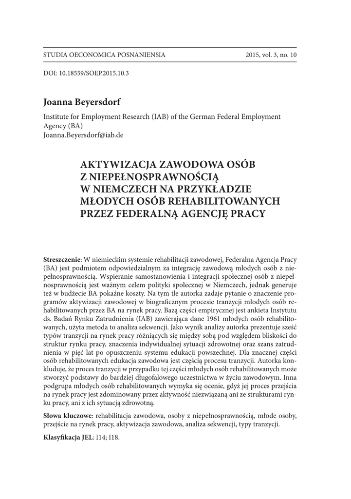 STUDIA OECONOMICA POSNANIENSIA 2015, vol. 3, no. 10 DOI: 10.18559/SOEP.2015.10.3 Joanna Beyersdorf Institute for Employment Research (IAB) of the German Federal Employment Agency (BA) [email protected] Aktywizacja zawodowa osób z niepełnosprawnością w Niemczech na przykładzie młodych osób rehabilitowanych przez Federalną Agencję Pracy Streszczenie: W niemieckim systemie rehabilitacji zawodowej, Federalna Agencja Pracy (BA) jest podmiotem odpowiedzialnym za integrację zawodową młodych osób z niepełnosprawnością. Wspieranie samostanowienia i integracji społecznej osób z niepełnosprawnością jest ważnym celem polityki społecznej w Niemczech, jednak generuje też w budżecie BA pokaźne koszty. Na tym tle autorka zadaje pytanie o znaczenie programów aktywizacji zawodowej w biograficznym procesie tranzycji młodych osób rehabilitowanych przez BA na rynek pracy. Bazą części empirycznej jest ankieta Instytutu ds. Badań Rynku Zatrudnienia (IAB) zawierająca dane 1961 młodych osób rehabilitowanych, użyta metoda to analiza sekwencji. Jako wynik analizy autorka prezentuje sześć typów tranzycji na rynek pracy różniących się między sobą pod względem bliskości do struktur rynku pracy, znaczenia indywidualnej sytuacji zdrowotnej oraz szans zatrudnienia w pięć lat po opuszczeniu systemu edukacji powszechnej. Dla znacznej części osób rehabilitowanych edukacja zawodowa jest częścią procesu tranzycji. Autorka konkluduje, że proces tranzycji w przypadku tej części młodych osób rehabilitowanych może stworzyć podstawy do bardziej długofalowego uczestnictwa w życiu zawodowym. Inna podgrupa młodych osób rehabilitowanych wymyka się ocenie, gdyż jej proces przejścia na rynek pracy jest zdominowany przez aktywność niezwiązaną ani ze strukturami rynku pracy, ani z ich sytuacją zdrowotną. Słowa kluczowe: rehabilitacja zawodowa, osoby z niepełnosprawnością, młode osoby, przejście na rynek pracy, aktywizacja zawodowa, analiza sekwencji, typy tranzycji. Klasyfikacja JEL: I14; I18. Aktywizacja zawodowa osób z niepełnosprawnością w Niemczech45 Professional activation of persons with disabilities in Germany, for example, young people rehabilitated by the Federal Employment Agency Abstract: In the German system of vocational rehabilitation, the Federal Employment Agency (BA) is responsible for the first vocational integration of adolescents with disabilities. Supporting self-determination and social integration of persons with disabilities is an important aim of German social policy, but it also results in considerable expenditure. Against this background, the author investigates the role of vocational activation measures in the process of young rehabilitants’ transition into the labour market. The data base is a survey of the Institute for Employment Research (IAB) of the BA, containing information on 1,961 adolescent rehabilitants. The method used is sequence analysis. The analysis yields six transition types, which differ from each other with respect to labour market attachment, individual health status and employment chances five years after leaving the general educational system. A considerable part of the sequence is characterized by the use of vocational education measures. As the author concludes, the transition process can be seen for this share of young vocational rehabilitants as a foundation for successful longer-term participation in the labour market. Another subgroup of young vocational rehabilitants eludes valuation, for their transition process is dominated by conditions not related to the structures of the labour market, nor to their health. Keywords: vocational rehabilitation, persons with disabilities, adolescents, transition into the labour market, vocational activation, sequence analysis, transition types. 1. Osoby z niepełnosprawnością rehabilitowane przez niemiecką Federalną Agencję Pracy w kontekście systemu rehabilitacji zawodowej w Niemczech Wspieranie samostanowienia i integracji społecznej osób z niepełnosprawnością jako cel polityki społecznej w Niemczech jest skodyfikowany w niemieckim Dziewiątym Kodeksie Prawa Społecznego (SGB IX Rehabilitation und Teilhabe, Rehabilitacja i Uczestnictwo1), który wszedł w życie w roku 2001. Jako że uczestnictwo w życiu zawodowym jest jedną z ważniejszych artykulacji przynależności społecznej, Dziewiąty Kodeks (art. 6 SGB IX) definiuje też rodzaje świadczeń możliwych w ramach rehabilitacji zawodowej oraz podmioty odpowiedzialne za integrację osób z niepełnosprawnością na rynku pracy. Jednym z owych podmiotów jest niemiecka Niemieckie pojęcia fachowe – tłumaczenie własne. 1 46 Joanna Beyersdorf Federalna Agencja Pracy (Bundesagentur für Arbeit, BA)2, która w ramach świadczeń rehabilitacji zawodowej, określonych w Drugim oraz Trzecim Kodeksie Prawa Społecznego ma za zadanie aktywizację bezrobotnych osób niepełnosprawnych, jak też osób zagrożonych utratą pracy ze względu na pogorszenie stanu zdrowia. Przy tym Trzeci Kodeks Prawa Społecznego (SGB III Arbeitsförderung, Promocja Zatrudnienia) obowiązuje w przypadku osób z niepełnosprawnością bezrobotnych lub zagrożonych bezrobociem ze względu na stan zdrowia, które są uprawnione do zasiłku dla krótkotrwale bezrobotnych. Drugi Kodeks Prawa Społecznego (SGB II Grundsicherung für Arbeitssuchende, Minimalny Zasiłek Społeczny dla Osób Szukających Pracy) obowiązuje zaś w przypadku osób z niepełnosprawnością uprawnionych jedynie do pomocy społecznej.3 Instrumenty aktywnej i pasywnej polityki rynku pracy w ramach rehabilitacji zawodowej przeprowadzanej przez BA są więc skonkretyzowane w tych dwóch ustawach. W wyniku wyżej wymienionego podziału osób z zapotrzebowaniem na rehabilitację na różne gałęzie niemieckiego Ubezpieczenia Społecznego, zgodnie z art. 6 SGB IX, przede wszystkim dwie grupy mogą odbyć rehabilitację zawodową w BA: (1) są to młode