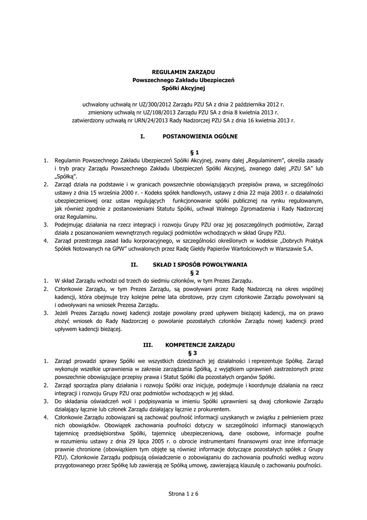 REGULAMIN ZARZĄDU Powszechnego Zakładu Ubezpieczeń Spółki Akcyjnej uchwalony uchwałą nr UZ/300/2012 Zarządu PZU SA z dnia 2 października 2012 r. zmieniony uchwałą nr UZ/108/2013 Zarządu PZU SA z dnia 8 kwietnia 2013 r. zatwierdzony uchwałą nr URN/24/2013 Rady Nadzorczej PZU SA z dnia 16 kwietnia 2013 r. I. 1. 2. 3. 4. POSTANOWIENIA OGÓLNE §1 Regulamin Powszechnego Zakładu Ubezpieczeń Spółki Akcyjnej, zwany dalej „Regulaminem”, określa zasady i tryb pracy Zarządu Powszechnego Zakładu Ubezpieczeń Spółki Akcyjnej, zwanego dalej „PZU SA” lub „Spółką”. Zarząd działa na podstawie i w granicach powszechnie obowiązujących przepisów prawa, w szczególności ustawy z dnia 15 września 2000 r. - Kodeks spółek handlowych, ustawy z dnia 22 maja 2003 r. o działalności ubezpieczeniowej oraz ustaw regulujących funkcjonowanie spółki publicznej na rynku regulowanym, jak również zgodnie z postanowieniami Statutu Spółki, uchwał Walnego Zgromadzenia i Rady Nadzorczej oraz Regulaminu. Podejmując działania na rzecz integracji i rozwoju Grupy PZU oraz jej poszczególnych podmiotów, Zarząd działa z poszanowaniem wewnętrznych regulacji podmiotów wchodzących w skład Grupy PZU. Zarząd przestrzega zasad ładu korporacyjnego, w szczególności określonych w kodeksie „Dobrych Praktyk Spółek Notowanych na GPW” uchwalonych przez Radę Giełdy Papierów Wartościowych w Warszawie S.A. II. 1. 2. 3. SKŁAD I SPOSÓB POWOŁYWANIA §2 W skład Zarządu wchodzi od trzech do siedmiu członków, w tym Prezes Zarządu. Członkowie Zarządu, w tym Prezes Zarządu, są powoływani przez Radę Nadzorczą na okres wspólnej kadencji, która obejmuje trzy kolejne pełne lata obrotowe, przy czym członkowie Zarządu powoływani są i odwoływani na wniosek Prezesa Zarządu. Jeżeli Prezes Zarządu nowej kadencji zostaje powołany przed upływem bieżącej kadencji, ma on prawo złożyć wniosek do Rady Nadzorczej o powołanie pozostałych członków Zarządu nowej kadencji przed upływem kadencji bieżącej. III. 1. 2. 3. 4. KOMPETENCJE ZARZĄDU §3 Zarząd prowadzi sprawy Spółki we wszystkich dziedzinach jej działalności i reprezentuje Spółkę. Zarząd wykonuje wszelkie uprawnienia w zakresie zarządzania Spółką, z wyjątkiem uprawnień zastrzeżonych przez powszechnie obowiązujące przepisy prawa i Statut Spółki dla pozostałych organów Spółki. Zarząd sporządza plany działania i rozwoju Spółki oraz inicjuje, podejmuje i koordynuje działania na rzecz integracji i rozwoju Grupy PZU oraz podmiotów wchodzących w jej skład. Do składania oświadczeń woli i podpisywania w imieniu Spółki uprawnieni są dwaj członkowie Zarządu działający łącznie lub członek Zarządu działający łącznie z prokurentem. Członkowie Zarządu zobowiązani są zachować poufność informacji uzyskanych w związku z pełnieniem przez nich obowiązków. Obowiązek zachowania poufności dotyczy w szczególności informacji stanowiących tajemnicę przedsiębiorstwa Spółki, tajemnicę ubezpieczeniową, dane osobowe, informacje poufne w rozumieniu ustawy z dnia 29 lipca 2005 r. o obrocie instrumentami finansowymi oraz inne informacje prawnie chronione (obowiązkiem tym objęte są również informacje dotyczące pozostałych spółek z Grupy PZU). Członkowie Zarządu podpisują oświadczenie o zobowiązaniu do zachowania poufności według wzoru przygotowanego przez Spółkę lub zawierają ze Spółką umowę, zawierającą klauzulę o zachowaniu poufności. Strona 1 z 6 §4 Uchwały Zarządu wymaga: 1) przyjęcie wieloletniego planu rozwoju i funkcjonowania Spółki; 2) przyjęcie planu działania i rozwoju Grupy PZU; 3) przyjęcie rocznego planu finansowego oraz sprawozdania z jego wykonania; 4) przyjęcie sprawozdań finansowych za ubiegły rok obrotowy oraz sprawozdań Zarządu z działalności Spółki oraz Grupy Kapitałowej PZU SA; 5) przyjęcie wniosku w sprawie podziału zysku lub pokrycia straty; 6) ustalenie taryfy składek ubezpieczeń obowiązkowych i dobrowolnych oraz ogólnych warunków ubezpieczeń dobrowolnych; 7) ustalenie zakresu i rozmiaru reasekuracji biernej oraz zadań w zakresie reasekuracji czynnej; 8) ustalenie zasad (polityki) rachunkowości w Spółce, w tym zakładowego planu kont w części obejmującej wykaz syntetycznych kont księgi głównej oraz stosowane zasady rachunkowości; 9) przyjęcie lub zmiana Regulaminu Zarządu; 10) przyjęcie lub zmiana Regulaminu organizacyjnego PZU SA oraz wprowadzenie zmian organizacyjnych, o których mowa w Regulaminie organizacyjnym PZU SA; 11) przyjęcie lub zmiana innych dokumentów regulujących system organizacyjny Spółki określonych w Regulaminie organizacyjnym PZU SA, a także regulaminów, o których mowa w ustawie z dnia 22 maja 2003 r. o działalności ubezpieczeniowej; 12) tworzenie i znoszenie oddziałów regionalnych oraz oddziałów zagranicznych, o których mowa w § 2 ust. 2 Statutu Spółki; 13) ustalanie zasad doboru kadr oraz powoływanie i odwoływanie osób na stanowiska kierownicze określone w Regulaminie organizacyjnym PZU SA; 14) przyjęcie rocznego planu audytu i kontroli oraz sprawozdania z jego wykonania łącznie z wnioskami; 15) ustalanie zasad działalności lokacyjnej, prewencyjnej i sponsoringowej; 16) podjęcie decyzji w sprawie inwestycji budowlanej w kraju i za granicą, z wyłączeniem remontu i nakładu inwestycyjnego, których łączna wartość nie przekracza kwoty 1.000.000 zł (jeden milion złotych) brutto; 17) nabycie lub zbycie nieruchomości, użytkowania wieczystego lub udziału w nieruchomości lub w użytkowaniu wieczystym; 18) zakup innych środków trwałych o wartości przekraczającej równowartość 250.000 euro (dwieście pięćdziesiąt tysięcy euro) brutto oraz wyrażenie zgody na zawarcie umów, których wartość przekracza limity określone w regulacjach wewnętrznych dotyczących zasad zawierania umów; 19) udzielanie porę