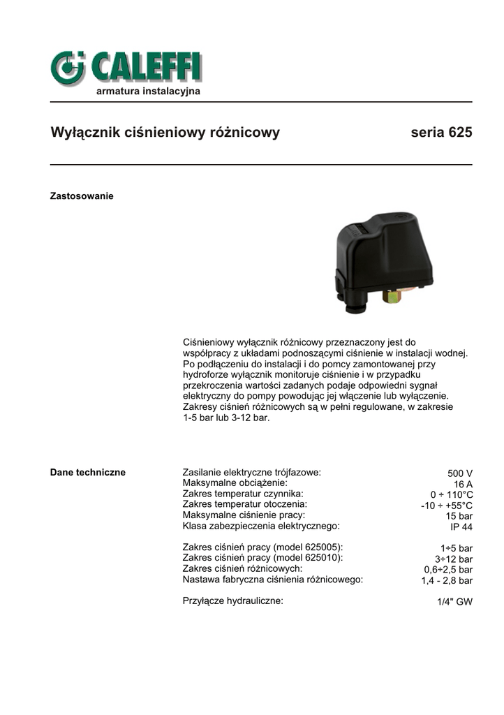 armatura instalacyjna Wy³¹cznik ciœnieniowy ró¿nicowy seria 625 Zastosowanie Ciœnieniowy wy³¹cznik ró¿nicowy przeznaczony jest do wspó³pracy z uk³adami podnosz¹cymi ciœnienie w instalacji wodnej. Po pod³¹czeniu do instalacji i do pomcy zamontowanej przy hydroforze wy³¹cznik monitoruje ciœnienie i w przypadku przekroczenia wartoœci zadanych podaje odpowiedni sygna³ elektryczny do pompy powoduj¹c jej w³¹czenie lub wy³¹czenie. Zakresy ciœnieñ ró¿nicowych s¹ w pe³ni regulowane, w zakresie 1-5 bar lub 3-12 bar. Dane techniczne Zasilanie elektryczne trójfazowe: Maksymalne obci¹¿enie: Zakres temperatur czynnika: Zakres temperatur otoczenia: Maksymalne ciœnienie pracy: Klasa zabezpieczenia elektrycznego: 500 V 16 A 0 ÷ 110°C -10 ÷ +55°C 15 bar IP 44 Zakres ciœnieñ pracy (model 625005): Zakres ciœnieñ pracy (model 625010): Zakres ciœnieñ ró¿nicowych: Nastawa fabryczna ciœnienia ró¿nicowego: 1÷5 bar 3÷12 bar 0,6÷2,5 bar 1,4 - 2,8 bar Przy³¹cze hydrauliczne: 1/4" GW