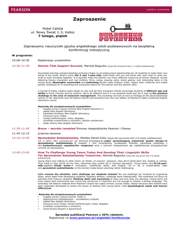 Zaproszenie Hotel Calisia ul. Nowy Świat 1-3, Kalisz 7 lutego, piątek Zapraszamy nauczycieli języka angielskiego szkół podstawowych na bezpłatną konferencję metodyczną W programie: 10:00-10:30 Rejestracja uczestników 10:30-11:30 Stories That Support Success, Mariola Bogucka (sesja dla nauczycieli klas 1-3 szkoły podstawowej) Successful learning-oriented teaching primarily hinges on providing equal opportunities for all students to make their own sense of the world. What’s more, the 6 and 7-year-olds, both those who can and those who can’t read or write yet, need to work smoothly together. It is possible when the teacher has many different resources at his/her disposal: stories featuring Disney characters and real children, films, songs, playing cards, board games, and interesting tasks in the course book. Meaningful, memorable and motivating stories make children smile, inspire their creativity and create perfect conditions for a rewarding and successful lesson for the learner and the teacher alike! A myriad of highly creative tasks based on new and all-time evergreen stories encourage students of different age and ability to think critically and be creative. We’re all different and it is our greatest asset and yet it may be the greatest challenge in the area of classroom management. This workshop will look at how to manage all the abovementioned variety in the classroom and will feature stories and activities from the new edition of Pearson’s highly acclaimed English Adventure course. Materiały dla zarejestrowanych uczestników: • książka ucznia i zeszyt ćwiczeń New English Adventure 1, • plakat New English Adventure, • kalendarz biurkowy New English Adventure, • broszura kursu Today, • teczka konferencyjna, notes, długopis, • certyfikat uczestnictwa w szkoleniu, dyplom szkoleniowy • folder filcowy New English Adventure 11:30-11:45 Brave – secrets revealed filmowa niespodzianka Pearson i Disney 11:45-12:15 przerwa kawowa 12:15-12:45 Sprawdzian Szóstoklasisty, Monika Henel-Celis 12:45-13:45 How To Challenge Young Teens Today And Develop Their Linguistic Skills For Sprawdzian Szóstoklasisty Tomorrow, Mariola Bogucka (sesja dla nauczycieli klas 4-6 szkoły (sesja dla nauczycieli klas 4-6 szkoły podstawowej) Już w 2015 roku uczniowie po raz pierwszy przystąpią do części sprawdzającej znajomość języka obcego na sprawdzianie szóstoklasisty. W związku z tym chcielibysmy przedstawić Państwu najnowszą publikację z serii bestsellerowych repetytoriów Longmana wraz z cennymi wskazówkami jak najefektywniej przygotowywać uczniów do sprawdzianu. podstawowej) Young teens love talking to other teens (in Polish, of course!). However, they don’t particularly like reading or writing. They need to stay active all the time, otherwise they switch off or become disruptive. Young teens vary:9/10-yearolds together, mixed levels of motivation, intellectual ability and English. All in all, a mixed-ability class and sprawdzian szóstoklasisty on the horizon make lesson planning rather challenging. Let’s reverse the situation. Let’s challenge our students instead! We can challenge our students by organising tasks, which apart from developing students’ linguistic abilities, challenge them intellectually. This workshop will focus on activities that improve students’ thinking skills and awareness of what and how they are learning. Young teens will soon realise that memorising new words and structures is important but not enough to master a foreign language. The workshop will feature material from Pearson’s brand new upper primary course Today, whose structure and content have been especially developed to tackle the issues of dealing with young teens: their psychological needs and learner differences. Materiały dla zarejestrowanych uczestników: • książka ucznia i zeszyt ćwiczeń Today 2, • Repetytorium Szóstoklasisty – przykładowy rozdział, • plakat New English Adventure, • broszura kursu Today, teczka konferencyjna, notes, długopis, • certyfikat uczestnictwa w szkoleniu, • torba filcowa Ekspert w Egzaminach Sprzedaż publikacji Pearson z 20% rabatem. Rejestracja na www.pearson.pl/angielski/konferencje