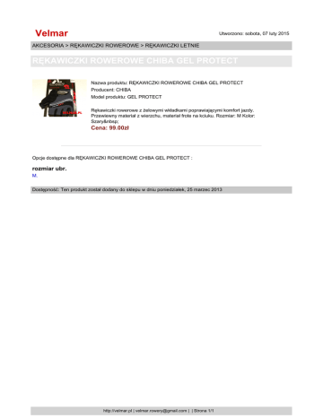Velmar Utworzono: sobota, 07 luty 2015 AKCESORIA > RĘKAWICZKI ROWEROWE > RĘKAWICZKI LETNIE RĘKAWICZKI ROWEROWE CHIBA GEL PROTECT Nazwa produktu: RĘKAWICZKI ROWEROWE CHIBA GEL PROTECT Producent: CHIBA Model produktu: GEL PROTECT Rękawiczki rowerowe z żelowymi wkładkami poprawiającymi komfort jazdy. Przewiewny materiał z wierzchu, materiał frote na kciuku. Rozmiar: M Kolor: Szary Cena: 99.00zł Opcje dostępne dla RĘKAWICZKI ROWEROWE CHIBA GEL PROTECT : rozmiar ubr. M. Dostępność: Ten produkt został dodany do sklepu w dniu poniedziałek, 25 marzec 2013 http://velmar.pl | [email protected] | | Strona 1/1