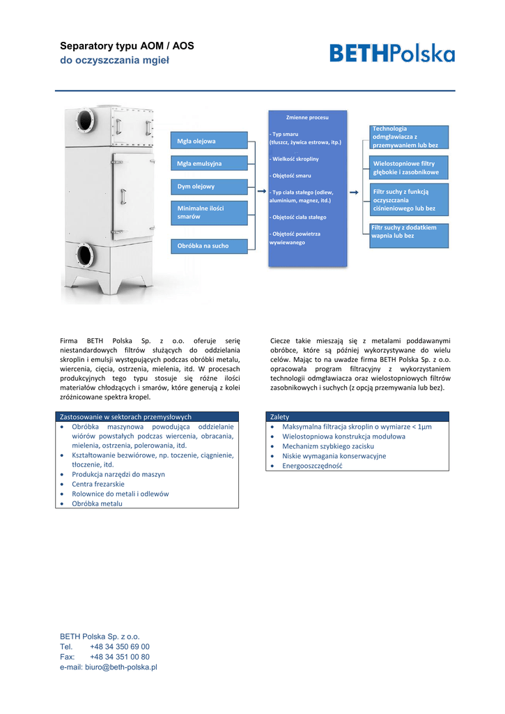 Separatory typu AOM / AOS do oczyszczania mgieł Zmienne procesu Mgła olejowa Mgła emulsyjna - Typ smaru (tłuszcz, żywica estrowa, itp.) - Wielkość skropliny - Objętość smaru Dym olejowy Minimalne ilości smarów Obróbka na sucho - Typ ciała stałego (odlew, aluminium, magnez, itd.) Technologia odmgławiacza z przemywaniem lub bez Wielostopniowe filtry głębokie i zasobnikowe Filtr suchy z funkcją oczyszczania ciśnieniowego lub bez - Objętość ciała stałego - Objętość powietrza wywiewanego Filtr suchy z dodatkiem wapnia lub bez Firma BETH Polska Sp. z o.o. oferuje serię niestandardowych filtrów służących do oddzielania skroplin i emulsji występujących podczas obróbki metalu, wiercenia, cięcia, ostrzenia, mielenia, itd. W procesach produkcyjnych tego typu stosuje się różne ilości materiałów chłodzących i smarów, które generują z kolei zróżnicowane spektra kropel. Ciecze takie mieszają się z metalami poddawanymi obróbce, które są później wykorzystywane do wielu celów. Mając to na uwadze firma BETH Polska Sp. z o.o. opracowała program filtracyjny z wykorzystaniem technologii odmgławiacza oraz wielostopniowych filtrów zasobnikowych i suchych (z opcją przemywania lub bez). Zastosowanie w sektorach przemysłowych Obróbka maszynowa powodująca oddzielanie wiórów powstałych podczas wiercenia, obracania, mielenia, ostrzenia, polerowania, itd. Kształtowanie bezwiórowe, np. toczenie, ciągnienie, tłoczenie, itd. Produkcja narzędzi do maszyn Centra frezarskie Rolownice do metali i odlewów Obróbka metalu Zalety Maksymalna filtracja skroplin o wymiarze < 1µm Wielostopniowa konstrukcja modułowa Mechanizm szybkiego zacisku Niskie wymagania konserwacyjne Energooszczędność BETH Polska Sp. z o.o. Tel. +48 34 350 69 00 Fax: +48 34 351 00 80 e-mail: [email protected] Separatory typu AOM / AOS do oczyszczania mgieł Funkcjonalność technologii filtracyjnych Zastosowanie poszczególnych serii produktu Technologia odmgławiacza Filtr z technologią przechowywania wielostopniowego Gaz nieoczyszczony / obj. cieczy [µg/m3] Filtr z technologią odmgławiacza Jednostopniowe urządzenia do usuwania mgły stosuje się głównie w przypadku dużych spektrów kropel. Dany stopień może być regenerowany, tj. stosowany z opcją przemywania, w zależności od objętości ciała stałego i smaru. Filtr z technologią przechowywania wielostopniowego Filtry tego typu stosuje się do szerokiego zakresu kropli i charakteryzują się bardzo wysokimi oraz stałymi poziomami oddzielania. Specjalne wkładki filtracyjne wyposażone w elementy odwadniające zapewniają długi cykl użytkowania, nawet przy dużych ilościach smarów. Filtr suchy z funkcją oczyszczania ciśnieniowego Filtry suche stosuje się w przypadku gromadzenia się skroplin na ciałach stałych, co blokuje dalsze przedostawanie się skroplin do filtra. Filtry te są wyposażone w kieszenie, które można oczyszczać za pomocą strumieni powietrza pod wysokim ciśnieniem (patrz: seria AAS). Filtr suchy z oczyszczaniem ciśnieniowym Limity eksploatacyjne Typ filtra Filtry do oczyszczania mgieł Filtry zasobnikowe Filtry suche Zawartość cieczy w gazie nieoczyszczonym > 150 mg/m3 < 150 mg/m3 < 10 mg/m3 Zawartość cieczy w gazie oczyszczonym < 20 mg/m3 < 2 mg/m3 < 2 mg/m3 Spektrum kropel Ilość ciał stałych Wielkość cząsteczki > 2 µm > 0,3 µm > 0,3 µm < 1 g/m3 < 1 g/m3 < 100 g/m3 > 2 µm > 0,3 µm > 0,3 µm Mechanizm szybkiego zacisku Bezpieczeństwo Filtry do oddzielania mgły olejowej firmy BETH Polska Sp. z o.o. współpracują z mechanizmem szybkiego zacisku zamontowanym na wkładkach filtracyjnych. Mechanizm stosuje się do zadań złożonych celem zapewnienia bezpiecznej szczelności i uproszczenia czynności konserwacyjnych, wymiany wkładek oraz zminimalizowania związanych z tym kosztów. BETH Polska Sp. z o.o. Tel. +48 34 350 69 00 Fax: +48 34 351 00 80 e-mail: [email protected] Zabezpieczenia, takie jak monitoring objętości powietrza wywiewanego i temperatury, unikanie źródeł zapłonu, stosowanie uziemienia oraz czujników poziomu napełnienia stosuje się w celu zapobiegania atmosferom wybuchowym. W przeciwnym razie istnieje możliwość dostawy urządzeń odpornych na ciśnienie.