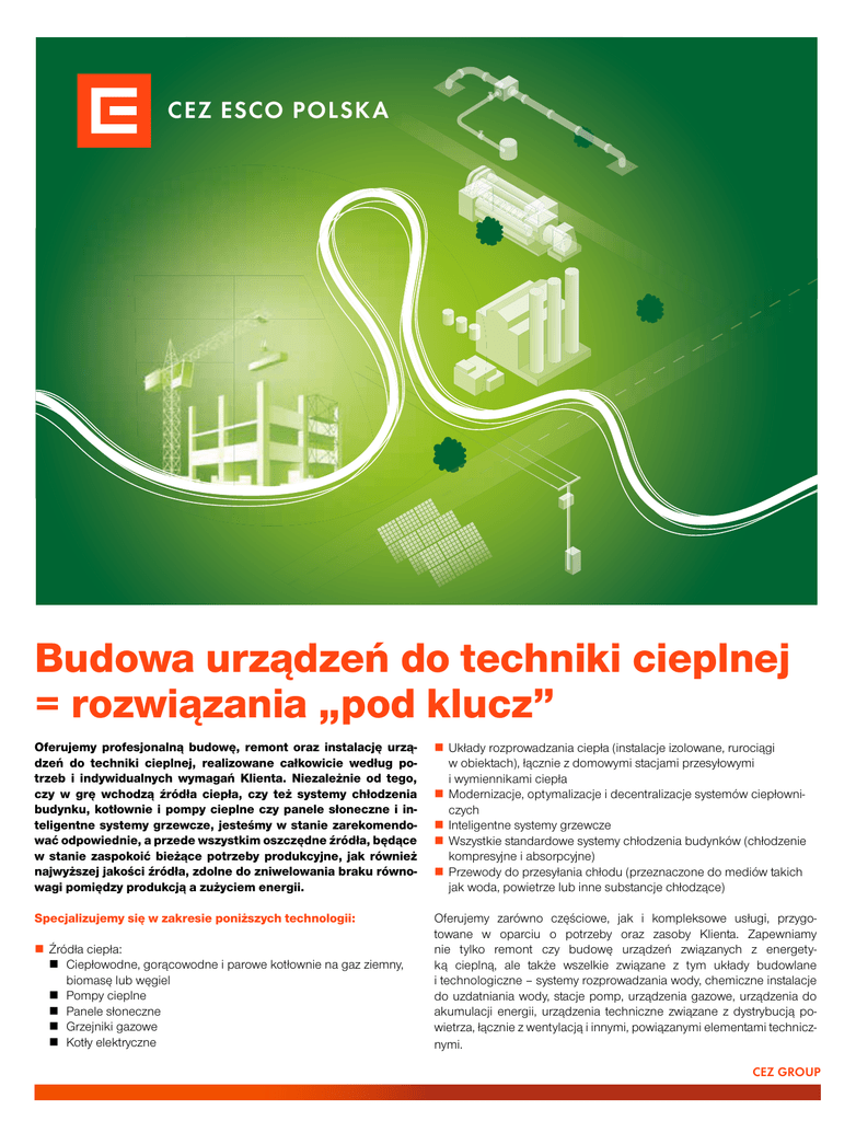 CEZ ESCO POLSK A Budowa urządzeń do techniki cieplnej = rozwiązania „pod klucz” Oferujemy profesjonalną budowę, remont oraz instalację urządzeń do techniki cieplnej, realizowane całkowicie według potrzeb i indywidualnych wymagań Klienta. Niezależnie od tego, czy w grę wchodzą źródła ciepła, czy też systemy chłodzenia budynku, kotłownie i pompy cieplne czy panele słoneczne i inteligentne systemy grzewcze, jesteśmy w stanie zarekomendować odpowiednie, a przede wszystkim oszczędne źródła, będące w stanie zaspokoić bieżące potrzeby produkcyjne, jak również najwyższej jakości źródła, zdolne do zniwelowania braku równowagi pomiędzy produkcją a zużyciem energii. Układy rozprowadzania ciepła (instalacje izolowane, rurociągi w obiektach), łącznie z domowymi stacjami przesyłowymi i wymiennikami ciepła Modernizacje, optymalizacje i decentralizacje systemów ciepłowniczych Inteligentne systemy grzewcze Wszystkie standardowe systemy chłodzenia budynków (chłodzenie kompresyjne i absorpcyjne) Przewody do przesyłania chłodu (przeznaczone do mediów takich jak woda, powietrze lub inne substancje chłodzące) Specjalizujemy się w zakresie poniższych technologii: Oferujemy zarówno częściowe, jak i kompleksowe usługi, przygotowane w oparciu o potrzeby oraz zasoby Klienta. Zapewniamy nie tylko remont czy budowę urządzeń związanych z energetyką cieplną, ale także wszelkie związane z tym układy budowlane i technologiczne – systemy rozprowadzania wody, chemiczne instalacje do uzdatniania wody, stacje pomp, urządzenia gazowe, urządzenia do akumulacji energii, urządzenia techniczne związane z dystrybucją powietrza, łącznie z wentylacją i innymi, powiązanymi elementami technicznymi. Źródła ciepła: Ciepłowodne, gorącowodne i parowe kotłownie na gaz ziemny, biomasę lub węgiel Pompy cieplne Panele słoneczne Grzejniki gazowe Kotły elektryczne CEZ GROUP Oferta „pod klucz” proponowana przez CEZ ESCO Polska: Konsultacje i doradztwo Przeprowadzanie badań/opracowanie koncepcji energetyki cieplnej (ocena aktualnego stanu instalacji, audyt energetyczny, projekt modernizacji, propozycje środków prowadzących do obniżenia kosztów eksploatacji/zagrożeń) Opracowanie dokumentacji projektowej przebudowy lub budowy nowego obiektu Modernizacja lub przebudowa systemu aktualnej energetyki cieplnej Pomoc w uzyskiwaniu atrakcyjnego finansowania, łącznie z dotacjami ze środków zewnętrznych Referencje Budowa gazowej centrali grzewczej w Ciepłowni Mohelnice Przed realizacją inwestycji Ciepłownia Mohelnice przekazywała energię za pomocą rurociągu parowego i rurociągu z gorącą wodą do centralnych parowych i gorącowodnych wymienników ciepła. Dzięki zrealizowaniu gazowej centrali grzewczej, łącznie z przeróbką 32 gorącowodnych, zależnych ciśnienieniowo stacji dostarczania na ciepłowodne, wybudowaniu 43 nowych i niezależnych ciśnieniowo ciepłowodnych DPS oraz zainstalowaniu nowego, izolowanego rurociągu o długości niemal 10 kilometrów, który zastąpił pierwotne instalacje składające się z czterech rur, doszło do zwiększenia wydajności cieplnej kotłów z 78,2% do 95,5% oraz obniżenia strat podczas przesyłania z 64% do 11,2% (stan wyjściowy dotyczy roku 2009, po odłączeniu od systemu centralnego ogrzewania jednego z dużych odbiorców, tuż przed realizacją budowy). Eksploatacja i obsługa urządzeń, łącznie z możliwością zapewnienia dostaw elektryczności Serwis i konserwacja, przeglądy okresowe i kontrole Zapewnianie szkoleń i egzaminowanie personelu obsługującego urządzenia Doświadczenia Zrealizowaliśmy wiele pomyślnie zakończonych inwestycji budowlanych i modernizacji systemów energetyki cieplnej, zarówno w kategorii dużych projektów, jak i mniejszych zleceń, wykonywanych „pod klucz” dla małych i średnich przedsiębiorstw. Korzyści: Wzrost wydajności cieplnej kotłów o 17,3% Obniżenie straty podczas przesyłania o 52,8% Dane podstawowe Czas realizacji: maj – wrzesień 2009 r. Kotły: 2 kotły ciepłowodne K1 i K2 o mocy 5 MW, 1 kocioł parowy K3 o mocy 3,5 MW Instalacje rurociągowe SCZT: długość 9 580 m, średnica 32–250 mm Domowe stacje przekazujące: 75 szt. stacji niezależnych pod względem ciśnienia Kontakt W przypadku zainteresowania ofertą prosimy o kontakt z naszym przedstawicielem handlowym. Wszystkich nowych Klientów uprzejmie prosimy o korzystanie z podanych obok kontaktów. CEZ ESCO Polska sp. z o.o. Al. Jerozolimskie 61, 00-697 Warszawa telefon: +48 22 218 01 41, fax: + 48 22 218 01 40 e-mail: [email protected] www.cezpolska.pl Treści tutaj zawarte nie stanowią oferty handlowej w rozumieniu art. 66 Kodeksu cywilnego, a są jedynie informacją w rozumieniu art. 71 Kodeksu cywilnego. CEZ ESCO Polska sp. z o.o. z siedzibą w Warszawie zastrzega, że wszelkie przedstawione wyżej inwestycje zostały zaprojektowane i wykonane przez spółkę ČEZ ESCO, a.s. z siedzibą w Pradze, w ramach jej działalności. Jednocześnie zastrzega, że żaden fragment niniejszej publikacji nie może być powielany lub rozpowszechniany w jakiejkolwiek formie i w jakikolwiek sposób bez zezwolenia. Wszelkie znaki towarowe, znaki graficzne, nazwy własne, logotypy i inne dane są chronione na podstawie przepisów ustawy o prawie autorskim i prawach pokrewnych, ustawy prawo własności przemysłowej, a także innych ustaw.