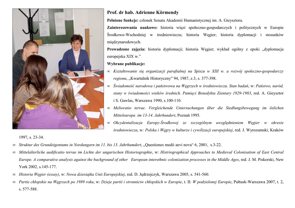 Prof. dr hab. Adrienne Körmendy Pełnione funkcje: członek Senatu Akademii Humanistycznej im. A. Gieysztora. Zainteresowania naukowe: historia więzi społeczno-gospodarczych i politycznych w Europie Środkowo-Wschodniej w średniowieczu; historia Węgier; historia dyplomacji i stosunków międzynarodowych. Prowadzone zajęcia: historia dyplomacji; historia Węgier; wykład ogólny z epoki „dyplomacja europejska XIX w.” Wybrane publikacje: • Kształtowanie się organizacji parafialnej na Spiszu w XIII w. a rozwój społeczno-gospodarczy regionu, „Kwartalnik Historyczny” 94, 1987, z.3, s. 377-398. • Świadomość narodowa i państwowa na Węgrzech w średniowieczu. Stan badań, w: Państwo, naród, stany w świadomości wieków średnich. Pamięci Benedykta Zientary 1929-1983, red. A. Gieysztor i S. Gawlas, Warszawa 1990, s.100-110. • Melioratio terrae. Vergleichende Untersuchungen über die Siedlungsbewegung im öslichen Mitteleuropa im 13-14. Jahrhundert, Poznań 1995. • Okcydentalizacja Europy-Środkowej ze szczególnym uwzględnieniem Węgier w okresie średniowiecza, w: Polska i Węgry w kulturze i cywilizacji europejskiej, red. J. Wyrozumski, Kraków 1997, s. 23-34. • Struktur des Grundeigentums in Nordungarn im 11. bis 13. Jahrhumdert, „Questiones medii aevi nova“ 6, 2001, s.3-22. • Mittelalterliche aedificatio terrae im Lichte der ungarischen Historiographie, w: Histriographical Approaches to Medieval Colonisation of East Central Europe. A comparative analysis against the background of other European interethnic colonization processes in the Middle Ages, red. J. M. Piskorski, New York 2002, s.145-177. • Historia Węgier (essay), w: Nowa dziesiątka Unii Europejskiej, red. D. Jędrzejczyk, Warszawa 2005, s. 541-560. • Partie chłopskie na Węgrzech po 1989 roku, w: Dzieje partii i stronnictw chłopskich w Europie, t. II: W podzielonej Europie, Pułtusk-Warszawa 2007, t. 2, s. 577-588.