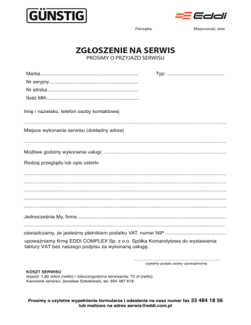 Piecz tka Miejscowo , data ZGŁOSZENIE NA SERWIS PROSIMY O PRZYJAZD SERWISU Marka...................................................................... Typ: ......................................... Nr seryjny................................................................ Nr silnika................................................................. Ilo Mth.................................................................. Imi i nazwisko, telefon osoby kontaktowej ................................................................................................................................................ Miejsce wykonania serwisu (dok adny adres) ................................................................................................................................................ Mo liwe godziny wykonania us ugi: ....................................................................................... Rodzaj przegl du lub opis usterki ................................................................................................................................................ ................................................................................................................................................ ................................................................................................................................................ ................................................................................................................................................ ................................................................................................................................................ Jednocze nie My, firma ......................................................................................................... ............................................................................................................................................... o wiadczamy, e jeste my p atnikiem podatku VAT, numer NIP ........................................... upoważniamy firmę EDDI COMPLEX Sp. z o.o. Spółka Komandytowa do wystawienia faktury VAT bez naszego podpisu za wykonaną usługę. .................................................................................. czytelny podpis osoby upowa nionej KOSZT SERWISU dojazd: 1,50 1,80 z /km (netto) | roboczogodzina serwisanta: 70 z (netto) Kierownik serwisu: Jaros aw Soko owski, tel. 694 487 618 Prosimy o czytelne wype nienie formularza i odes anie na nasz numer fax 33 484 18 56 lub mailowo na adres [email protected]