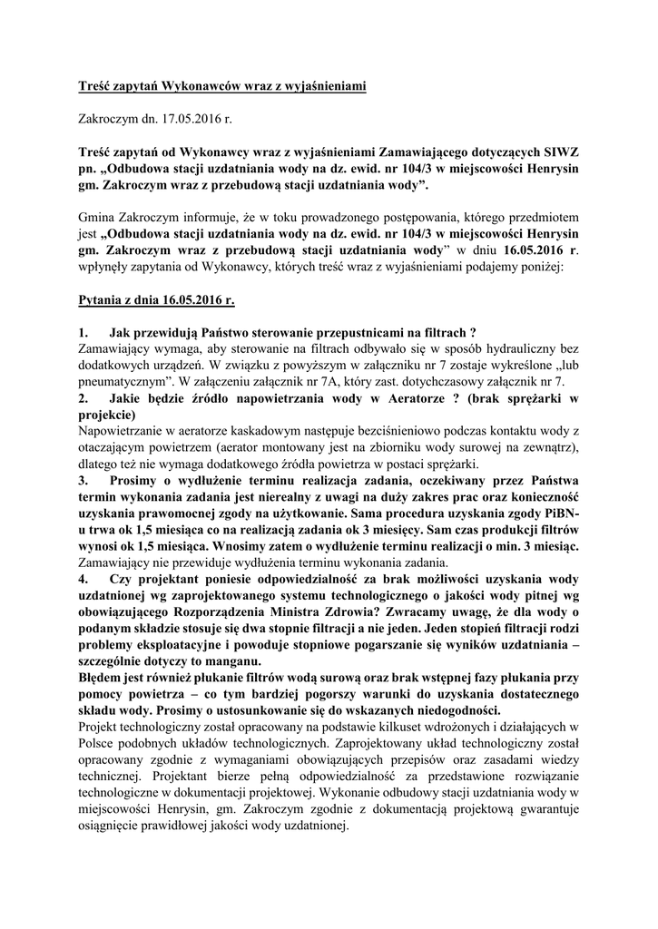 Treść zapytań Wykonawców wraz z wyjaśnieniami Zakroczym dn. 17.05.2016 r. Treść zapytań od Wykonawcy wraz z wyjaśnieniami Zamawiającego dotyczących SIWZ pn. „Odbudowa stacji uzdatniania wody na dz. ewid. nr 104/3 w miejscowości Henrysin gm. Zakroczym wraz z przebudową stacji uzdatniania wody”. Gmina Zakroczym informuje, że w toku prowadzonego postępowania, którego przedmiotem jest „Odbudowa stacji uzdatniania wody na dz. ewid. nr 104/3 w miejscowości Henrysin gm. Zakroczym wraz z przebudową stacji uzdatniania wody” w dniu 16.05.2016 r. wpłynęły zapytania od Wykonawcy, których treść wraz z wyjaśnieniami podajemy poniżej: Pytania z dnia 16.05.2016 r. 1. Jak przewidują Państwo sterowanie przepustnicami na filtrach ? Zamawiający wymaga, aby sterowanie na filtrach odbywało się w sposób hydrauliczny bez dodatkowych urządzeń. W związku z powyższym w załączniku nr 7 zostaje wykreślone „lub pneumatycznym”. W załączeniu załącznik nr 7A, który zast. dotychczasowy załącznik nr 7. 2. Jakie będzie źródło napowietrzania wody w Aeratorze ? (brak sprężarki w projekcie) Napowietrzanie w aeratorze kaskadowym następuje bezciśnieniowo podczas kontaktu wody z otaczającym powietrzem (aerator montowany jest na zbiorniku wody surowej na zewnątrz), dlatego też nie wymaga dodatkowego źródła powietrza w postaci sprężarki. 3. Prosimy o wydłużenie terminu realizacja zadania, oczekiwany przez Państwa termin wykonania zadania jest nierealny z uwagi na duży zakres prac oraz konieczność uzyskania prawomocnej zgody na użytkowanie. Sama procedura uzyskania zgody PiBNu trwa ok 1,5 miesiąca co na realizacją zadania ok 3 miesięcy. Sam czas produkcji filtrów wynosi ok 1,5 miesiąca. Wnosimy zatem o wydłużenie terminu realizacji o min. 3 miesiąc. Zamawiający nie przewiduje wydłużenia terminu wykonania zadania. 4. Czy projektant poniesie odpowiedzialność za brak możliwości uzyskania wody uzdatnionej wg zaprojektowanego systemu technologicznego o jakości wody pitnej wg obowiązującego Rozporządzenia Ministra Zdrowia? Zwracamy uwagę, że dla wody o podanym składzie stosuje się dwa stopnie filtracji a nie jeden. Jeden stopień filtracji rodzi problemy eksploatacyjne i powoduje stopniowe pogarszanie się wyników uzdatniania – szczególnie dotyczy to manganu. Błędem jest również płukanie filtrów wodą surową oraz brak wstępnej fazy płukania przy pomocy powietrza – co tym bardziej pogorszy warunki do uzyskania dostatecznego składu wody. Prosimy o ustosunkowanie się do wskazanych niedogodności. Projekt technologiczny został opracowany na podstawie kilkuset wdrożonych i działających w Polsce podobnych układów technologicznych. Zaprojektowany układ technologiczny został opracowany zgodnie z wymaganiami obowiązujących przepisów oraz zasadami wiedzy technicznej. Projektant bierze pełną odpowiedzialność za przedstawione rozwiązanie technologiczne w dokumentacji projektowej. Wykonanie odbudowy stacji uzdatniania wody w miejscowości Henrysin, gm. Zakroczym zgodnie z dokumentacją projektową gwarantuje osiągnięcie prawidłowej jakości wody uzdatnionej. W związku z powyższym Zamawiający podtrzymuje zapisy projektowe odnośnie technologii uzdatniania wody, tj. jednostopniowej filtracji, płukania filtrów tylko wodą surową bez udziału powietrza. 5. Prosimy o podanie rozwiązania technicznego i projektu konstrukcji aeratora, szczególnie napływu wody do aeratora. Rysunki w projekcie nie wyjaśniają sposobu działania, ani konstrukcji. W jaki sposób aerator będzie zabezpieczony przed przemarzaniem? Czy ma to być wyrób warsztatowy czy fabryczny? Jeśli tak, to prosimy o podanie producenta jako przykładowego. Aerator kaskadowy jest urządzeniem składającym się z trzech tac ociekowych i ostatniej tacy największej zbiorczej. Tace ociekowe i zbiorcza zamontowane są na rurze, która jest zarówno konstrukcją aeratora jaki rurociągiem podającym wodę surową na sam szczyt aeratora do pierwszej najwyżej położonej tacy. Napowietrzanie wody polega na rozbiciu strugi wody na mniejsze części poprzez przelewanie się wody na poszczególne tace z góry na dół. Woda jest napowietrzana powietrzem atmosferycznym otaczającym aerator. Napowietrzona woda trafia z ostatniej tacy do tacy zbiorczej, skąd rurociągiem odpływa do zbiornika wody surowej. Aerator posadowiony jest bezpośrednio na stropie zbiornika, w którym muszą być dwa otwory dla wprowadzenia rurociągu wody surowej do aeratora oraz z tacy zbiorczej do zbiornika wody surowej. Aerator nie posiada żadnej izolacji przed zamarzaniem. W czasie postoju aerator jest opróżniany z wody. Materiał wykonania aeratora: stal nierdzewna AISI 304 (0H18N9). Wymiary aeratora podane są w dokumentacji projektowej. Zamawiający nie jest zobowiązany do wskazywania producentów urządzeń wymaganych w prowadzonym postępowaniu. Jest to zadanie Wykonawcy. 6. W ogłoszeniu i SIWZ Zamawiający podał, że jednym z warunków udziału w postępowaniu jest przesłanie polisy OC na kwotę 2.000.000 zł. Czy w przypadku składania oferty wspólnej przez konsorcjum 2 firm Zamawiający uzna spełniony powyższy warunek jeśli jedna z firm dysponuje polisą na kwotę 1.500.000 zł, a druga ma polisę na kwotę 500.000 zł ? W opisanym powyżej przypadku Zamawiający nie uzna warunku przedstawienia ubezpieczenia za spełniony. W przypadku składania oferty wspólnej warunek wysokości sumy ubezpieczenia zostanie uznany przez Zamawiającego za spełniony, jeżeli spełni go co najmniej jeden z wykonawców składających ofertę wspólną. 7. Czy Zamawiający dopuszcza filtry ciśnieniowe wyposażone w płytę drenażową płaską podtrzymującą złoże filtracyjne, która w dłuższej eksploatacji może ulegać zarywaniu (pękanie spawów i wypadanie dysz)? Zamawiający nie dopuszcza filtrów ciśnieniowych wyposażonych w płytę drenażową płaską. Zamawiając