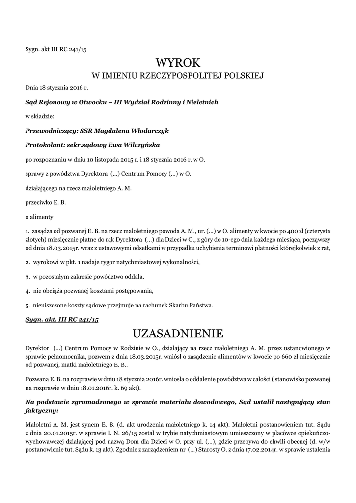 Sygn. akt III RC 241/15 WYROK W IMIENIU RZECZYPOSPOLITEJ POLSKIEJ Dnia 18 stycznia 2016 r. Sąd Rejonowy w Otwocku – III Wydział Rodzinny i Nieletnich w składzie: Przewodniczący: SSR Magdalena Włodarczyk Protokolant: sekr.sądowy Ewa Wilczyńska po rozpoznaniu w dniu 10 listopada 2015 r. i 18 stycznia 2016 r. w O. sprawy z powództwa Dyrektora (...) Centrum Pomocy (...) w O. działającego na rzecz małoletniego A. M. przeciwko E. B. o alimenty 1. zasądza od pozwanej E. B. na rzecz małoletniego powoda A. M., ur. (...) w O. alimenty w kwocie po 400 zł (czterysta złotych) miesięcznie płatne do rąk Dyrektora (...) dla Dzieci w O., z góry do 10-ego dnia każdego miesiąca, począwszy od dnia 18.03.2015r. wraz z ustawowymi odsetkami w przypadku uchybienia terminowi płatności którejkolwiek z rat, 2. wyrokowi w pkt. 1 nadaje rygor natychmiastowej wykonalności, 3. w pozostałym zakresie powództwo oddala, 4. nie obciąża pozwanej kosztami postępowania, 5. nieuiszczone koszty sądowe przejmuje na rachunek Skarbu Państwa. Sygn. akt. III RC 241/15 UZASADNIENIE Dyrektor (...) Centrum Pomocy w Rodzinie w O., działający na rzecz małoletniego A. M. przez ustanowionego w sprawie pełnomocnika, pozwem z dnia 18.03.2015r. wniósł o zasądzenie alimentów w kwocie po 660 zł miesięcznie od pozwanej, matki małoletniego E. B.. Pozwana E. B. na rozprawie w dniu 18 stycznia 2016r. wniosła o oddalenie powództwa w całości ( stanowisko pozwanej na rozprawie w dniu 18.01.2016r. k. 69 akt). Na podstawie zgromadzonego w sprawie materiału dowodowego, Sąd ustalił następujący stan faktyczny: Małoletni A. M. jest synem E. B. (d. akt urodzenia małoletniego k. 14 akt). Małoletni postanowieniem tut. Sądu z dnia 20.01.2015r. w sprawie I. N. 26/15 został w trybie natychmiastowym umieszczony w placówce opiekuńczowychowawczej działającej pod nazwą Dom dla Dzieci w O. przy ul. (...), gdzie przebywa do chwili obecnej (d. w/w postanowienie tut. Sądu k. 13 akt). Zgodnie z zarządzeniem nr (...) Starosty O. z dnia 17.02.2014r. w sprawie ustalenia średnich miesięcznych wydatków przeznaczonych na utrzymanie dziecka w placówkach opiekuńczo-wychowawczych na terenie Powiatu O. w 2014r., środki finansowe przeznaczone na utrzymanie małoletniego A. M. w placówce w której przebywa, w skali miesiąca opiewają na kwotę 4 649, 23 zł. Małoletni ma obecnie lat 17, zatem w skład powyższych wydatków oprócz oczywistych jak wyżywienie, zakup środków czystości, zakup odzieży i obuwia, udział małoletniego w utrzymaniu gospodarstwa domowego (placówki opiekuńczo-wychowawczej) np. opłata mediów, wynagrodzenia wychowawców opiekujących się małoletnim, wchodzą również wydatki z związane z realizowaniem przez dziecko obowiązku szkolnego (min. zakup podręczników), a także drobne środki finansowe ( kieszonkowe ) przeznaczone na realizację przez małoletniego jego drobnych prywatnych wydatków (d. w/w zarządzenie Starosty O. k. 15 akt, Regulamin Organizacyjny placówki opiekuńczo-wychowawczej Domy dla Dzieci w O. k. 16-19 akt). Pozwana E. B. pozostaje w związku małżeńskim z T. B.. Wraz z mężem oraz dwójką małoletnich dzieci (5 i 14 lat) zamieszkuje w O. w lokalu komunalnym. Mąż pozwanej prowadzi działalność gospodarczą, jednakże nie uzyskuje z niej obecnie dochodu. Podejmuje się jedynie prac dorywczych w sklepie złotniczym będącym własnością jego siostry, z których uzyskuje dochód w wysokości ok. 500 zł miesięcznie. Matka małoletniego jest aktywna zawodowo, zatrudniona jest na podstawie umowy o pracę na czas określony do dnia 07.10.2017r. na stanowisku sprzedawcy w sklepie spożywczym z wynagrodzeniem miesięcznym w wysokości 1 084, 11 zł netto (które to obciążone jest z tytułu egzekucji komorniczej za zaległe opłaty za prąd). Ponadto otrzymuje zasiłek rodziny z ośrodka pomocy społecznej w łącznej kwocie 390 zł miesięcznie, a także alimenty na syna D., zamieszkującego wraz z nią w wysokości 300 zł miesięcznie. Koszty utrzymania gospodarstwa domowego oraz rodziny w niej zamieszkującej pozwana określiła na kwotę ok. 1 400 zł miesięcznie w tym min.: opłata czynszu, opłata mediów, koszty związane z ogrzewaniem mieszkania, opłata telefonu komórkowego, zakup żywności, zakup środków higienicznych czy zakup odzieży. Rodzina posiada samochód marki R. (...), poza tym nie posiada majątku w postaci nieruchomości lub wartościowych ruchomości, nie posiada również żadnych obciążeń kredytowych oraz oszczędności. Pozwana w miarę swoich możliwości stara się mieć udział w życiu małoletniego syna A., poprzez osobiste kontakty z nim oraz sporadyczne przekazywanie drobnych kwot pieniężnych na jego osobiste wydatki rzędu 20, 30 zł (d. zaświadczenie o zatrudnieniu i zarobkach pozwanej k. 67 akt, zeznania pozwanej k. 70-71 akt, zeznania świadka T. B. k.71 akt). Sąd zważył co następuje: Zgodnie z dyspozycją art. 133 § 1 kro rodzice obowiązani są do świadczeń alimentacyjnych względem dziecka, które nie jest jeszcze w stanie utrzymać się samodzielnie. Niezdolne do samodzielnego utrzymania się dzieci mają prawo do równej stopy życiowej z rodzicami, którzy obowiązani są podzielić się z nimi nawet bardzo skromnymi dochodami. Zaspokojenie przez rodziców potrzeb dzieci powinno – w razie konieczności – nastąpić nawet kosztem substancji ich majątku. Dlatego też, co do zasady, powództwo jest słuszne. Małoletni A. M. ma lat 17, nie jest w stanie utrzymać się samodzielnie, kontynuuje edukację szkolną, pozostaje bez pracy zarobkowej. Od stycznia 2015r. do chwili obecnej całkowity koszt utrzymania małoletniego, pokrywany jest ze środków finansowych, które placówka opiekuńczowychowawcza, gdzie przebywa małoletni, otrzymuje na pokrycie tychże kosztów, w myśl art. 196 Ustawy z dnia 9 czerwca 2011r. o wspieraniu rodziny i systemie pieczy zastępczej. Zgodnie z zarządze
