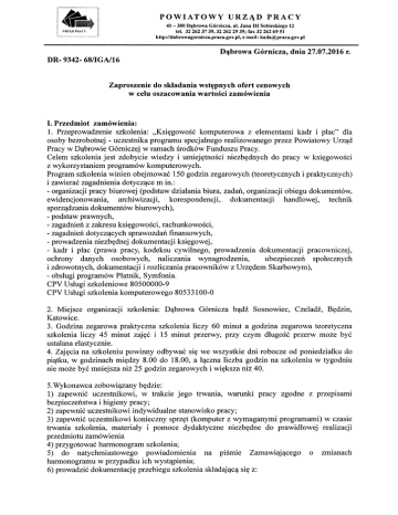 POWIATOWY URZĄD PRACY 41 - 300 Dąbrowa Górnicza, ul. Jana III Sobieskiego 12 tel. 32 262 37 39,32 262 29 39; fax 32 262 69 51 http://dabrowagornicza.praca.gov.pl, e-mail: [email protected] Dąbrowa Górnicza, dnia 27.07.2016 r. DR- 9342- 68/IGA/16 Zaproszenie do składania wstępnych ofert cenowych w celu oszacowania wartości zamówienia I. Przedmiot zamówienia: 1. Przeprowadzenie szkolenia: „Księgowość komputerowa z elementami kadr i płac” dla osoby bezrobotnej - uczestnika programu specjalnego realizowanego przez Powiatowy Urząd Pracy w Dąbrowie Górniczej w ramach środków Funduszu Pracy. Celem szkolenia jest zdobycie wiedzy i umiejętności niezbędnych do pracy w księgowości z wykorzystaniem programów komputerowych. Program szkolenia winien obejmować 150 godzin zegarowych (teoretycznych i praktycznych) i zawierać zagadnienia dotyczące m in.: - organizacji pracy biurowej (podstaw działania biura, zadań, organizacji obiegu dokumentów, ewidencjonowania, archiwizacji, korespondencji, dokumentacji handlowej, technik sporządzania dokumentów biurowych), - podstaw prawnych, - zagadnień z zakresu księgowości, rachunkowości, - zagadnień dotyczących sprawozdań finansowych, - prowadzenia niezbędnej dokumentacji księgowej, - kadr i płac (prawa pracy, kodeksu cywilnego, prowadzenia dokumentacji pracowniczej, ochrony danych osobowych, naliczania wynagrodzenia, ubezpieczeń społecznych i zdrowotnych, dokumentacji i rozliczania pracowników z Urzędem Skarbowym), - obsługi programów Płatnik, Symfonia. CPV Usługi szkoleniowe 80500000-9 CPV Usługi szkolenia komputerowego 80533100-0 2. Miejsce organizacji szkolenia: Dąbrowa Górnicza bądź Sosnowiec, Czeladź, Będzin, Katowice. 3. Godzina zegarowa praktyczna szkolenia liczy 60 minut a godzina zegarowa teoretyczna szkolenia liczy 45 minut zajęć i 15 minut przerwy, przy czym długość przerw może być ustalana elastycznie. 4. Zajęcia na szkoleniu powinny odbywać się we wszystkie dni robocze od poniedziałku do piątku, w godzinach między 8.00 do 18.00, a łączna liczba godzin na szkoleniu w tygodniu nie może być mniejsza niż 25 godzin zegarowych i większa niż 40. 5. Wykonawca zobowiązany będzie: 1) zapewnić uczestnikowi, w trakcie jego trwania, warunki pracy zgodne z przepisami bezpieczeństwa i higieny pracy; 2) zapewnić uczestnikowi indywidualne stanowisko pracy; 3) zapewnić uczestnikowi konieczny sprzęt (komputer z wymaganymi programami) w czasie trwania szkolenia, materiały i pomoce dydaktyczne niezbędne do prawidłowej realizacji przedmiotu zamówienia 4) przygotować harmonogram szkolenia; 5) do natychmiastowego powiadomienia na piśmie Zamawiającego o zmianach harmonogramu w przypadku ich wystąpienia; 6) prowadzić dokumentację przebiegu szkolenia składającą się z: a) dziennika zajęć edukacyjnych zawierającego tematy i wymiar godzin zajęć edukacyjnych oraz listę obecności zawierającą: imię, nazwisko i podpisy uczestnika szkolenia, b) protokołu i kart ocen z okresowych sprawdzianów efektów kształcenia oraz egzaminu końcowego, jeżeli zostały przeprowadzone, c) rejestru wydanych zaświadczeń lub innych dokumentów potwierdzających ukończenie szkolenia i uzyskanie umiejętności lub kwalifikacji, zawierającego numer, imię i nazwisko oraz numer PESEL uczestnika szkolenia; 7) wystawić uczestnikowi dokument/y potwierdzaj ący/e ukończenie szkolenia. Dokument potwierdzający ukończenie szkolenia i uzyskanie kwalifikacji, zgodny z wymogami zawartymi w Rozporządzeniu Ministra Pracy i Polityki Społecznej z dnia 14.05.2014 r. w sprawie szczegółowych warunków realizacji oraz trybu i sposobów prowadzenia usług rynku pracy i zawierać: numer z rejestru, imię i nazwisko PESEL uczestnika szkolenia, nazwę instytucji szkoleniowej przeprowadzającej szkolenie, formę i nazwę szkolenia, okres trwania szkolenia, miejsce i datę wydanie zaświadczenia, tematy i wymiar zajęć edukacyjnych, podpis osoby upoważnionej przez instytucję szkoleniową przeprowadzającą szkolenie. W przypadku wydania zaświadczenia o ukończeniu kursu, określonego w Rozporządzeniu Ministra Edukacji Narodowej z dnia 11 lutego 2012 r. w sprawie kształcenia ustawicznego w formach pozaszkolnych, konieczne jest załączenie suplementu zawierającego informacje dotyczące: okresu trwania szkolenia, tematyki i wymiaru godzin zajęć edukacyjnych oraz numeru z rejestru zaświadczenia, do którego suplement jest dodatkiem, wraz z podpisem osoby upoważnionej przez instytucję szkoleniową, 8) do indywidualizacji procesu szkolenia poprzez prowadzenie systematycznej oceny postępów uczestnika i udzielania mu pomocy jeśli okaże się potrzebna z uwagi na trudności w nauce; 9) dostarczyć do Zamawiającego listy obecności uczestnika szkolenia w terminie do 4 - go dnia każdego następnego miesiąca; 10) przekazać potwierdzenie uczestnictwa w szkoleniu na dokumencie zwanym imiennym wykazem osób, w ciągu 2 dni od daty jego rozpoczęcia; 11) na bieżąco (max w ciągu 2 dni) informować Zamawiającego o: a) rezygnacji z uczestnictwa w szkoleniu w trakcie jego trwania, b) nieobecności na zajęciach szkoleniowych, c) wszelkich problemach związanych z realizacją zamówienia; 12) sporządzić kartę wypadku zawierającą opis okoliczności i przyczyny wypadku w przypadku jego zaistnienia oraz niezwłocznie przekazać ww. kartę Zamawiającemu; 13) do wyznaczenia osoby - z ramienia instytucji szkoleniowej, odpowiedzialnej za organizację szkolenia, wskazaną imiennie w ofercie, zapewniającą nadzór wewnętrzny służący podnoszeniu jakości szkolenia; 14) dokładnie dokumentować wydatki związane ze szkoleniem; 15) ubezpieczyć od następstw nieszczęśliwych wypadków uczestnika szkolenia jeżeli w trakcie szkolenia podejmie zatrudnienie, inną pracę zarobkową lub działalność gospodarczą, od dnia podjęcia zatrudnienia, innej pracy zarobkowej lub działalności gospodarczej do dni